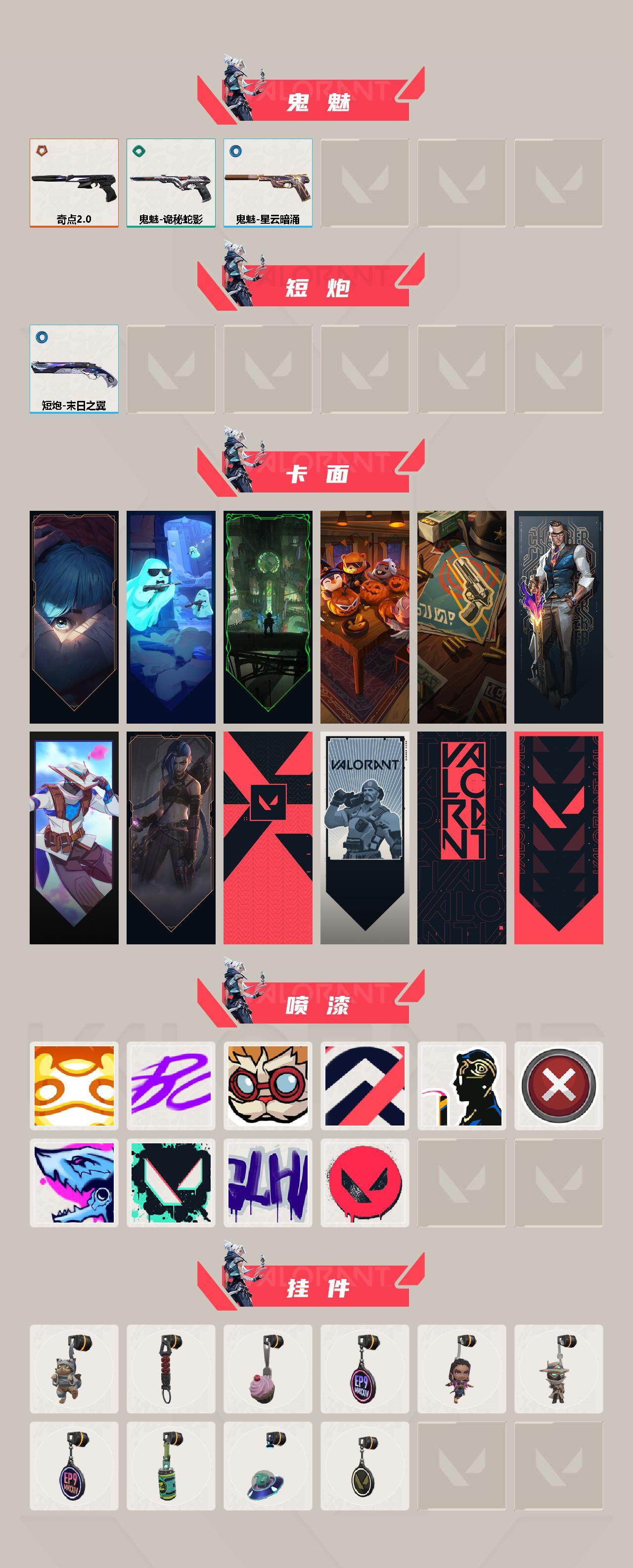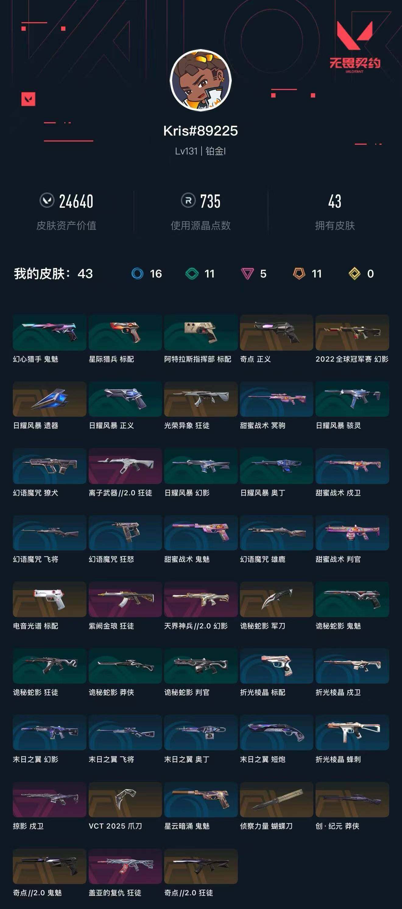 [16021543]【套装】:vct 2025 赛季套装 【英雄】:幻棱,炼狱,维斯,暮蝶,钛狐,壹决,铁臂,捷风,雷兹,幽影,不死鸟,贤者,猎枭,蝰蛇,零,芮娜,奇乐,尚勃勒,霓虹,斯凯,夜露,星礈,k/o,海神,盖可,黑梦,钢锁 【近战武器】:近战武器-侦察力量 蝴蝶刀,近战武器-vct 2025 爪刀,近战武器-诡秘蛇影 军刀,近战武器-日耀风暴 遗器 【狂徒】:狂徒-奇点//2.0,狂徒-光荣异象,狂徒-盖亚的复仇,狂徒-紫阙金琅,狂徒-离子武器//2.0,狂徒-诡秘蛇影 【幻影】:幻影-2022全球冠军赛,幻影-天界神兵//2.0,幻影-末日之翼 【戍卫】:戍卫-掠影,戍卫-折光棱晶 【飞将】:飞将-末日之翼 【莽侠】:莽侠-创·纪元,莽侠-诡秘蛇影 【奥丁】:奥丁-末日之翼 【判官】:判官-诡秘蛇影 【蜂刺】:蜂刺-折光棱晶 【标配】:标配-电音光谱,标配-折光棱晶,标配-电音光谱 【正义】:正义-奇点 【鬼魅】:鬼魅-奇点//2.0,鬼魅-诡秘蛇影,鬼魅-星云暗涌 【短炮】:短炮-末日之翼 【卡面】:《双城之战》拥抱 卡面,精灵大战 卡面,欢迎来到底城 卡面,南瓜盛典 卡面,正义的化身 卡面,无畏契约:尚勃勒 卡面,无畏契约go!第一卷:零 卡面,《双城之战》金克丝 卡面,代号红色 卡面,新兵报到 卡面,v契约 卡面,无畏契约 卡面 【喷漆】:嗨宝南瓜灯 喷漆,嘭! 喷漆,都算到了 喷漆,控场勿近 喷漆,致命优雅 喷漆,买装还是存钱 喷漆,暴走萝莉 喷漆,胜利属于无畏契约 喷漆,glhf 喷漆,无畏契约 喷漆 【挂饰】:猫猫木乃伊 挂饰,伞绳 挂饰,《双城之战》小蛋糕 挂饰,第九季//第三幕 纪念币 挂饰,无畏契约go!第一卷 芮娜 挂饰,无畏契约go!第一卷 零 挂饰,第九季//第二幕 纪念币 挂饰,z世代特饮 挂饰,天外飞客 挂饰,无畏契约 纪念币 挂饰