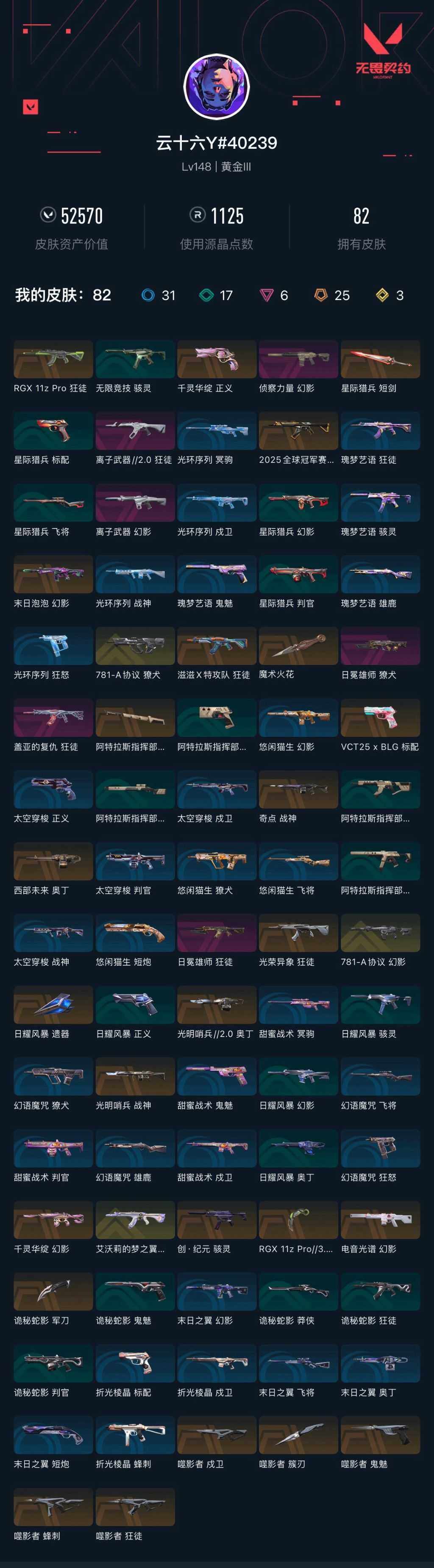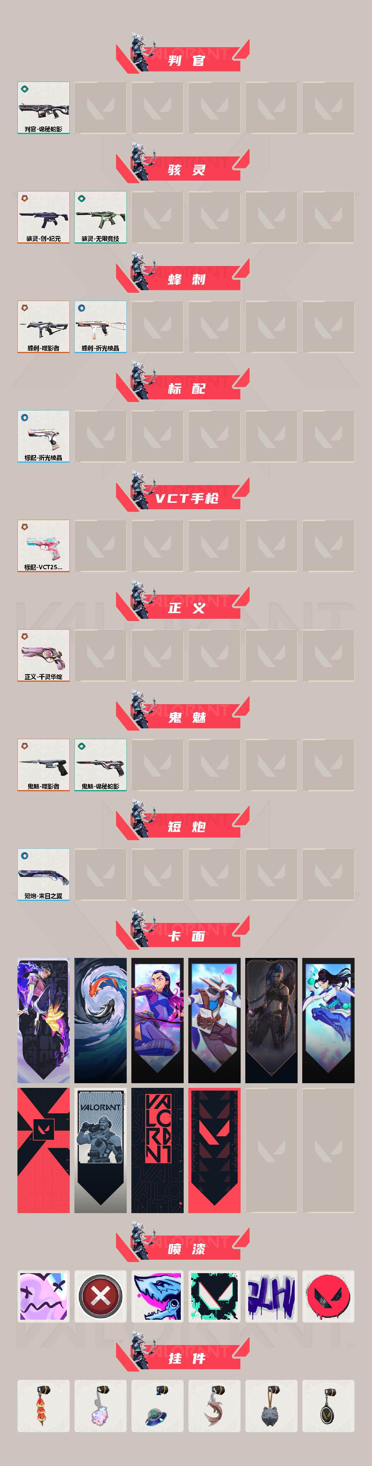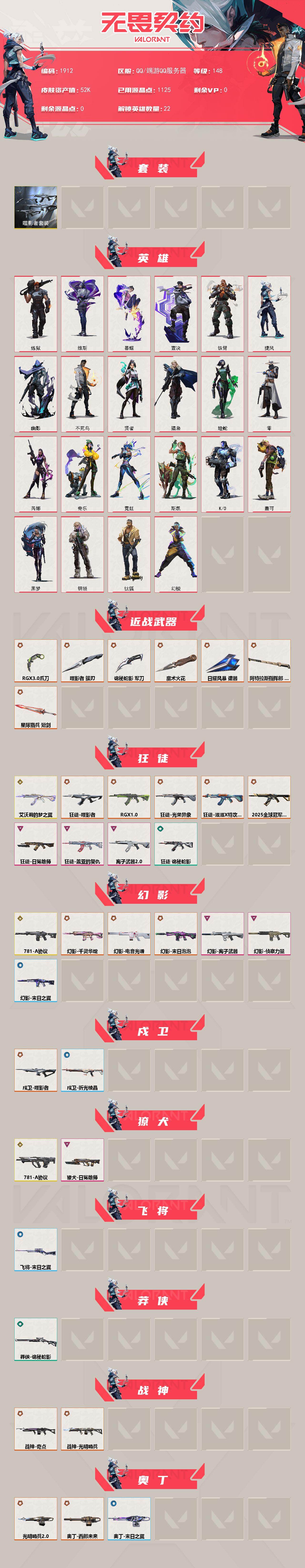 [16021671]【套装】:噬影者套装 【英雄】:幻棱,炼狱,维斯,暮蝶,钛狐,壹决,铁臂,捷风,幽影,不死鸟,贤者,猎枭,蝰蛇,零,芮娜,奇乐,霓虹,斯凯,k/o,盖可,黑梦,钢锁 【近战武器】:近战武器-魔术火花,近战武器-rgx 11z pro//3.0 爪刀,近战武器-噬影者 簇刃,近战武器-诡秘蛇影 军刀,近战武器-日耀风暴 遗器,近战武器-阿特拉斯指挥部 甩棍,近战武器-星际猎兵 短剑,近战武器-魔术火花 【狂徒】:狂徒-艾沃莉的梦之翼,狂徒-2025全球冠军赛,狂徒-噬影者,狂徒-rgx 11z pro,狂徒-光荣异象,狂徒-滋滋x特攻队,狂徒-盖亚的复仇,狂徒-日冕雄师,狂徒-离子武器//2.0,狂徒-诡秘蛇影 【幻影】:幻影-781-a协议,幻影-千灵华绽,幻影-电音光谱,幻影-末日泡泡,幻影-离子武器,幻影-侦察力量,幻影-末日之翼,幻影-电音光谱 【戍卫】:戍卫-噬影者,戍卫-折光棱晶 【獠犬】:獠犬-781-a协议,獠犬-日冕雄师 【飞将】:飞将-末日之翼 【莽侠】:莽侠-诡秘蛇影 【战神】:战神-光明哨兵,战神-奇点 【奥丁】:奥丁-光明哨兵//2.0,奥丁-西部未来,奥丁-末日之翼 【判官】:判官-诡秘蛇影 【骇灵】:骇灵-创·纪元,骇灵-无限竞技 【蜂刺】:蜂刺-噬影者,蜂刺-折光棱晶 【标配】:标配-折光棱晶 【vct手呛】:标配-vct25 x blg 【正义】:正义-千灵华绽 【鬼魅】:鬼魅-噬影者,鬼魅-诡秘蛇影 【短炮】:短炮-末日之翼 【卡面】:无畏契约:暮蝶 卡面,红鳞松叶 卡面,无畏契约go!第一卷:芮娜 卡面,无畏契约go!第一卷:零 卡面,《双城之战》金克丝 卡面,无畏契约go!第一卷:贤者 卡面,代号红色 卡面,新兵报到 卡面,v契约 卡面,无畏契约 卡面 【喷漆】:伤心心 喷漆,买装还是存钱 喷漆,暴走萝莉 喷漆,胜利属于无畏契约 喷漆,glhf 喷漆,无畏契约 喷漆 【挂饰】:糖葫芦 挂饰,超能偶像 挂饰,天外飞客 挂饰,红鳞松叶 挂饰,《双城之战》魄罗 挂饰,无畏契约 纪念币 挂饰