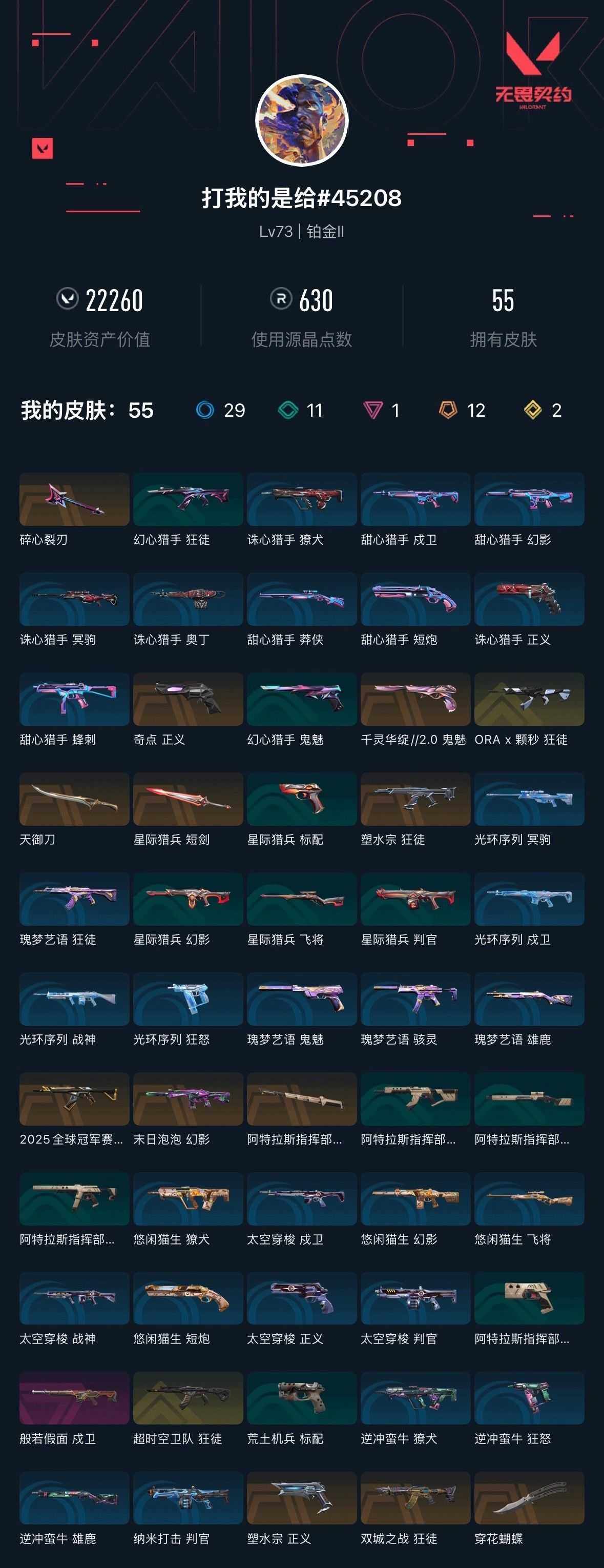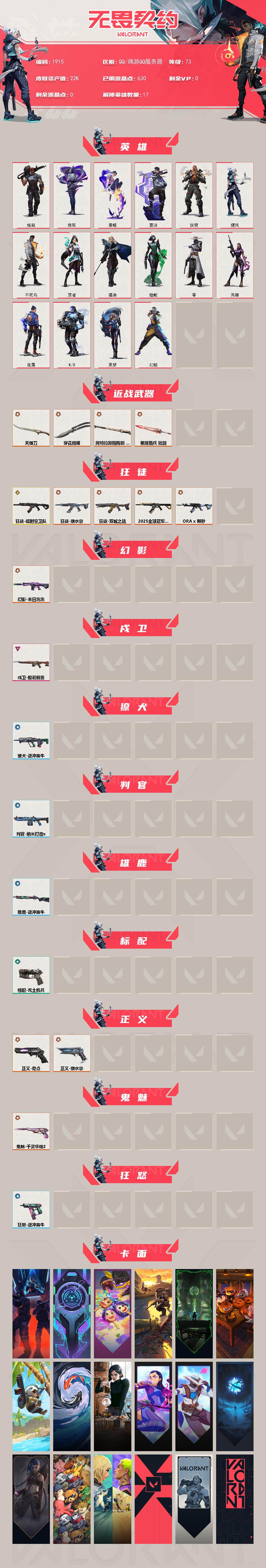 [16021696]【英雄】:幻棱,炼狱,维斯,暮蝶,壹决,铁臂,捷风,不死鸟,贤者,猎枭,蝰蛇,零,芮娜,夜露,k/o,黑梦 【近战武器】:近战武器-穿花蝴蝶,近战武器-天御刀,近战武器-阿特拉斯指挥部 甩棍,近战武器-星际猎兵 短剑 【狂徒】:狂徒-超时空卫队,狂徒-2025全球冠军赛,狂徒-双城之战,狂徒-塑水宗,狂徒-a x 颗秒 【幻影】:幻影-末日泡泡 【戍卫】:戍卫-般若假面 【獠犬】:獠犬-逆冲蛮牛 【判官】:判官-纳米打击x 【雄鹿】:雄鹿-逆冲蛮牛 【标配】:标配-荒土机兵 【正义】:正义-奇点,正义-塑水宗 【鬼魅】:鬼魅-千灵华绽//2.0 【狂怒】:狂怒-逆冲蛮牛 【卡面】:纳米打击 卡面,抑制技术 卡面,瓦娃脸雪糕 p2 卡面,荒土机兵 卡面,欢迎来到底城 卡面,南瓜盛典 卡面,树懒大作战 卡面,红鳞松叶 卡面,虹吸式咖啡壶 卡面,无畏契约go!第一卷:芮娜 卡面,无畏契约go!第一卷:零 卡面,无垠星环 卡面,《双城之战》金克丝 卡面,同步耍酷 卡面,钢锁vs盖可 卡面,代号红色 卡面,新兵报到 卡面,v契约 卡面,无畏契约 卡面 【喷漆】:纳米打击 喷漆,独守蝰腹 喷漆,通缉:战术企鹅 喷漆,荒土机兵 喷漆,都算到了 喷漆,蛋糕还是爆能器? 喷漆,买装还是存钱 喷漆,关门放狗 喷漆,放下武器 喷漆,胜利属于无畏契约 喷漆,glhf 喷漆,无畏契约 喷漆 【挂饰】:水壶 挂饰,纳米打击 挂饰,第九季//第三幕 纪念币 挂饰,z世代特饮 挂饰,动力机箱 挂饰,天外飞客 挂饰,海豹的认可 挂饰,无畏契约 纪念币 挂饰