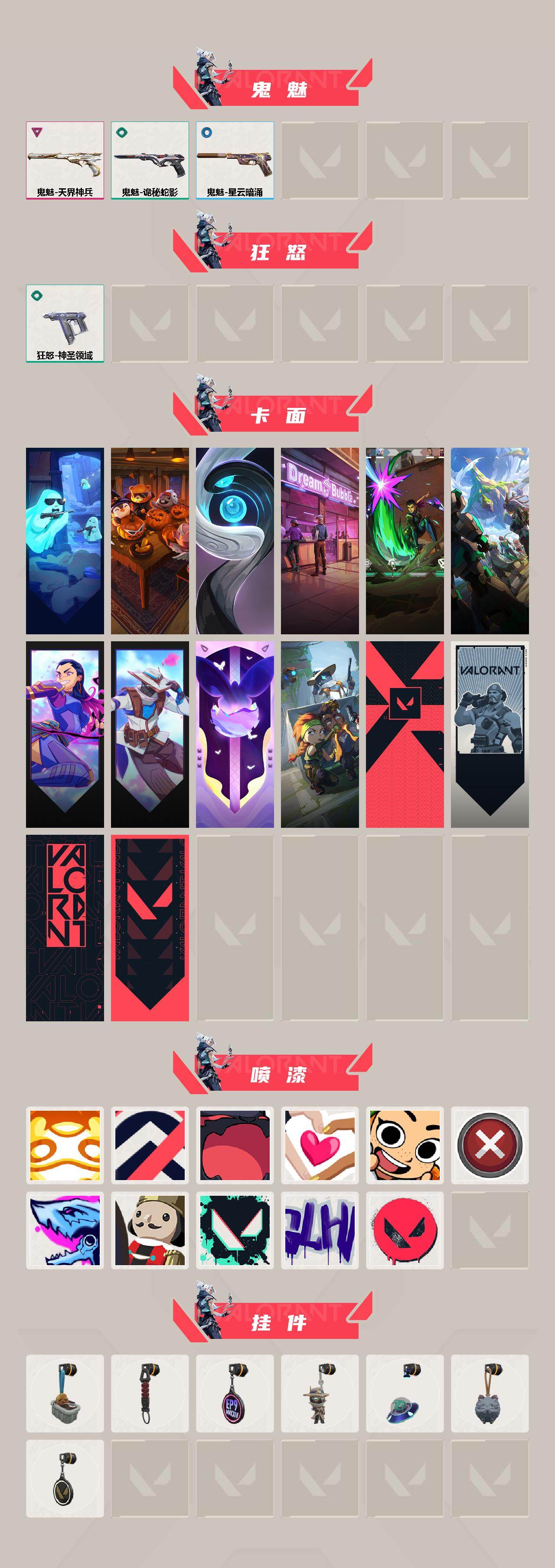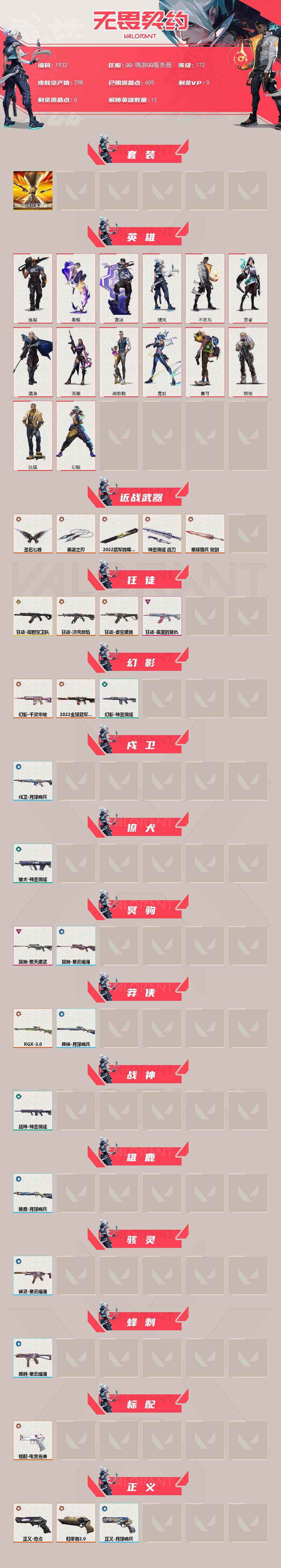 [16021726]【套装】:2022全球冠军赛套装 【英雄】:幻棱,炼狱,暮蝶,钛狐,壹决,捷风,不死鸟,贤者,猎枭,芮娜,尚勃勒,霓虹,盖可,钢锁 【近战武器】:近战武器-2022全球冠军赛 蝴蝶刀,近战武器-黑波之刃,近战武器-圣石匕首,近战武器-神圣领域 战刀,近战武器-星际猎兵 短剑 【狂徒】:狂徒-超时空卫队,狂徒-洪荒怒焰,狂徒-虚空遗器,狂徒-盖亚的复仇 【幻影】:幻影-2022全球冠军赛,幻影-千灵华绽,幻影-神圣领域 【戍卫】:戍卫-月球哨兵 【獠犬】:獠犬-神圣领域 【冥驹】:冥驹-堕天遗武,冥驹-星云暗涌 【莽侠】:莽侠-rgx 11z pro//3.0,莽侠-月球哨兵 【战神】:战神-神圣领域 【雄鹿】:雄鹿-月球哨兵 【骇灵】:骇灵-星云暗涌 【蜂刺】:蜂刺-星云暗涌 【标配】:标配-电音光谱,标配-电音光谱 【正义】:正义-归零者//2.0,正义-奇点,正义-月球哨兵 【鬼魅】:鬼魅-天界神兵,鬼魅-诡秘蛇影,鬼魅-星云暗涌 【狂怒】:狂怒-神圣领域 【卡面】:精灵大战 卡面,南瓜盛典 卡面,聚合之力 卡面,梦幻奶茶 卡面,源能反应 卡面,流星兵团 卡面,无畏契约go!第一卷:芮娜 卡面,无畏契约go!第一卷:零 卡面,化茧成蝶 卡面,别冒尖 卡面,代号红色 卡面,新兵报到 卡面,v契约 卡面,无畏契约 卡面 【喷漆】:嗨宝南瓜灯 喷漆,控场勿近 喷漆,黯兽卖萌 喷漆,双人比心 喷漆,要喝完噢! 喷漆,买装还是存钱 喷漆,暴走萝莉 喷漆,胡桃狂想 喷漆,胜利属于无畏契约 喷漆,glhf 喷漆,无畏契约 喷漆 【挂饰】:悠闲鸡块 挂饰,伞绳 挂饰,第九季//第三幕 纪念币 挂饰,无畏契约go!第一卷 零 挂饰,天外飞客 挂饰,《双城之战》魄罗 挂饰,无畏契约 纪念币 挂饰