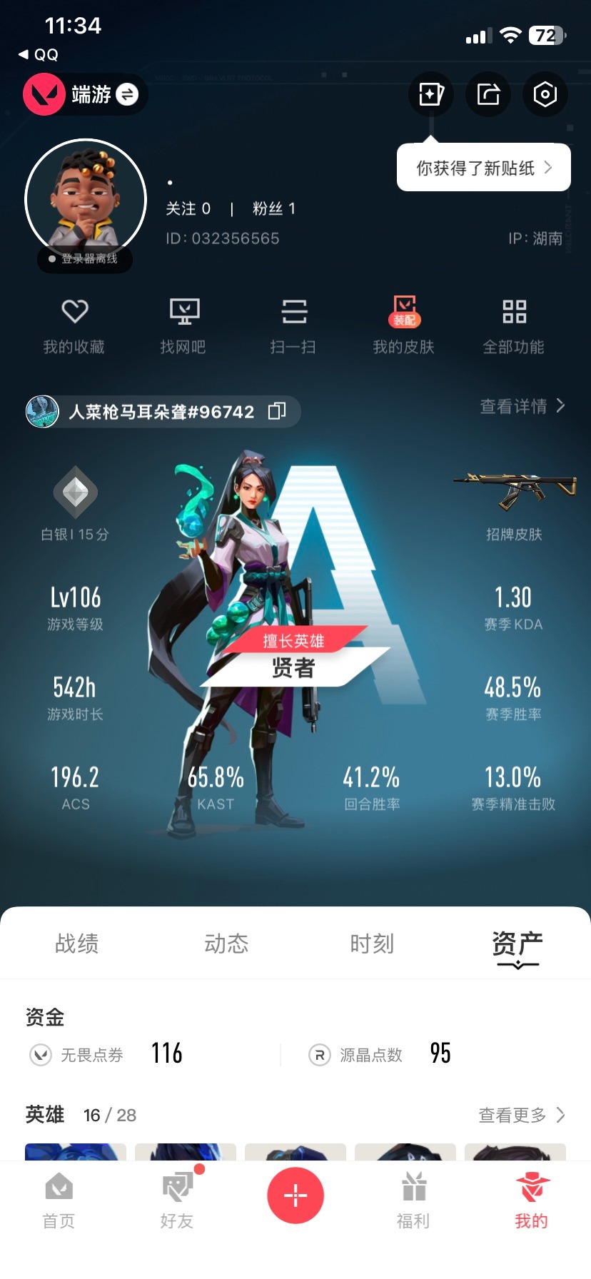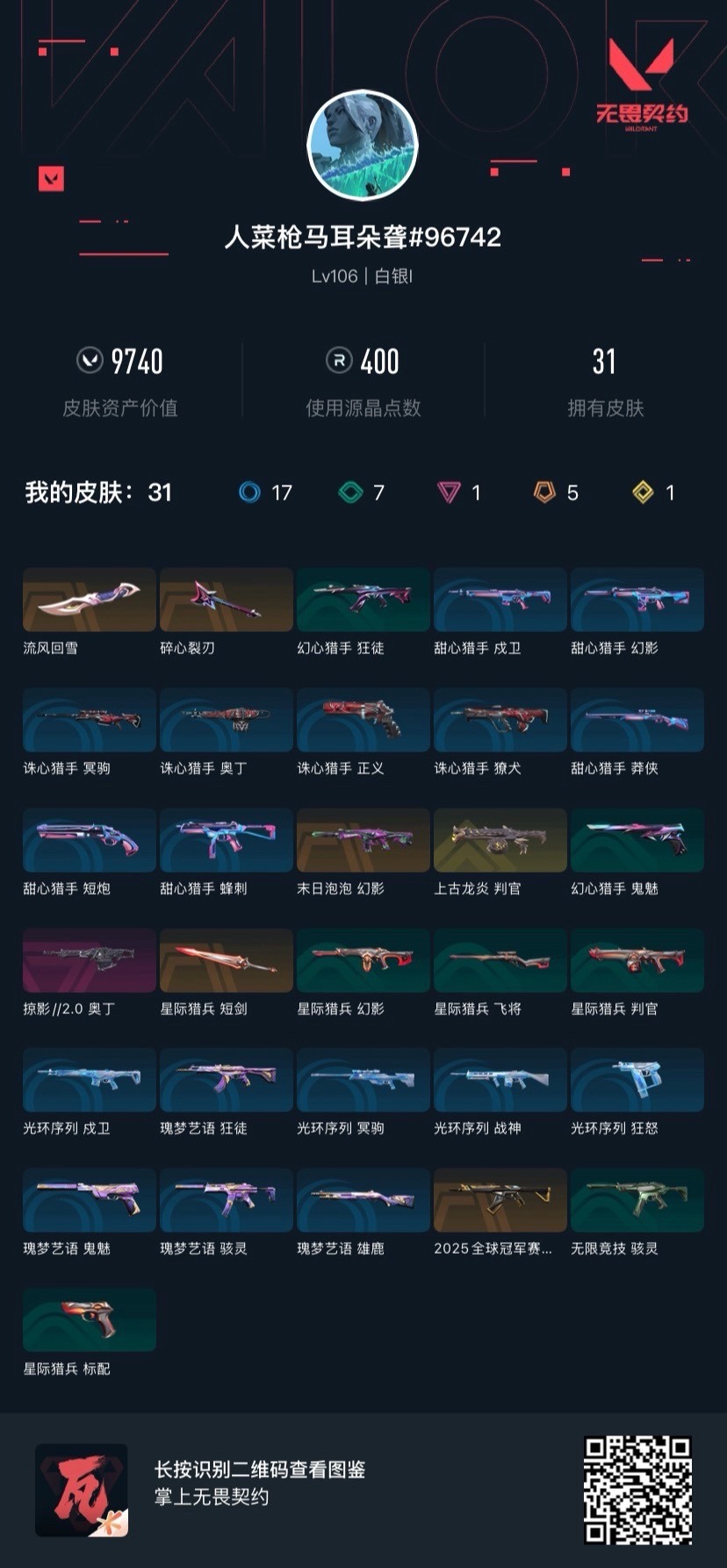 5橙皮 1金皮 1紫皮 31皮肤 16英雄 47卡面 400已用源晶 白银段位 【近战武器皮肤】碎心裂刃星际猎兵 短剑流风回雪 【霰弹呛皮肤】判官-上古龙炎 【步呛皮肤】2025全球冠军赛 狂徒幻影-末日泡泡 【机呛皮肤】奥丁-掠影2.0 【挂饰】v26第一幕纪念币 挂饰