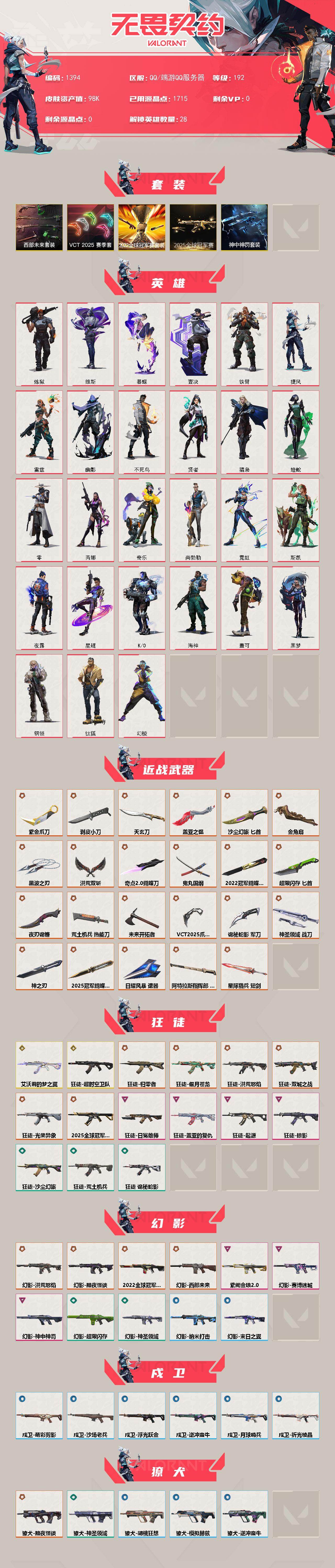 【1394】xl30700 【套装】:2025全球冠军赛套装,2022全球冠军赛套装,vct 2025 赛季套装,西部未来套装,神中神罚套装 【英雄】:幻棱,炼狱,维斯,暮蝶,钛狐,壹决,铁臂,捷风,雷兹,幽影,不死鸟,贤者,猎枭,蝰蛇,零,芮娜,奇乐,尚勃勒,霓虹,斯凯,夜露,星礈,k/o,海神,盖可,黑梦,钢锁 【近战武器】:近战武器-2025全球冠军赛 蝴蝶刀,近战武器-2022全球冠军赛 蝴蝶刀,近战武器-神之刃,近战武器-剥皮小刀,近战武器-奇点//2.0 蝴蝶刀,近战武器-vct 2025 爪刀,近战武器-紫金爪刀,近战武器-黑波之刃,近战武器-鬼丸国纲,近战武器-未来开拓者,近战武器-超限闪存 匕首,近战武器-盖亚之愠,近战武器-洪荒双斩,近战武器-荒土机兵 热能刀,近战武器-金角扇,近战武器-沙尘幻旅 匕首,近战武器-天玄刀,近战武器-夜刃诡镰,近战武器-诡秘蛇影 军刀,近战武器-神圣领域 战刀,近战武器-日耀风暴 遗器,近战武器-阿特拉斯指挥部 甩棍,近战武器-星际猎兵 短剑 【狂徒】:狂徒-艾沃莉的梦之翼,狂徒-超时空卫队,狂徒-2025全球冠军赛,狂徒-归零者,狂徒-洪荒怒焰,狂徒-双城之战,狂徒-偃月苍龙,狂徒-光荣异象,狂徒-掠影,狂徒-盖亚的复仇,狂徒-起源,狂徒-日冕雄师,狂徒-荒土机兵,狂徒-沙尘幻旅,狂徒-诡秘蛇影 【幻影】:幻影-2022全球冠军赛,幻影-黯夜怪谈,幻影-洪荒怒焰,幻影-西部未来,幻影-赛博迷城,幻影-紫阙金琅//2.0,幻影-神中神罚,幻影-超限闪存,幻影-神圣领域,幻影-纳米打击,幻影-末日之翼,幻影-西部未来 【戍卫】:戍卫-浮光跃金,戍卫-萌彩剪影,戍卫-逆冲蛮牛,戍卫-沙场老兵,戍卫-月球哨兵,戍卫-折光棱晶 【獠犬】:獠犬-黯夜怪谈,獠犬-神圣领域,獠犬-胡桃狂想,獠犬-模拟赫兹,獠犬-逆冲蛮牛 【冥驹】:冥驹-堕天遗武,冥驹-荒土机兵,冥驹-胡桃狂想,冥驹-模拟赫兹,冥驹-沙场老兵,冥驹-星云暗涌 【飞将】:飞将-西部未来,飞将-沙尘幻旅,飞将-末日之翼 【莽侠】:莽侠-神中神罚,莽侠-超限闪存,莽侠-诡秘蛇影,莽侠-月球哨兵 【战神】:战神-神圣领域,战神-浮光跃金,战神-萌彩剪影 【奥丁】:奥丁-西部未来,奥丁-纳米打击,奥丁-末日之翼 【判官】:判官-上古龙炎,判官-诡秘蛇影,判官-萌彩剪影,判官-纳米打击x 【雄鹿】:雄鹿-模拟赫兹,雄鹿-逆冲蛮牛,雄鹿-月球哨兵 【骇灵】:骇灵-神中神罚,骇灵-荒土机兵,骇灵-沙尘幻旅,骇灵-无限竞技,骇灵-浮光跃金,骇灵-星云暗涌 【蜂刺】:蜂刺-混沌序曲,蜂刺-超限闪存,蜂刺-胡桃狂想,蜂刺-星云暗涌,蜂刺-折光棱晶 【标配】:标配-黯夜怪谈,标配-荒土机兵,标配-浮光跃金,标配-折光棱晶 【正义】:正义-西部未来,正义-掠影,正义-离子武器,正义-超限闪存,正义-沙尘幻旅,正义-纳米打击,正义-月球哨兵 【鬼魅】:鬼魅-耀鳞威龙,鬼魅-诡秘蛇影,鬼魅-胡桃狂想,鬼魅-模拟赫兹,鬼魅-星云暗涌 【狂怒】:狂怒-神中神罚,狂怒-神圣领域,狂怒-萌彩剪影,狂怒-逆冲蛮牛 【短炮】:短炮-末日之翼 【卡面】:终章:激斗汉堡 卡面,进入射程 卡面,分崩离析 卡面,纳米打击 卡面,抑制技术 卡面,激斗汉堡 卡面,瓦娃脸雪糕 p2 卡面,从黄昏到黎明 卡面,荒土机兵 卡面,银弹猎手 卡面,逆冲蛮牛 卡面,《双城之战》拥抱 卡面,精灵大战 卡面,欢迎来到底城 卡面,南瓜盛典 卡面,vct cn首冠 卡面,唱片的故事 卡面,钢弓与箭弦 卡面,排除故障 卡面,战术桌游 卡面,悠享食光 卡面,修车达人 卡面,热舞环节 卡面,模拟赫兹 卡面,浮光跃金 卡面,超限闪存 卡面,维斯工牌 卡面,正义的化身 卡面,clutch 卡面,暮蝶工牌 卡面,无畏契约go!第一卷:芮娜 卡面,无畏契约go!第一卷:零 卡面,《双城之战》金克丝 卡面,蝰蛇vs幽影 卡面,无畏契约go!第一卷:贤者 卡面,铁臂vs雷兹 卡面,纪念照 p2 卡面,钢锁vs盖可 卡面,别冒尖 卡面,一击全倒 卡面,黑影先生的咖啡! 卡面,天台狂欢 卡面,胡桃狂想 卡面,沙尘幻旅 卡面,壹决工牌 卡面,萌彩剪影 卡面,势不可挡//k/o 卡面,夯实根基 卡面,"luie" 卡面,热烈欢迎 卡面,铁臂设计图 卡面,代号红色 卡面,冰淇淋店 卡面,新兵报到 卡面,友军火力 卡面,v契约 卡面,无畏契约 卡面 【喷漆】:小小心意 喷漆,战“素”兔 喷漆,宇宙的指引 喷漆,请求重启 喷漆,逆冲蛮牛 喷漆,纳米打击 喷漆,鼻尖上的蝴蝶 喷漆,简笔画黯兽 喷漆,独守蝰腹 喷漆,他们将落荒而逃 喷漆,通缉:战术企鹅 喷漆,荒土机兵 喷漆,别挡我吃球! 喷漆,嗨宝南瓜灯 喷漆,啊? 喷漆,嘭! 喷漆,都算到了 喷漆,控场勿近 喷漆,皮蛋呼呼 喷漆,像素星礈 喷漆,图谋不轨的零 喷漆,小丑猫 喷漆,模拟赫兹 喷漆,高丽风情小熊 喷漆,蹲到一个 喷漆,全力集中 喷漆,超限闪存 喷漆,rua一下 喷漆,熊抱 喷漆,蛋糕还是爆能器? 喷漆,高丽风情小虎 喷漆,记在小本本 喷漆,防弹企鹅 喷漆,高丽风情小蛙 喷漆,又被闪了 喷漆,加油!加油! 喷漆,霓光四射 喷漆,买装还是存钱 喷漆,关门放狗 喷漆,松叶 喷漆,无畏契约go!第一卷:奇乐 喷漆,这招不行了 喷漆,放下武器 喷漆,真相只有一个 喷漆,自信满满 喷漆,凌空惊吓 喷漆,再吃最后一口 喷漆,我一个滑铲 喷漆,放手一搏 喷漆,沙尘幻旅 喷漆,萌彩剪影 喷漆,电烫 喷漆,暗中偷瞄 喷漆,胡桃狂想 喷漆,红牌退场 喷漆,爆泉领域 喷漆,老铁困了 喷漆,口袋贤者 喷漆,胜利属于无畏契约 喷漆,glhf 喷漆,无畏契约 喷漆 【挂饰】:v25第六幕:超凡 挂饰,终章:猫猫木乃伊 挂饰,荒土机兵 挂饰,悠闲鸡块 挂饰,猫猫木乃伊 挂饰,水壶 挂饰,纳米打击 挂饰,逆冲