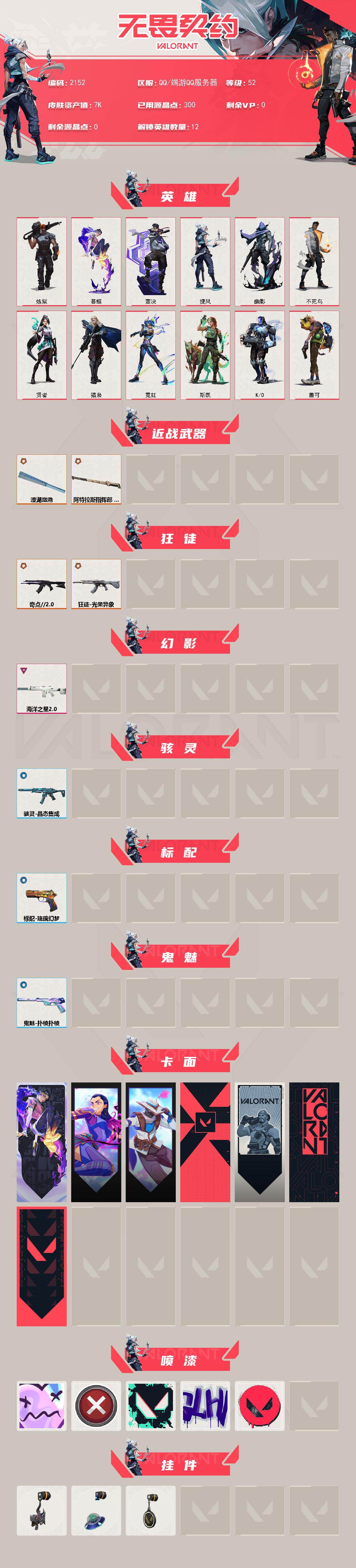 [16029351]【英雄】:炼狱,暮蝶,壹决,捷风,幽影,不死鸟,贤者,猎枭,霓虹,斯凯,k/o,盖可 【近战武器】:近战武器-澄湖潋滟,近战武器-阿特拉斯指挥部 甩棍 【狂徒】:狂徒-奇点//2.0,狂徒-光荣异象 【幻影】:幻影-海洋之星//2.0 【骇灵】:骇灵-晶态集成 【标配】:标配-琉璃幻梦 【鬼魅】:鬼魅-扑棱扑棱 【卡面】:无畏契约:暮蝶 卡面,无畏契约go!第一卷:芮娜 卡面,无畏契约go!第一卷:零 卡面,代号红色 卡面,新兵报到 卡面,v契约 卡面,无畏契约 卡面 【喷漆】:伤心心 喷漆,买装还是存钱 喷漆,胜利属于无畏契约 喷漆,glhf 喷漆,无畏契约 喷漆 【挂饰】:鱼骨头 挂饰,天外飞客 挂饰,无畏契约 纪念币 挂饰