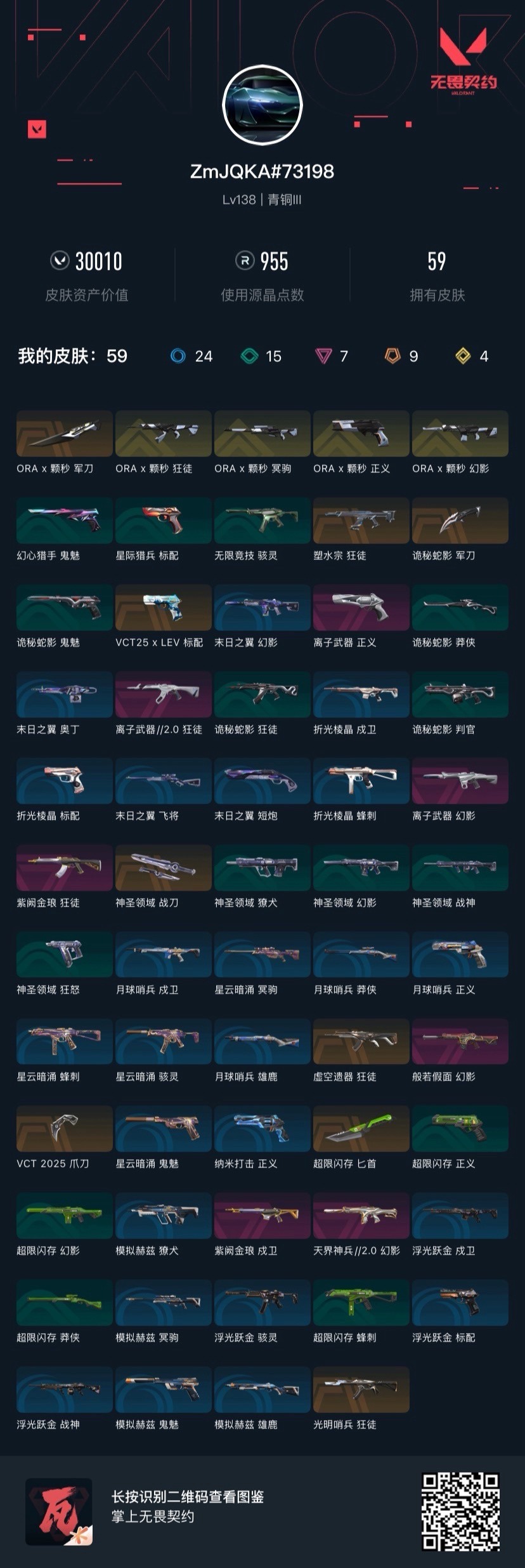 9橙皮 4金皮 7紫皮 59皮肤 26英雄 101卡面 955已用源晶 青铜段位 【套装】vcn2025套装vct 2025赛季礼包ax颗秒 【近战武器皮肤】匕首-超限闪存神圣领域 战刀诡秘蛇影vct 2025 爪刀ax颗秒 军刀 【佩呛皮肤】正义-ax颗秒标配-vc