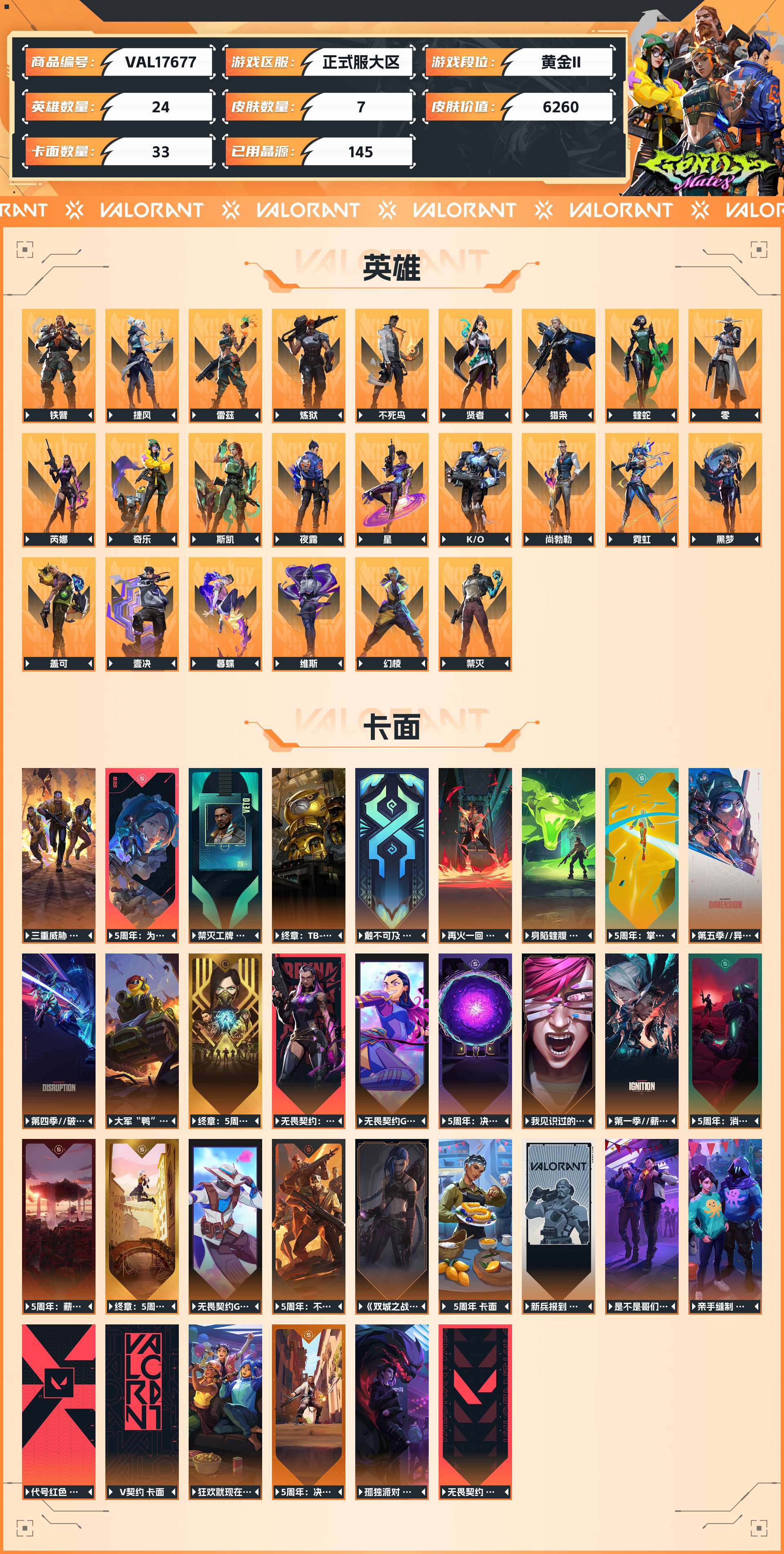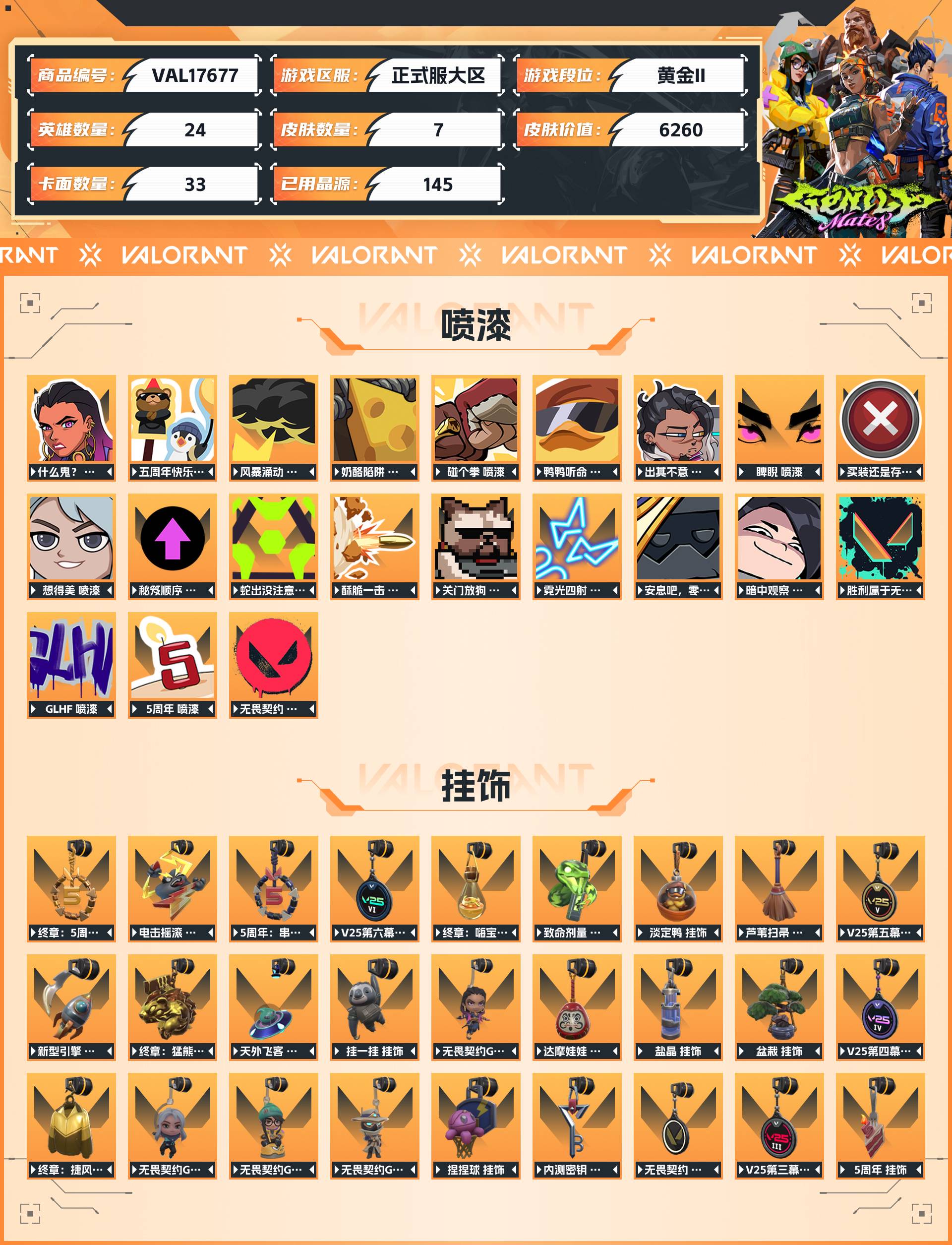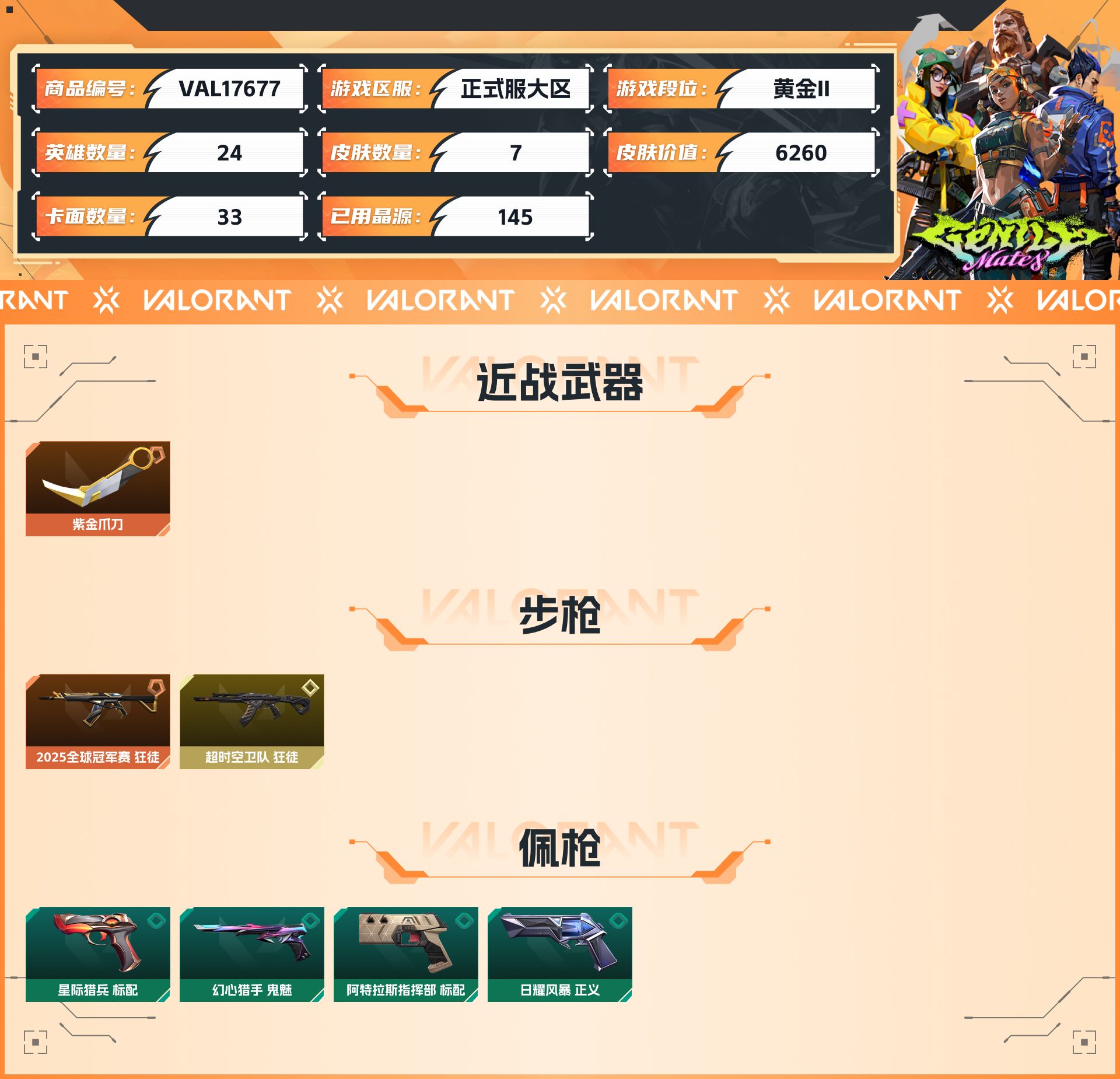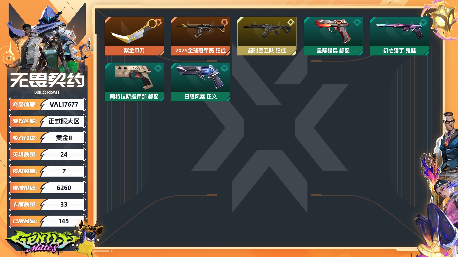 2320047-黄金ii 皮肤价值6260 已用晶源145 皮肤数量7 终极1 限定2 奢华4【拥有皮肤】紫金爪刀2025全球冠军赛 狂徒超时空卫队 狂徒星际猎兵 标配幻心猎手 鬼魅阿特拉斯指挥部 标配日耀风暴 正义 英雄数量24 卡面数量33 喷漆数量27 挂饰数量21【拥有卡面】三重威胁 卡面5周年:为何而战 卡面禁灭工牌 卡面终章:tb-01 战术巨熊 卡面触不可及