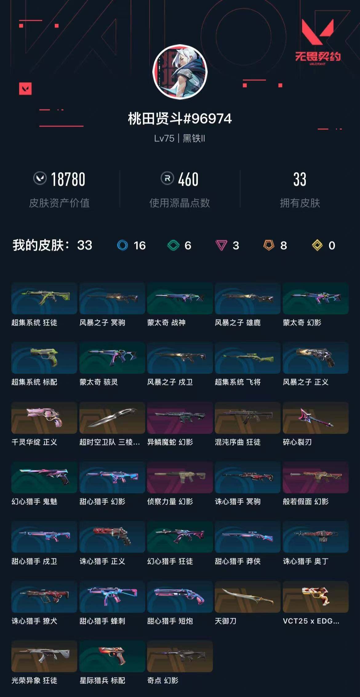 [16045281]【英雄】:幻棱,炼狱,暮蝶,壹决,捷风,不死鸟,贤者,猎枭,芮娜,尚勃勒,斯凯,k/o,黑梦,钢锁 【近战武器】:近战武器-超时空卫队 三棱军刺,近战武器-天御刀 【狂徒】:狂徒-混沌序曲,狂徒-光荣异象 【幻影】:幻影-奇点,幻影-般若假面,幻影-侦察力量,幻影-异鳞魔蛇 【vct手呛】:标配-vct25 x edg 【正义】:正义-千灵华绽 【卡面】:夜班 卡面,无畏契约go!第一卷:芮娜 卡面,无畏契约go!第一卷:零 卡面,逆向独行 卡面 ,代号红色 卡面,新兵报到 卡面,v契约 卡面,无畏契约 卡面 【喷漆】:买装还是存钱 喷漆,胜利属于无畏契约 喷漆,glhf 喷漆,无畏契约 喷漆 【挂饰】:vct x edg 挂饰,天外飞客 挂饰,插电音乐 挂饰,无畏契约 纪念币 挂饰