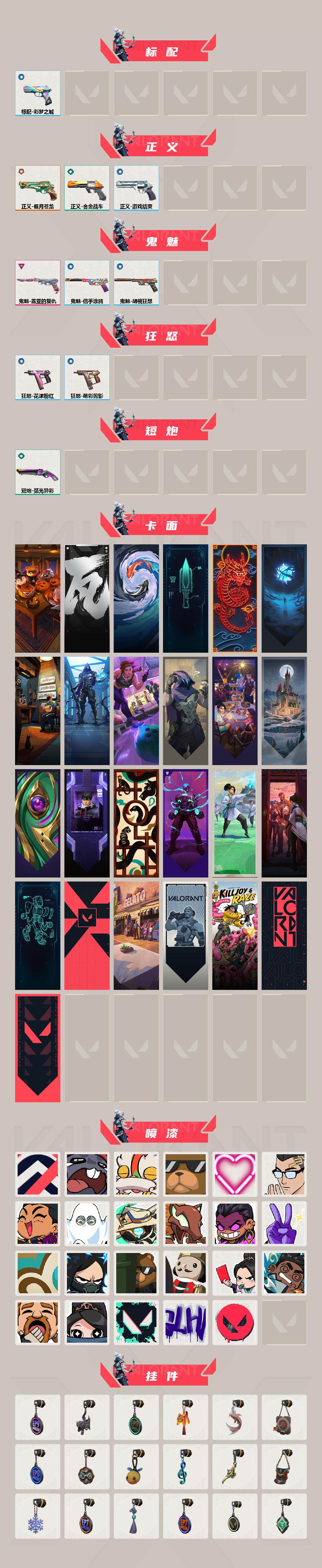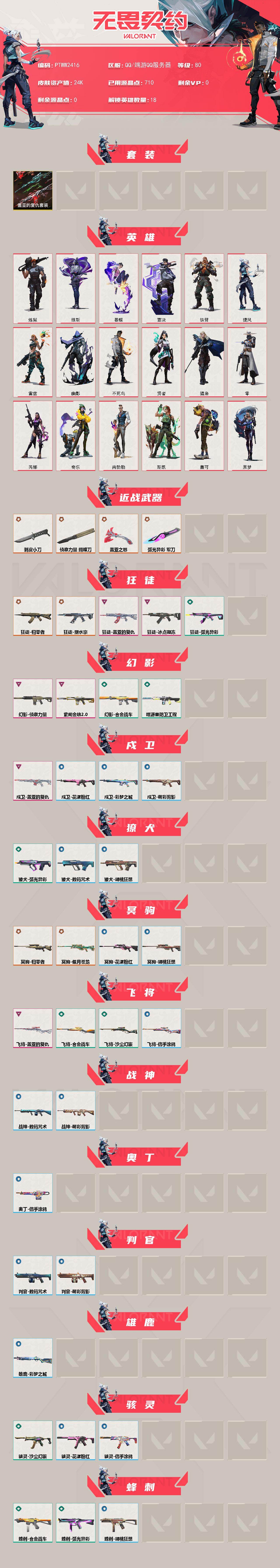 【套装】:盖亚的复仇套装 【英雄】:炼狱,维斯,暮蝶,壹决,铁臂,捷风,雷兹,幽影,不死鸟,贤者,猎枭,零,芮娜,奇乐,尚勃勒,斯凯,盖可,黑梦 【近战武器】:近战武器-侦察力量 蝴蝶刀,近战武器-剥皮小刀,近战武器-盖亚之怒,近战武器-弧光异彩 军刀 【狂徒】:狂徒-归零者,狂徒-塑水宗,狂徒-冰点凝冻,狂徒-盖亚的复仇,狂徒-弧光异彩 【幻影】:幻影-侦察力量,幻影-紫阙金琅//2.0,幻