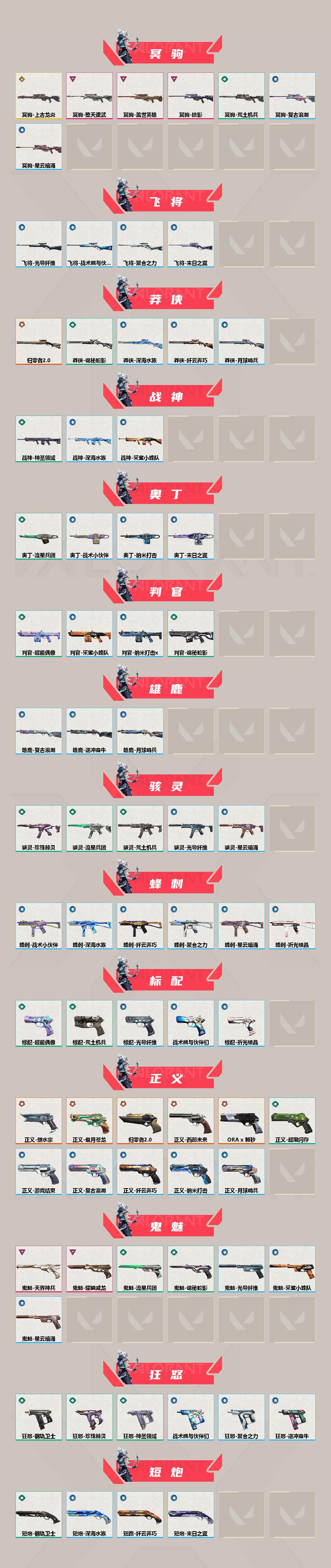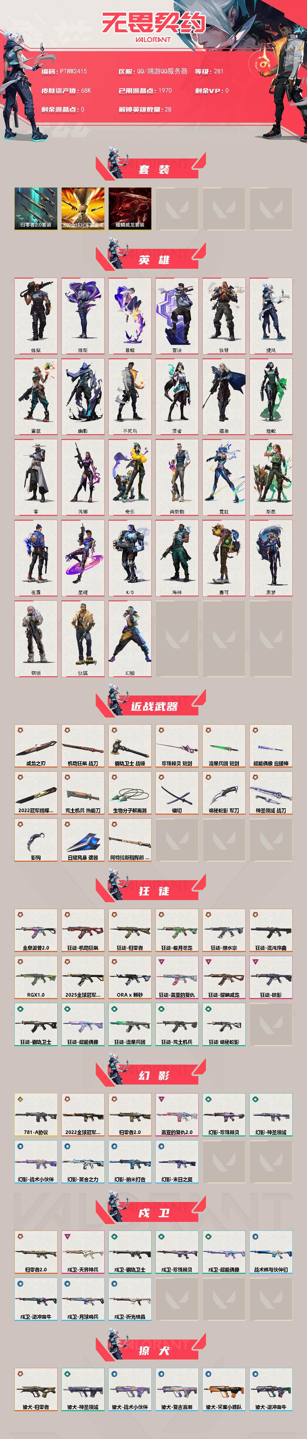 【套装】:2022全球冠军赛套装,归零者//2.0套装,耀鳞威龙套装 【英雄】:幻棱,炼狱,维斯,暮蝶,钛狐,壹决,铁臂,捷风,雷兹,幽影,不死鸟,贤者,猎枭,蝰蛇,零,芮娜,奇乐,尚勃勒,霓虹,斯凯,夜露,星礈,k/o,海神,盖可,黑梦,钢锁 【近战武器】:近战武器-2022全球冠军赛 蝴蝶刀,近战武器-影钩,近战武器-镭切,近战武器-威龙之刃,近战武器-珍珠棘贝 短剑,近战武器-流星兵团