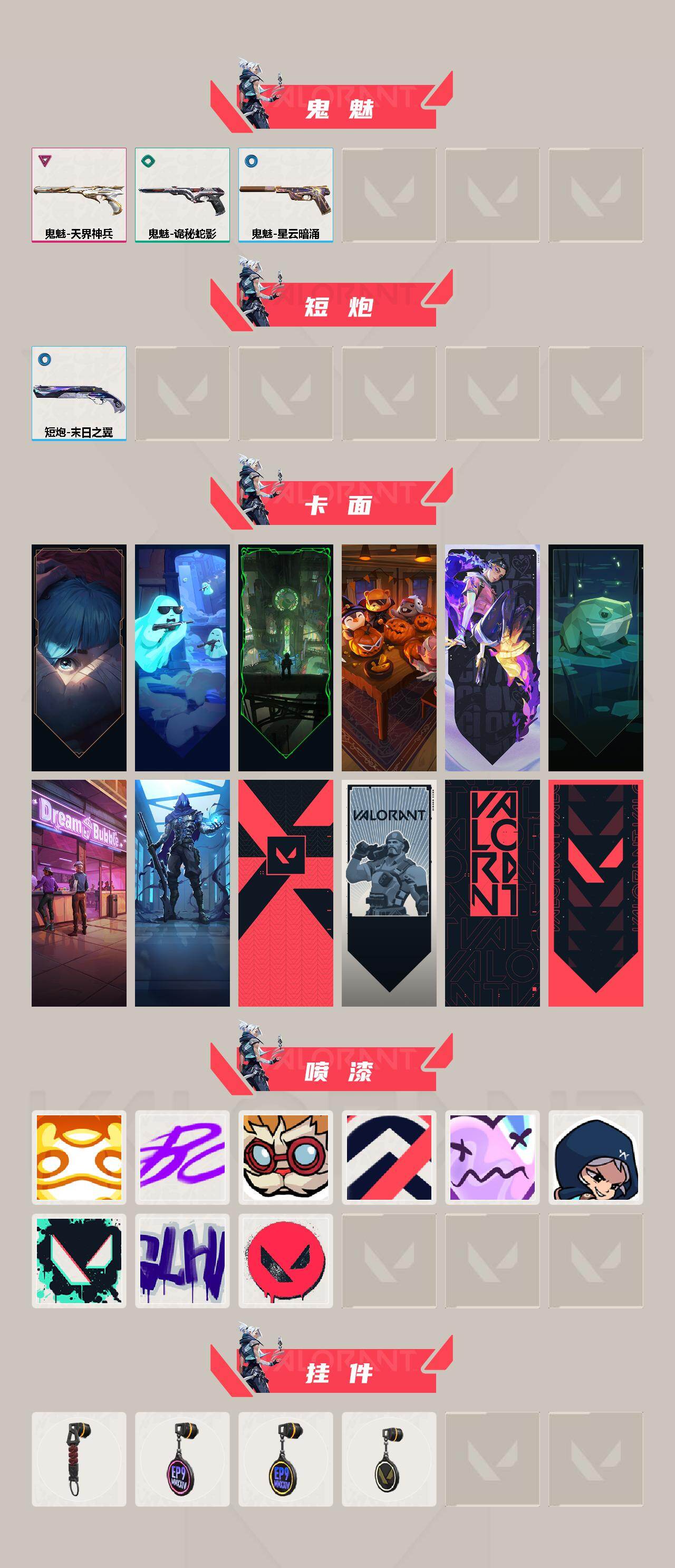 【套装】:无畏契约季前邀请赛套装 【英雄】:幻棱,炼狱,维斯,暮蝶,钛狐,壹决,铁臂,捷风,雷兹,幽影,不死鸟,贤者,猎枭,蝰蛇,零,芮娜,奇乐,尚勃勒,霓虹,斯凯,夜露,星礈,k/o,海神,盖可,黑梦,钢锁 【近战武器】:近战武器-无畏契约季前邀请赛 悲悯之刃,近战武器-天玄刀,近战武器-诡秘蛇影 军刀 【狂徒】:狂徒-盖亚的复仇,狂徒-日冕雄师,狂徒-紫阙金琅,狂徒-诡秘蛇影 【幻影】:幻