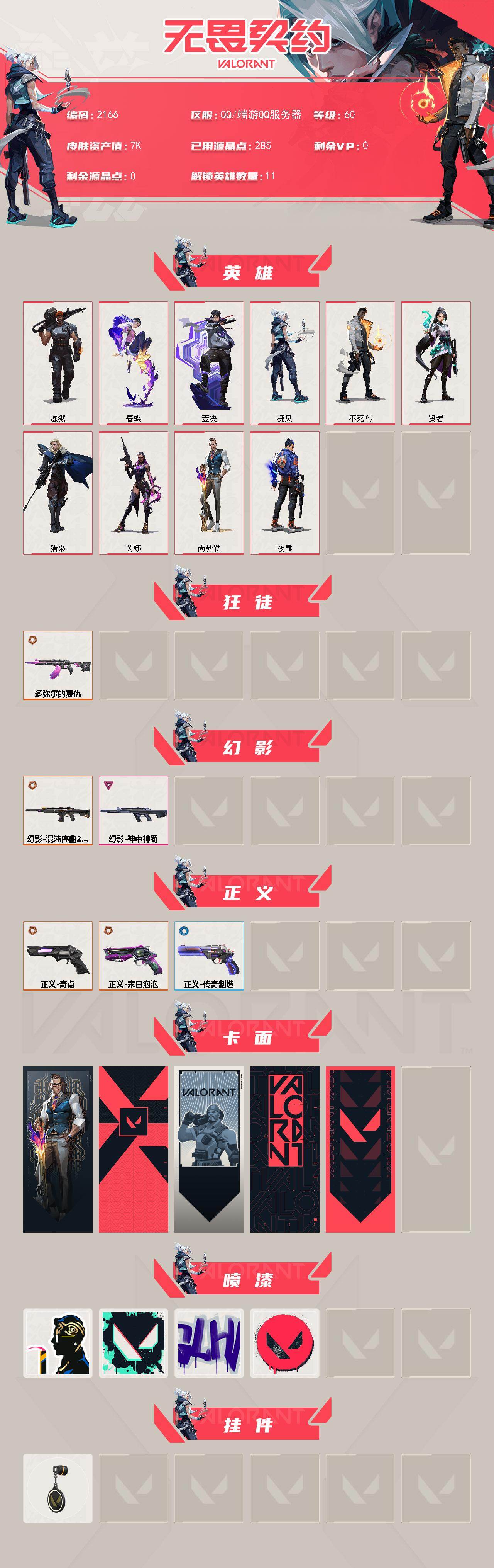 [16053018]【英雄】:炼狱,暮蝶,壹决,捷风,不死鸟,贤者,猎枭,芮娜,尚勃勒,夜露 【狂徒】:狂徒-多弥尔的复仇 【幻影】:幻影-混沌序曲//2.0,幻影-神中神罚 【正义】:正义-奇点,正义-末日泡泡,正义-传奇制造 【卡面】:无畏契约:尚勃勒 卡面,代号红色 卡面,新兵报到 卡面,v契约 卡面,无畏契约 卡面 【喷漆】:致命优雅 喷漆,胜利属于无畏契约 喷漆,glhf 喷漆,无畏契约 喷漆 【挂饰】:无畏契约 纪念币 挂饰
