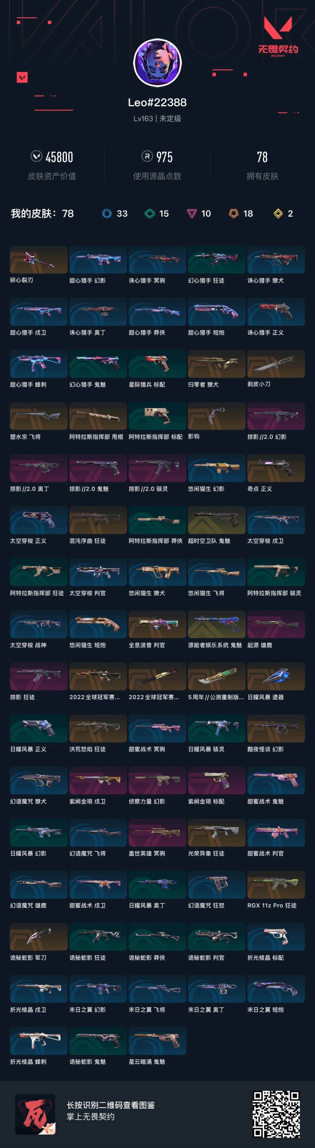 18橙皮 2金皮 10紫皮 78皮肤 28英雄 102卡面 975已用源晶 未定级段位 【亮点皮肤】幻影-2022全球冠军赛蝴蝶刀-2022全球冠军赛 【套装】掠影2.0套装2022全球冠军赛 【近战武器皮肤】日耀风暴 遗器苍龙之刃阿特拉斯指挥部影钩诡秘蛇影碎心裂刃剥皮小刀 【佩呛