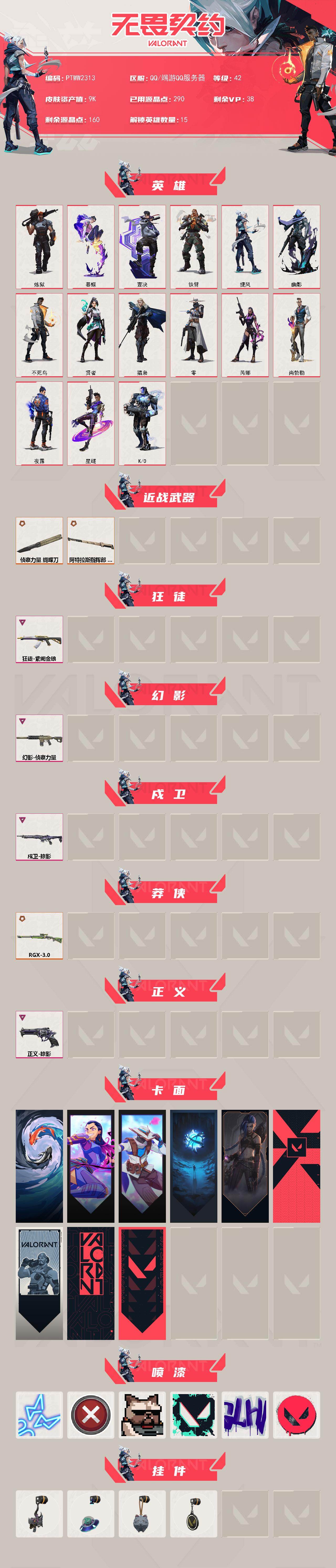 【英雄】:炼狱,暮蝶,壹决,铁臂,捷风,幽影,不死鸟,贤者,猎枭,零,芮娜,尚勃勒,夜露,星礈,k/o 【近战武器】:近战武器-侦察力量 蝴蝶刀,近战武器-阿特拉斯指挥部 甩棍 【狂徒】:狂徒-紫阙金琅 【幻影】:幻影-侦察力量 【戍卫】:戍卫-掠影 【莽侠】:莽侠-rgx 11z pro//3.0 【正义】:正义-掠影 【卡面】:红鳞松叶 卡面,无畏契约go!第一卷:芮娜 卡面,无畏契约go