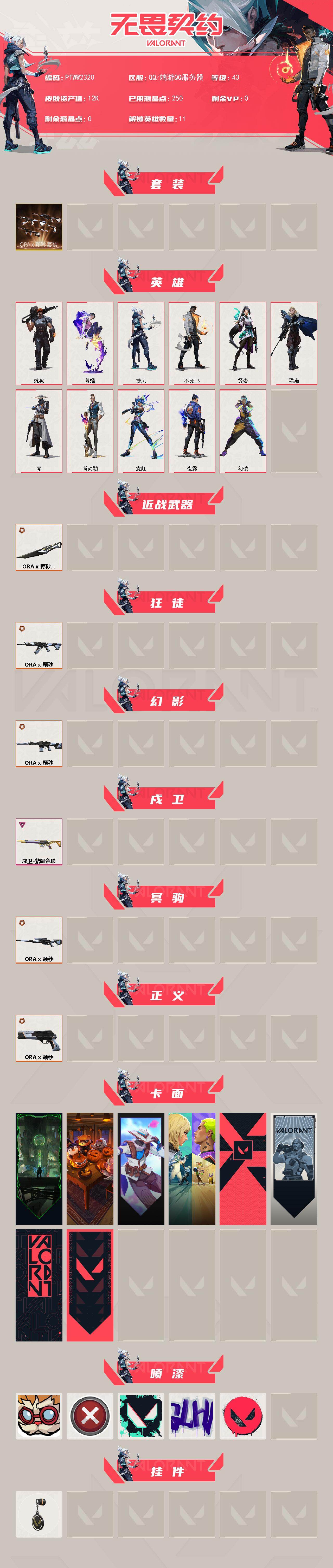 【套装】:a x 颗秒套装 【英雄】:幻棱,炼狱,暮蝶,捷风,不死鸟,贤者,猎枭,零,尚勃勒,霓虹,夜露 【近战武器】:近战武器-a x 颗秒 军刀 【狂徒】:狂徒-a x 颗秒 【幻影】:幻影-a x 颗秒 【戍卫】:戍卫-紫阙金琅 【冥驹】:冥驹-a x 颗秒 【正义】:正义-a x 颗秒 【卡面】:欢迎来到底城 卡面,南瓜盛典 卡面,无畏契约go!第一卷:零 卡面