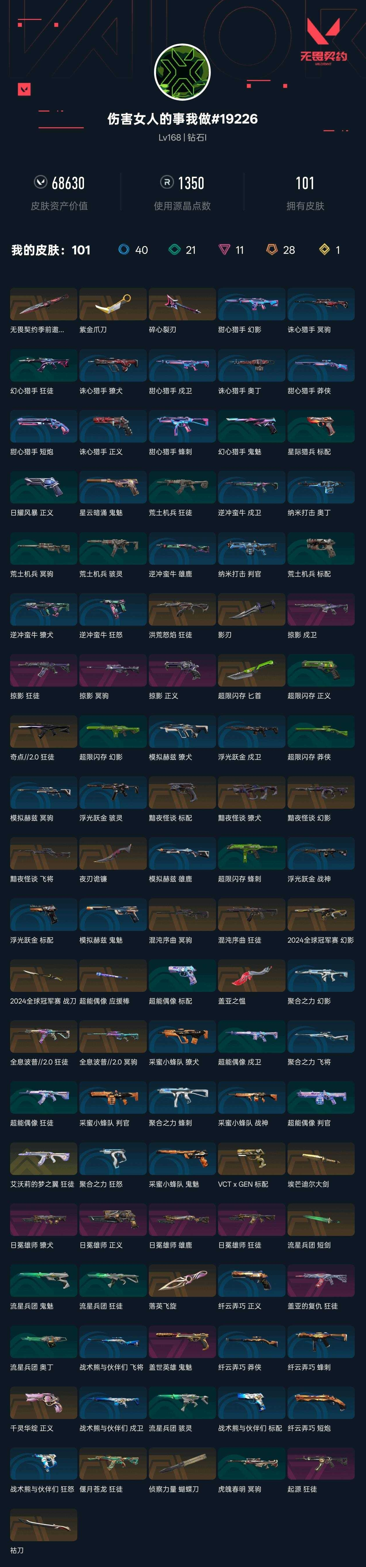 【无畏契约】【yhwww8687】等级:168,已用无畏点68630,已用源晶点1350,金皮:狂徒-艾沃莉的梦之翼__橙皮:标配-vct x gen|标配-黯夜怪谈|飞将-黯夜怪谈|幻影-2024全球冠军赛|幻影-黯夜怪谈|近战-2024全球冠军赛 战刀|近战-埃芒迪尔大剑|近战-超限闪存 匕首|近战-祜刀|近战-超能偶像 应援棒|近战-盖亚之愠|近战-流星兵团 短剑|近战-落英飞旋|近战-夜刃诡镰|近战-紫金爪刀|獠犬-黯夜怪谈|狂徒-全息波普2.0|狂徒-偃月苍龙|狂徒-洪荒怒焰|狂徒-混沌序曲|冥驹-全息波普2.0|冥驹-混沌序曲|正义-千灵华绽|近战-侦察力量 蝴蝶刀|狂徒-奇点2.0|近战-影刃__紫皮:鬼魅-盖世英雄|狂徒-起源|狂徒-日冕雄师|狂徒-盖亚的复仇|獠犬-日冕雄师|雄鹿-日冕雄师|正义-日冕雄师|冥驹-掠影|狂徒-掠影|戍卫-掠影|正义-掠影__段位:钻石__蓝皮:判官-纳米打击|奥丁-纳米打击|雄鹿-逆冲蛮牛|狂怒-逆冲蛮牛|戍卫-逆冲蛮牛|獠犬-逆冲蛮牛|鬼魅-星云暗涌|鬼魅-采蜜小蜂队|战神-采蜜小蜂队|獠犬-采蜜小蜂队|判官-采蜜小蜂队|骇灵-浮光跃金|标配-浮光跃金|戍卫-浮光跃金|战神-浮光跃金|蜂刺-聚合之力|幻影-聚合之力|狂怒-聚合之力|飞将-聚合之力|鬼魅-模拟赫兹|獠犬-模拟赫兹|冥驹-模拟赫兹|雄鹿-模拟赫兹|莽侠-纤云弄巧|正义-纤云弄巧|短炮-纤云弄巧|蜂刺-纤云弄巧|飞将-战术熊与伙伴们|狂怒-战术熊与伙伴们|戍卫-战术熊与伙伴们|标配-战术熊与伙伴们|蜂刺-甜心猎手|短炮-甜心猎手|莽侠-甜心猎手|幻影-甜心猎手|戍卫-甜心猎手|正义-诛心猎手|冥驹-诛心猎手|獠犬-诛心猎手|奥丁-诛心猎手__绿皮:狂徒-荒土机兵|标配-荒土机兵|骇灵-荒土机兵|冥驹-荒土机兵|戍卫-超能偶像|标配-超能偶像|狂徒-超能偶像|判官-超能偶像|正义-超限闪存|莽侠-超限闪存|幻影-超限闪存|蜂刺-超限闪存|冥驹-虎魄春明|骇灵-流星兵团|鬼魅-流星兵团|狂徒-流星兵团|奥丁-流星兵团|正义-日耀风暴|标配-星际猎兵|狂徒-幻心猎手|鬼魅-幻心猎手__英雄:尚勃勒|维斯|黑梦|斯凯|暮蝶|盖可|霓虹|壹决|星礈|k/o|幽影|夜露|钢锁|海神|奇乐|炼狱|铁臂|贤者|猎枭|钛狐|芮娜|零|捷风|蝰蛇|不死鸟|幻棱|雷兹|禁灭