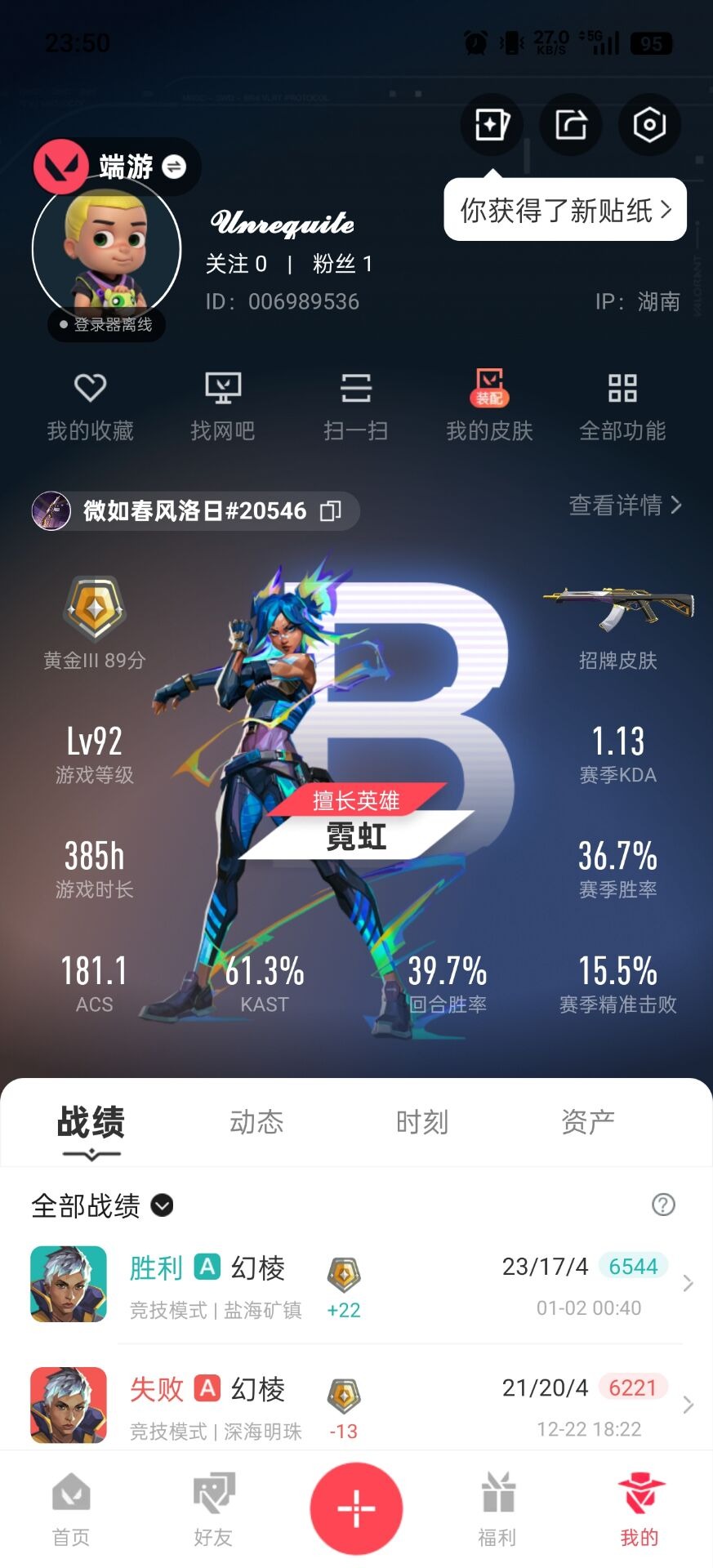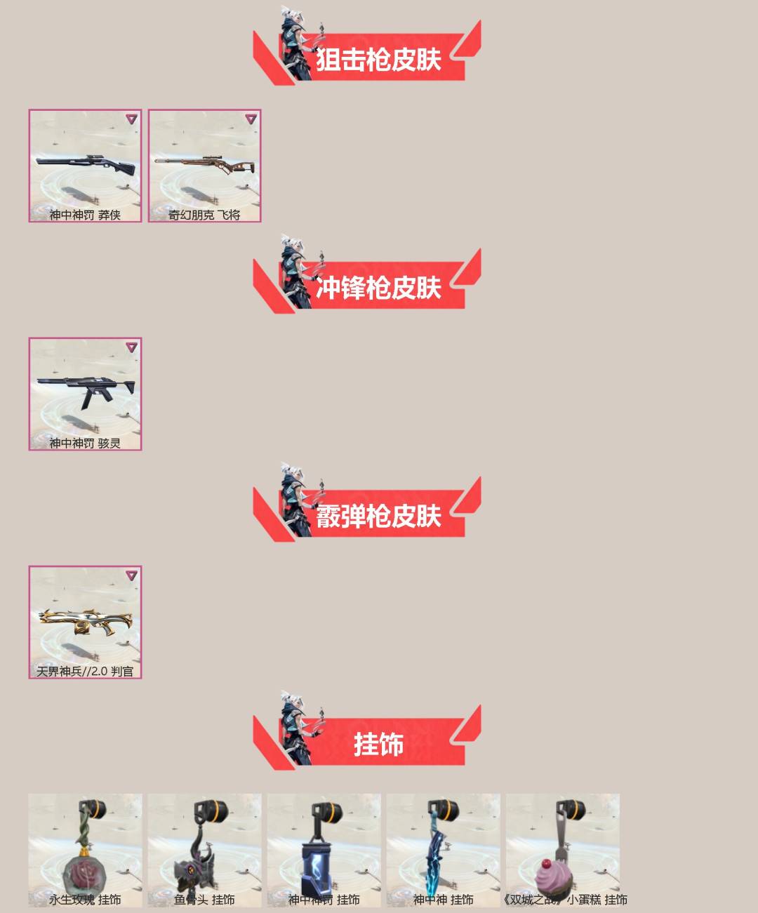 6橙皮 10紫皮 51皮肤 26英雄 80卡面 810已用源晶 黄金段位 【套装】神罚套装神中神罚套装 【近战武器皮肤】双生獠牙诡秘蛇影神之刃魄月玄刃 【佩呛皮肤】狂怒-神中神罚 【冲锋呛皮肤】骇灵-神中神罚 【霰弹呛皮肤】判官-天界神兵2.0 【步呛皮肤】幻影-神中神罚狂徒-奇点//2