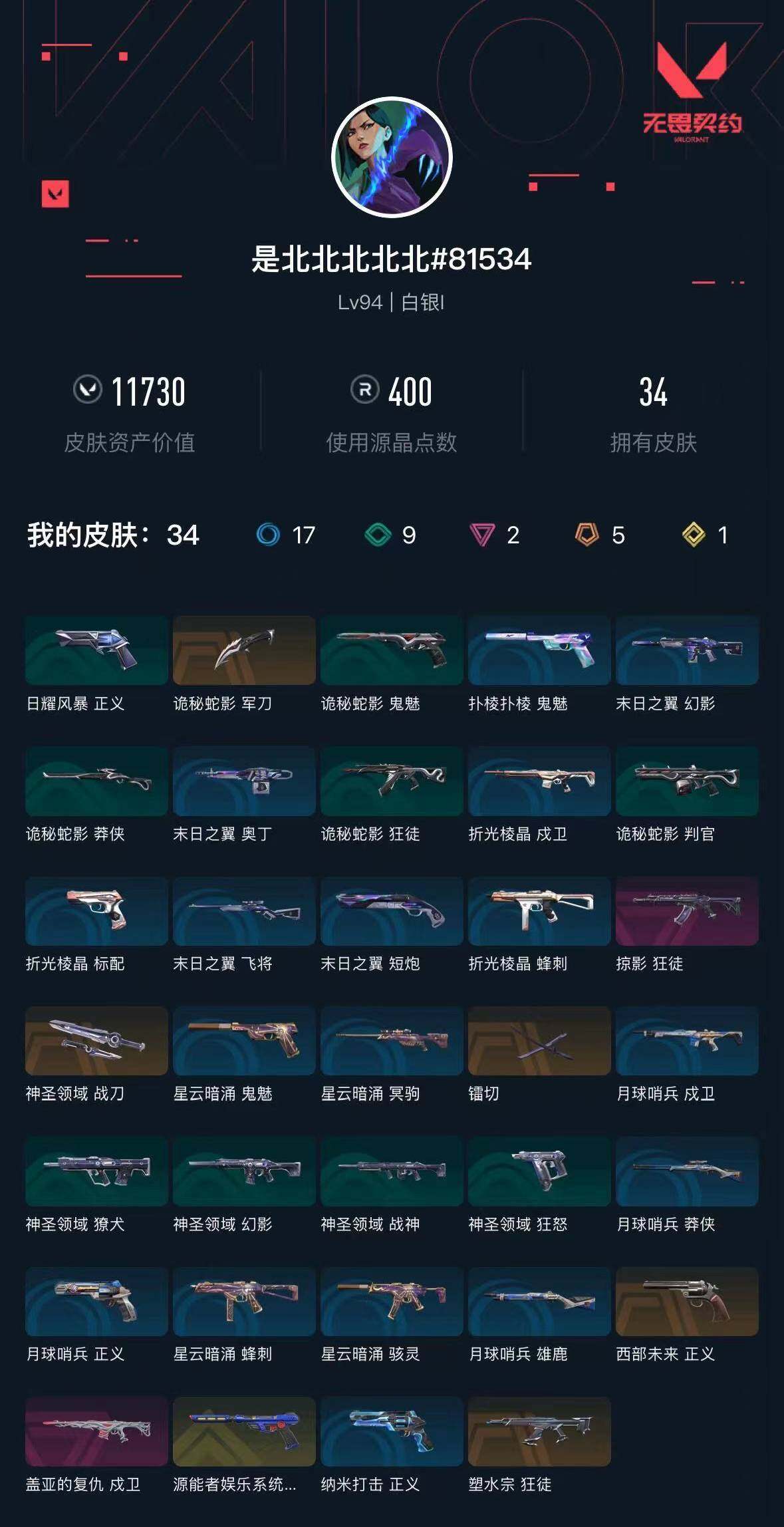 [16075087]【英雄】:幻棱,炼狱,维斯,暮蝶,钛狐,壹决,铁臂,捷风,不死鸟,贤者,猎枭,零,芮娜,霓虹,夜露,盖可,黑梦,钢锁 【近战武器】:近战武器-镭切,近战武器-诡秘蛇影 军刀,近战武器-神圣领域 战刀 【狂徒】:狂徒-塑水宗,狂徒-掠影,狂徒-诡秘蛇影 【幻影】:幻影-神圣领域,幻影-末日之翼 【戍卫】:戍卫-盖亚的复仇,戍卫-月球哨兵,戍卫-折光棱晶 【獠犬】:獠犬-神圣领域 【冥驹】:冥驹-星云暗涌 【飞将】:飞将-末日之翼 【莽侠】:莽侠-诡秘蛇影,莽侠-月球哨兵 【战神】:战神-神圣领域 【奥丁】:奥丁-末日之翼 【判官】:判官-诡秘蛇影 【雄鹿】:雄鹿-月球哨兵 【骇灵】:骇灵-星云暗涌 【蜂刺】:蜂刺-星云暗涌,蜂刺-折光棱晶 【标配】:标配-折光棱晶 【正义】:正义-西部未来,正义-纳米打击,正义-月球哨兵 【鬼魅】:鬼魅-源能者娱乐系统,鬼魅-诡秘蛇影,鬼魅-扑棱扑棱,鬼魅-星云暗涌 【狂怒】:狂怒-神圣领域 【短炮】:短炮-末日之翼 【卡面】:终章:激斗汉堡 卡面,进入射程 卡面,精灵大战 卡面,南瓜盛典 卡面,无畏契约:暮蝶 卡面,修车达人 卡面,正义的化身 卡面,无畏契约go!第一卷:芮娜 卡面,无畏契约go!第一卷:零 卡面,蝰蛇vs幽影 卡面,代号红色 卡面,新兵报到 卡面,v契约 卡面,无畏契约 卡面 【喷漆】:嗨宝南瓜灯 喷漆,控场勿近 喷漆,伤心心 喷漆,熊抱 喷漆,惊声尖叫 喷漆,买装还是存钱 喷漆,胜利属于无畏契约 喷漆,glhf 喷漆,无畏契约 喷漆 【挂饰】:终章:猫猫木乃伊 挂饰,悠闲鸡块 挂饰,伞绳 挂饰,第九季//第三幕 纪念币 挂饰,无畏契约go!第一卷 芮娜 挂饰,无畏契约go!第一卷 零 挂饰,第九季//第二幕 纪念币 挂饰,天外飞客 挂饰,无畏契约 纪念币 挂饰