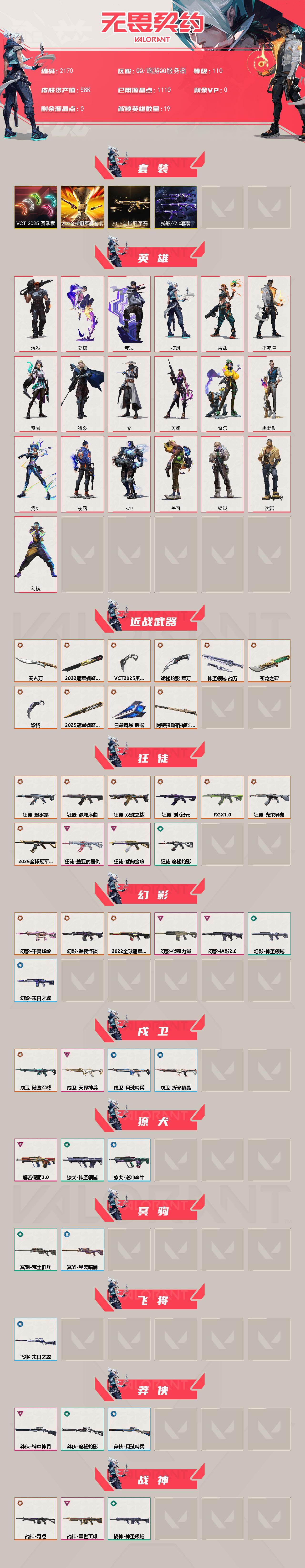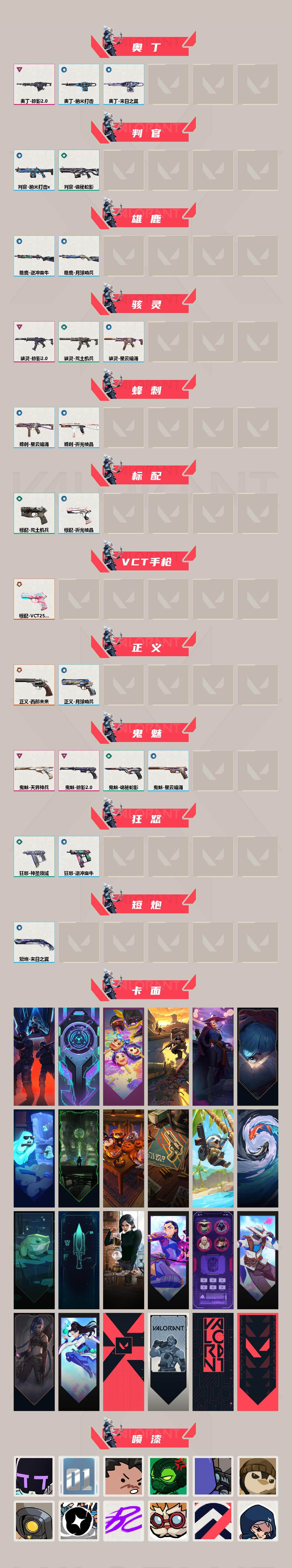 [16075434]【套装】:2025全球冠军赛套装,2022全球冠军赛套装,vct 2025 赛季套装,掠影//2.0套装 【英雄】:幻棱,炼狱,暮蝶,钛狐,壹决,捷风,雷兹,不死鸟,贤者,猎枭,零,芮娜,奇乐,尚勃勒,霓虹,夜露,k/o,盖可,钢锁 【近战武器】:近战武器-2025全球冠军赛 蝴蝶刀,近战武器-2022全球冠军赛 蝴蝶刀,近战武器-影钩,近战武器-5周年//公测重制版 苍龙之刃,近战武器-vct 2025 爪刀,近战武器-天玄刀,近战武器-诡秘蛇影 军刀,近战武器-神圣领域 战刀,近战武器-日耀风暴 遗器,近战武器-阿特拉斯指挥部 甩棍 【狂徒】:狂徒-2025全球冠军赛,狂徒-混沌序曲,狂徒-双城之战,狂徒-塑水宗,狂徒-创·纪元,狂徒-rgx 11z pro,狂徒-光荣异象,狂徒-盖亚的复仇,狂徒-紫阙金琅,狂徒-诡秘蛇影 【幻影】:幻影-2022全球冠军赛,幻影-黯夜怪谈,幻影-千灵华绽,幻影-侦察力量,幻影-掠影//2.0,幻影-神圣领域,幻影-末日之翼 【戍卫】:戍卫-破败军械,戍卫-天界神兵,戍卫-月球哨兵,戍卫-折光棱晶 【獠犬】:獠犬-般若假面//2.0,獠犬-神圣领域,獠犬-逆冲蛮牛 【冥驹】:冥驹-荒土机兵,冥驹-星云暗涌 【飞将】:飞将-末日之翼 【莽侠】:莽侠-神中神罚,莽侠-诡秘蛇影,莽侠-月球哨兵 【战神】:战神-奇点,战神-盖世英雄,战神-神圣领域 【奥丁】:奥丁-掠影//2.0,奥丁-纳米打击,奥丁-末日之翼 【判官】:判官-诡秘蛇影,判官-纳米打击x 【雄鹿】:雄鹿-逆冲蛮牛,雄鹿-月球哨兵 【骇灵】:骇灵-掠影//2.0,骇灵-荒土机兵,骇灵-星云暗涌 【蜂刺】:蜂刺-星云暗涌,蜂刺-折光棱晶 【标配】:标配-荒土机兵,标配-折光棱晶 【vct手呛】:标配-vct25 x blg 【正义】:正义-西部未来,正义-月球哨兵 【鬼魅】:鬼魅-天界神兵,鬼魅-掠影//2.0,鬼魅-诡秘蛇影,鬼魅-星云暗涌 【狂怒】:狂怒-神圣领域,狂怒-逆冲蛮牛 【短炮】:短炮-末日之翼 【卡面】:纳米打击 卡面,抑制技术 卡面,瓦娃脸雪糕 p2 卡面,荒土机兵 卡面,银弹猎手 卡面,《双城之战》拥抱 卡面,精灵大战 卡面,欢迎来到底城 卡面,南瓜盛典 卡面,正义的化身 卡面,树懒大作战 卡面,红鳞松叶 卡面,霓帧牛蛙 卡面,零点嗅探设计图 卡面,虹