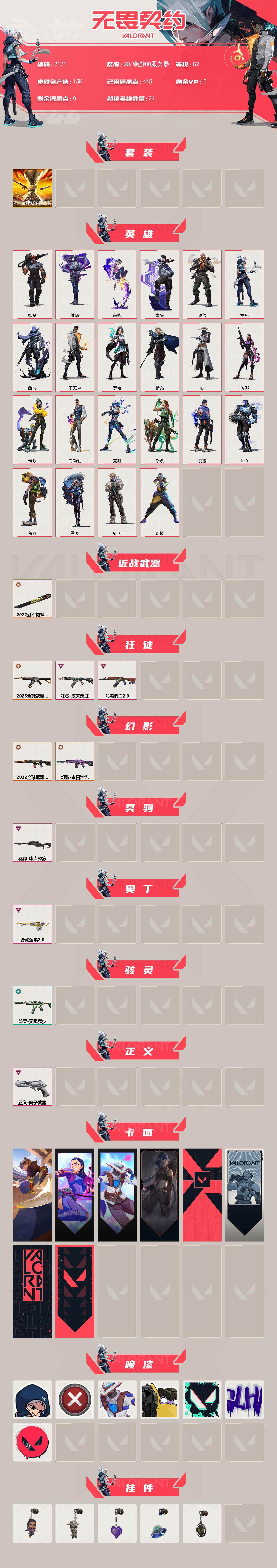 [16075521]【套装】:2022全球冠军赛套装 【英雄】:幻棱,炼狱,维斯,暮蝶,壹决,铁臂,捷风,幽影,不死鸟,贤者,猎枭,零,芮娜,奇乐,尚勃勒,霓虹,斯凯,夜露,k/o,盖可,黑梦,钢锁 【近战武器】:近战武器-2022全球冠军赛 蝴蝶刀 【狂徒】:狂徒-2025全球冠军赛,狂徒-般若假面//2.0,狂徒-堕天遗武 【幻影】:幻影-2022全球冠军赛,幻影-末日泡泡 【冥驹】:冥驹-冰点凝冻 【奥丁】:奥丁-紫阙金琅//2.0 【骇灵】:骇灵-无限竞技 【正义】:正义-离子武器 【卡面】:clutch 卡面,无畏契约go!第一卷:芮娜 卡面,无畏契约go!第一卷:零 卡面,《双城之战》金克丝 卡面,代号红色 卡面,新兵报到 卡面,v契约 卡面,无畏契约 卡面 【喷漆】:捷风差距 喷漆,买装还是存钱 喷漆,无畏契约go!第一卷:零 喷漆,放下武器 喷漆,胜利属于无畏契约 喷漆,glhf 喷漆,无畏契约 喷漆 【挂饰】:无畏契约go!第一卷 芮娜 挂饰,无畏契约go!第一卷 零 挂饰,薰衣草之心 挂饰,天外飞客 挂饰,无畏契约 纪念币 挂饰