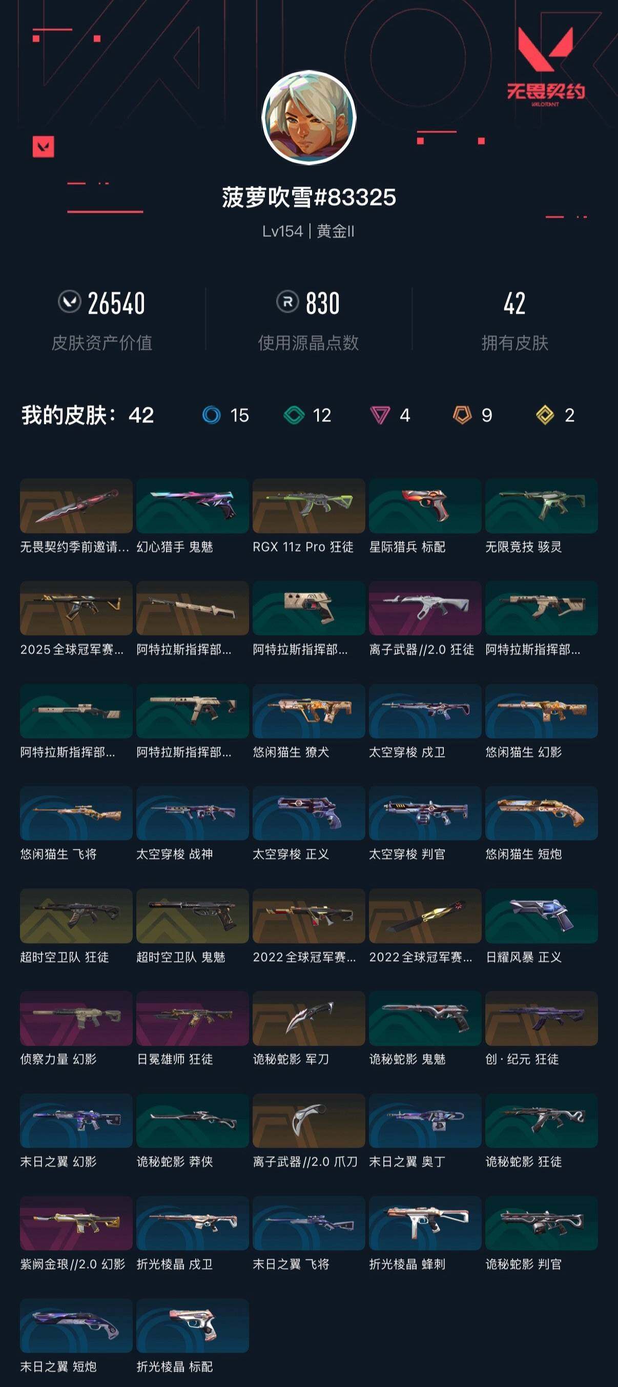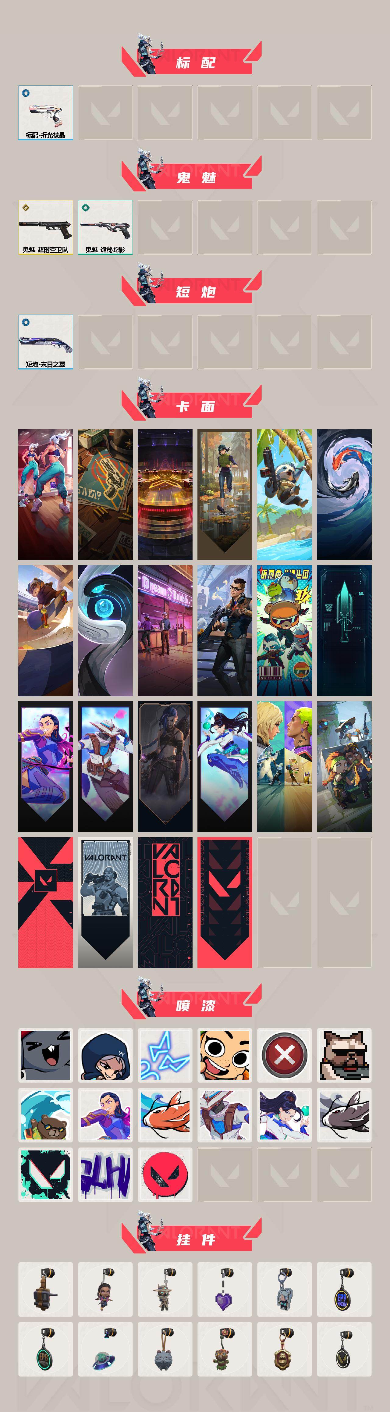 [16087794]【套装】:2022全球冠军赛套装,无畏契约季前邀请赛套装 【英雄】:幻棱,炼狱,维斯,暮蝶,钛狐,壹决,铁臂,捷风,雷兹,幽影,不死鸟,贤者,猎枭,蝰蛇,零,芮娜,奇乐,尚勃勒,霓虹,斯凯,夜露,星礈,k/o,海神,盖可,黑梦,钢锁 【近战武器】:近战武器-2022全球冠军赛 蝴蝶刀,近战武器-无畏契约季前邀请赛 悲悯之刃,近战武器-离子武器//2.0 爪刀,近战武器-诡秘蛇影 军刀,近战武器-阿特拉斯指挥部 甩棍 【狂徒】:狂徒-超时空卫队,狂徒-2025全球冠军赛,狂徒-创·纪元,狂徒-rgx 11z pro,狂徒-日冕雄师,狂徒-离子武器//2.0,狂徒-诡秘蛇影 【幻影】:幻影-2022全球冠军赛,幻影-侦察力量,幻影-紫阙金琅//2.0,幻影-末日之翼 【戍卫】:戍卫-折光棱晶 【飞将】:飞将-末日之翼 【莽侠】:莽侠-诡秘蛇影 【奥丁】:奥丁-末日之翼 【判官】:判官-诡秘蛇影 【骇灵】:骇灵-无限竞技 【蜂刺】:蜂刺-折光棱晶 【标配】:标配-折光棱晶 【鬼魅】:鬼魅-超时空卫队,鬼魅-诡秘蛇影 【短炮】:短炮-末日之翼 【卡面】:热舞环节 卡面,正义的化身 卡面,最高舞台 卡面,归乡 // 蝰蛇 卡面,树懒大作战 卡面,红鳞松叶 卡面,clutch 卡面,聚合之力 卡面,梦幻奶茶 卡面,西装暴徒 卡面,战术熊与伙伴们 卡面,零点嗅探设计图 卡面,无畏契约go!第一卷:芮娜 卡面,无畏契约go!第一卷:零 卡面,《双城之战》金克丝 卡面,无畏契约go!第一卷:贤者 卡面,钢锁vs盖可 卡面,别冒尖 卡面,代号红色 卡面,新兵报到 卡面,v契约 卡面,无畏契约 卡面 【喷漆】:超级粉丝 喷漆,捷风差距 喷漆,霓光四射 喷漆,要喝完噢! 喷漆,买装还是存钱 喷漆,关门放狗 喷漆,酷熊冲浪 喷漆,无畏契约go!第一卷:芮娜 喷漆,红鳞 喷漆,无畏契约go!第一卷:零 喷漆,无畏契约go!第一卷:贤者 喷漆,松叶 喷漆,胜利属于无畏契约 喷漆,glhf 喷漆,无畏契约 喷漆 【挂饰】:工具腰带 挂饰,无畏契约go!第一卷 芮娜 挂饰,无畏契约go!第一卷 零 挂饰,薰衣草之心 挂饰,袖珍捷风 挂饰,第九季//第一幕 纪念币 挂饰,第八季//第三幕 纪念币 挂饰,天外飞客 挂饰,《双城之战》魄罗 挂饰,呼啦熊 挂饰,海豹的认可 挂饰,无畏契约 纪念币 挂饰