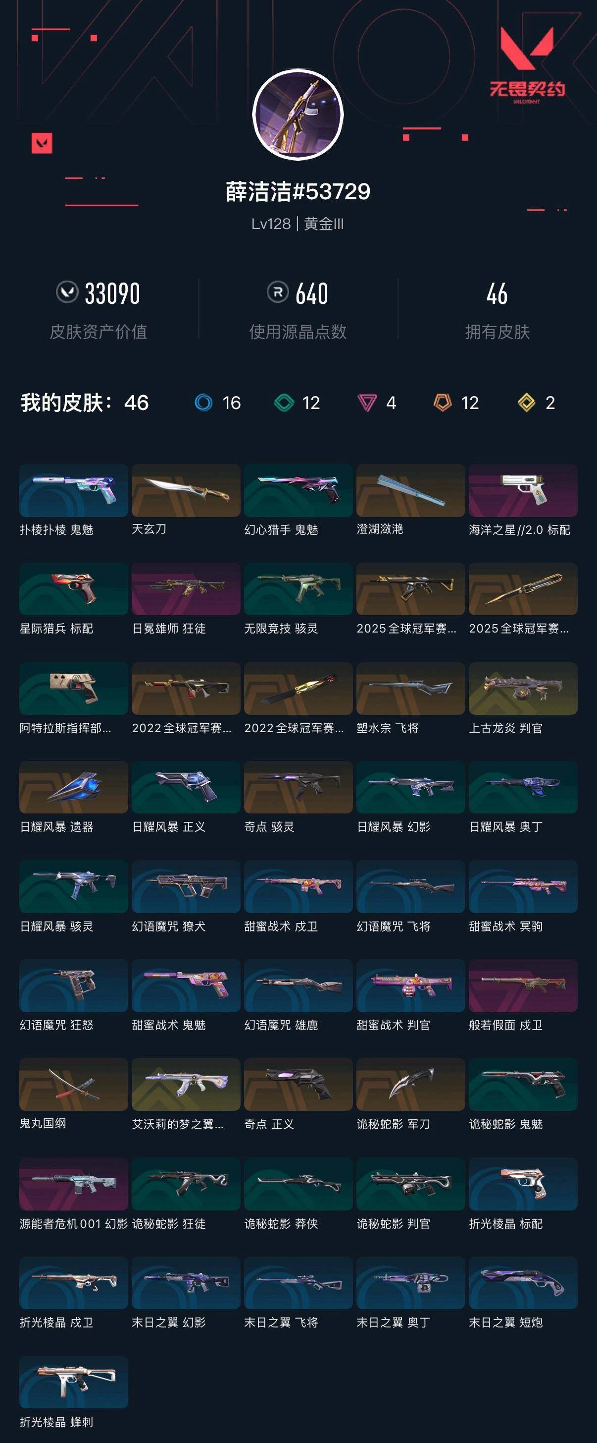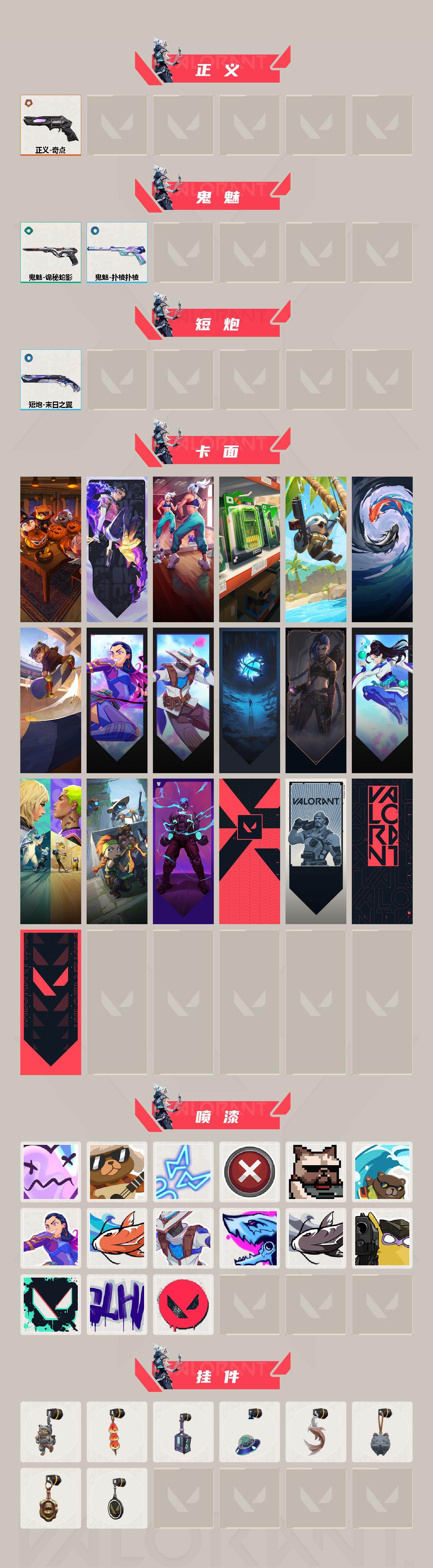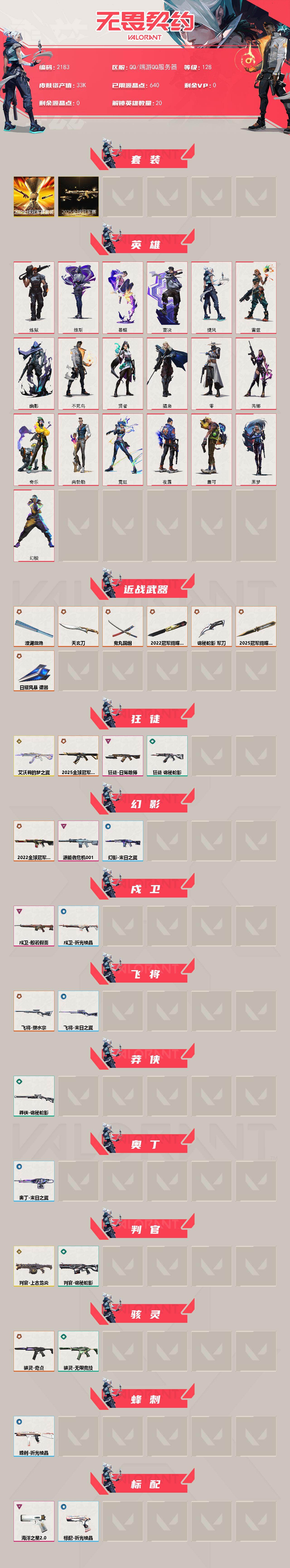 [16088409]【套装】:2025全球冠军赛套装,2022全球冠军赛套装 【英雄】:幻棱,炼狱,维斯,暮蝶,壹决,捷风,雷兹,幽影,不死鸟,贤者,猎枭,零,芮娜,奇乐,尚勃勒,霓虹,夜露,盖可,黑梦 【近战武器】:近战武器-2025全球冠军赛 蝴蝶刀,近战武器-2022全球冠军赛 蝴蝶刀,近战武器-澄湖潋滟,近战武器-鬼丸国纲,近战武器-天玄刀,近战武器-诡秘蛇影 军刀,近战武器-日耀风暴 遗器 【狂徒】:狂徒-艾沃莉的梦之翼,狂徒-2025全球冠军赛,狂徒-日冕雄师,狂徒-诡秘蛇影 【幻影】:幻影-2022全球冠军赛,幻影-源能者危机001,幻影-末日之翼 【戍卫】:戍卫-般若假面,戍卫-折光棱晶 【飞将】:飞将-塑水宗,飞将-末日之翼 【莽侠】:莽侠-诡秘蛇影 【奥丁】:奥丁-末日之翼 【判官】:判官-上古龙炎,判官-诡秘蛇影 【骇灵】:骇灵-奇点,骇灵-无限竞技 【蜂刺】:蜂刺-折光棱晶 【标配】:标配-海洋之星//2.0,标配-折光棱晶 【正义】:正义-奇点 【鬼魅】:鬼魅-诡秘蛇影,鬼魅-扑棱扑棱 【短炮】:短炮-末日之翼 【卡面】:南瓜盛典 卡面,无畏契约:暮蝶 卡面,热舞环节 卡面,超限闪存 卡面,树懒大作战 卡面,红鳞松叶 卡面,clutch 卡面,无畏契约go!第一卷:芮娜 卡面,无畏契约go!第一卷:零 卡面,无垠星环 卡面,《双城之战》金克丝 卡面,无畏契约go!第一卷:贤者 卡面,钢锁vs盖可 卡面,别冒尖 卡面,势不可挡//k/o 卡面,代号红色 卡面,新兵报到 卡面,v契约 卡面,无畏契约 卡面 【喷漆】:伤心心 喷漆,战术熊的巴拉莱卡琴 喷漆,霓光四射 喷漆,买装还是存钱 喷漆,关门放狗 喷漆,酷熊冲浪 喷漆,无畏契约go!第一卷:芮娜 喷漆,红鳞 喷漆,无畏契约go!第一卷:零 喷漆,暴走萝莉 喷漆,松叶 喷漆,放下武器 喷漆,胜利属于无畏契约 喷漆,glhf 喷漆,无畏契约 喷漆 【挂饰】:猫猫木乃伊 挂饰,糖葫芦 挂饰,动力机箱 挂饰,天外飞客 挂饰,红鳞松叶 挂饰,《双城之战》魄罗 挂饰,海豹的认可 挂饰,无畏契约 纪念币 挂饰