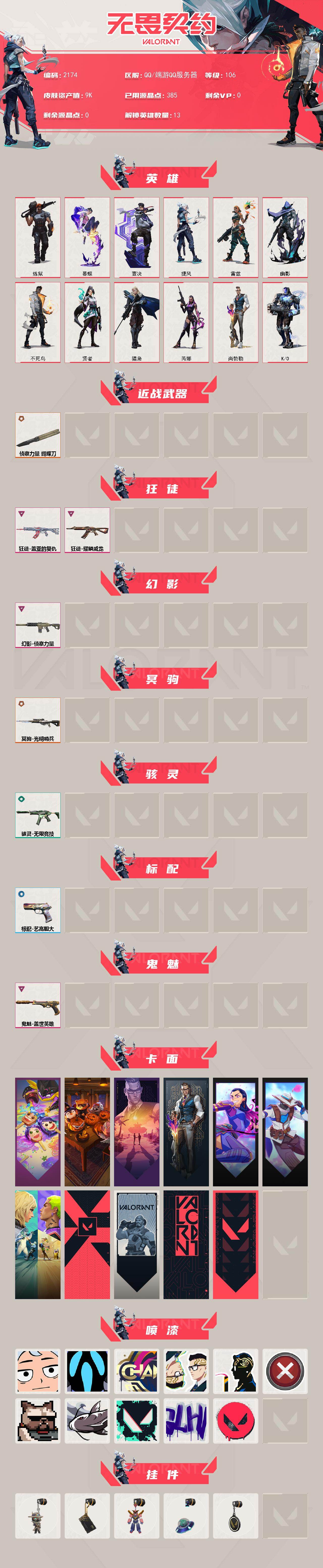 [16090314]【英雄】:炼狱,暮蝶,壹决,捷风,雷兹,幽影,不死鸟,贤者,猎枭,芮娜,尚勃勒,k/o 【近战武器】:近战武器-侦察力量 蝴蝶刀 【狂徒】:狂徒-盖亚的复仇,狂徒-耀鳞威龙 【幻影】:幻影-侦察力量 【冥驹】:冥驹-光明哨兵 【骇灵】:骇灵-无限竞技 【标配】:标配-艺高胆大 【鬼魅】:鬼魅-盖世英雄 【卡面】:瓦娃脸雪糕 p2 卡面,南瓜盛典 卡面,风险合作 卡面,无畏契约:尚勃勒 卡面,无畏契约go!第一卷:芮娜 卡面,无畏契约go!第一卷:零 卡面,钢锁vs盖可 卡面,代号红色 卡面,新兵报到 卡面,v契约 卡面,无畏契约 卡面 【喷漆】:又被闪了 喷漆,惊声尖叫 喷漆,尚勃勒 喷漆,分身有术 喷漆,致命优雅 喷漆,买装还是存钱 喷漆,关门放狗 喷漆,松叶 喷漆,胜利属于无畏契约 喷漆,glhf 喷漆,无畏契约 喷漆 【挂饰】:无畏契约go!第一卷 零 挂饰,有事联系 挂饰,迷你机甲 挂饰,天外飞客 挂饰,无畏契约 纪念币 挂饰