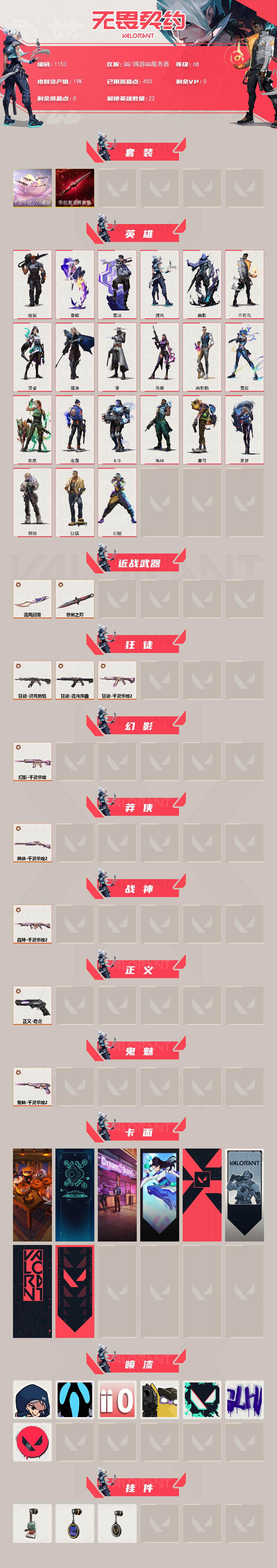 【套装】:无畏契约季前邀请赛套装,千灵华绽//2.0套装 【英雄】:幻棱,炼狱,暮蝶,钛狐,壹决,捷风,幽影,不死鸟,贤者,猎枭,零,芮娜,尚勃勒,霓虹,斯凯,夜露,k/o,海神,盖可,黑梦,钢锁 【近战武器】:近战武器-无畏契约季前邀请赛 悲悯之刃,近战武器-流风回雪 【狂徒】:狂徒-洪荒怒焰,狂徒-混沌序曲,狂徒-千灵华绽//2.0 【幻影】:幻影-千灵华绽 【莽侠】:莽侠-千灵华绽//2.0 【战神】:战神-千灵华绽//2.0 【正义】:正义-奇点 【鬼魅】:鬼魅-千灵华绽//2.0 【卡面】:南瓜盛典 卡面,声感陷阱设计图 卡面,梦幻奶茶 卡面,无畏契约go!第一卷:贤者 卡面,代号红色 卡面,新兵报到 卡面,v契约 卡面,无畏契约 卡面 【喷漆】:捷风差距 喷漆,惊声尖叫 喷漆,拼一呛 喷漆,放下武器 喷漆,胜利属于无畏契约 喷漆,glhf 喷漆,无畏契约 喷漆 【挂饰】:迷你浓缩 挂饰,第九季//第一幕 纪念币 挂饰,无畏契约 纪念币 挂饰