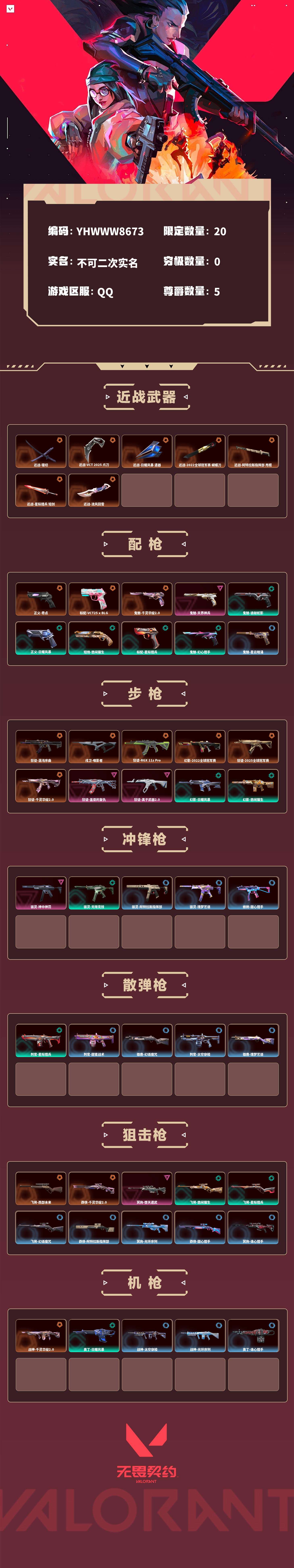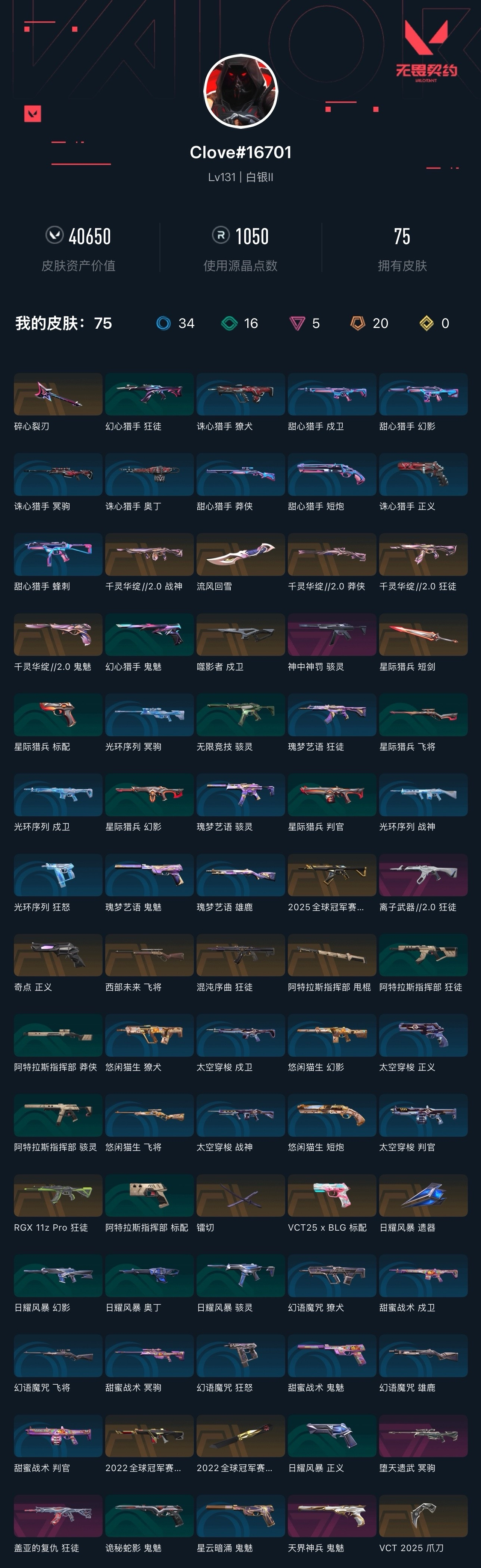 【无畏契约】【yhwww8673】等级:131,已用无畏点40650,已用源晶点1050,橙皮:狂徒-混沌序曲|正义-奇点|近战-镭切|标配-vct25 x blg|飞将-西部未来|近战-vct 2025 爪刀|戍卫-噬影者|近战-日耀风暴 遗器|狂徒-rgx 11z pro|近战-2022全球冠军赛 蝴蝶刀|幻影-2022全球冠军赛|近战-阿特拉斯指挥部 甩棍|近战-星际猎兵 短剑|狂徒-2025全球冠军赛|近战-流风回雪|莽侠-千灵华绽2.0|鬼魅-千灵华绽2.0|狂徒-千灵华绽2.0|战神-千灵华绽2.0__紫皮:鬼魅-天界神兵|狂徒-盖亚的复仇|冥驹-堕天遗武|狂徒-离子武器2.0|骇灵-神中神罚__段位:白银__绿皮:骇灵-无限竞技|鬼魅-诡秘蛇影|正义-日耀风暴|幻影-日耀风暴|奥丁-日耀风暴|短炮-悠闲猫生|飞将-悠闲猫生|幻影-悠闲猫生|獠犬-悠闲猫生|判官-星际猎兵|飞将-星际猎兵|标配-星际猎兵|狂徒-幻心猎手|鬼魅-幻心猎手__蓝皮:鬼魅-星云暗涌|鬼魅-甜蜜战术|判官-甜蜜战术|戍卫-甜蜜战术|雄鹿-幻语魔咒|獠犬-幻语魔咒|飞将-幻语魔咒|狂怒-幻语魔咒|正义-太空穿梭|战神-太空穿梭|判官-太空穿梭|戍卫-太空穿梭|骇灵-阿特拉斯指挥部|莽侠-阿特拉斯指挥部|标配-阿特拉斯指挥部|狂徒-阿特拉斯指挥部|狂怒-光环序列|戍卫-光环序列|冥驹-光环序列|战神-光环序列|狂徒-瑰梦艺语|鬼魅-瑰梦艺语|骇灵-瑰梦艺语|雄鹿-瑰梦艺语|蜂刺-甜心猎手|短炮-甜心猎手|莽侠-甜心猎手|幻影-甜心猎手|戍卫-甜心猎手|正义-诛心猎手|冥驹-诛心猎手|獠犬-诛心猎手|奥丁-诛心猎手__英雄:尚勃勒|维斯|黑梦|斯凯|暮蝶|盖可|霓虹|壹决|星礈|k/o|幽影|夜露|钢锁|海神|奇乐|炼狱|铁臂|贤者|猎枭|钛狐|芮娜|零|捷风|蝰蛇|不死鸟|幻棱|雷兹|禁灭