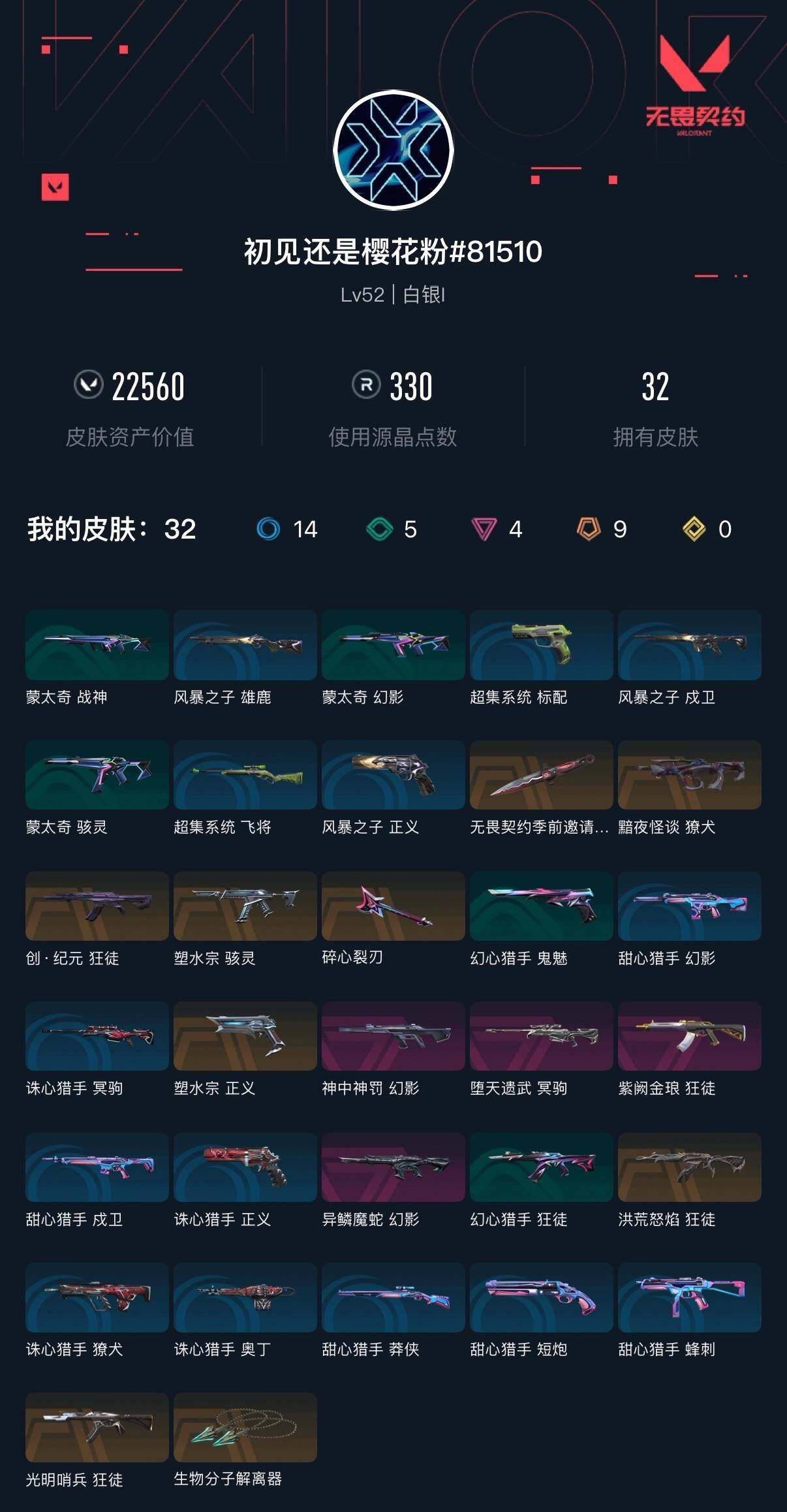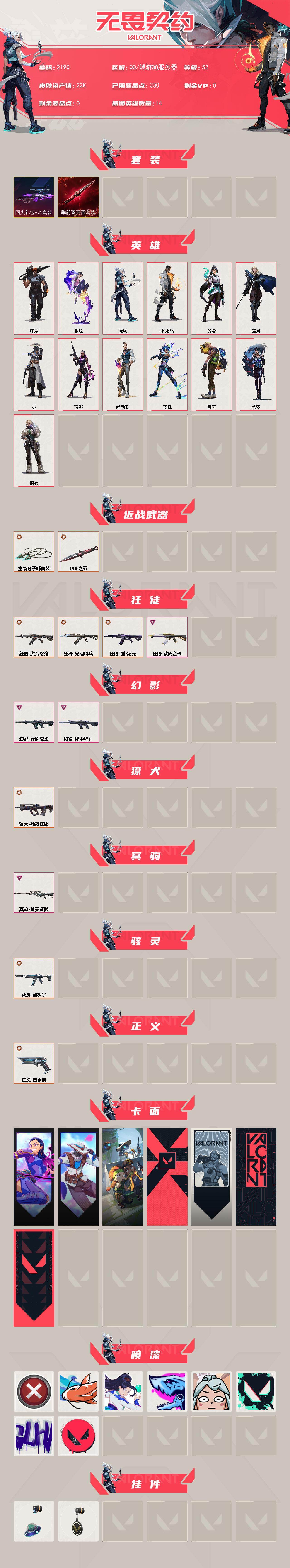 [16107804]【套装】:无畏契约季前邀请赛套装,回火礼包// v25套装 【英雄】:炼狱,暮蝶,捷风,不死鸟,贤者,猎枭,零,芮娜,尚勃勒,霓虹,盖可,黑梦,钢锁 【近战武器】:近战武器-无畏契约季前邀请赛 悲悯之刃,近战武器-生物分子解离器 【狂徒】:狂徒-光明哨兵,狂徒-洪荒怒焰,狂徒-创·纪元,狂徒-紫阙金琅 【幻影】:幻影-异鳞魔蛇,幻影-神中神罚 【獠犬】:獠犬-黯夜怪谈 【冥驹】:冥驹-堕天遗武 【骇灵】:骇灵-塑水宗 【正义】:正义-塑水宗 【卡面】:无畏契约go!第一卷:芮娜 卡面,无畏契约go!第一卷:零 卡面,别冒尖 卡面,代号红色 卡面,新兵报到 卡面,v契约 卡面,无畏契约 卡面 【喷漆】:买装还是存钱 喷漆,红鳞 喷漆,无畏契约go!第一卷:贤者 喷漆,暴走萝莉 喷漆,这招不行了 喷漆,胜利属于无畏契约 喷漆,glhf 喷漆,无畏契约 喷漆 【挂饰】:天外飞客 挂饰,无畏契约 纪念币 挂饰