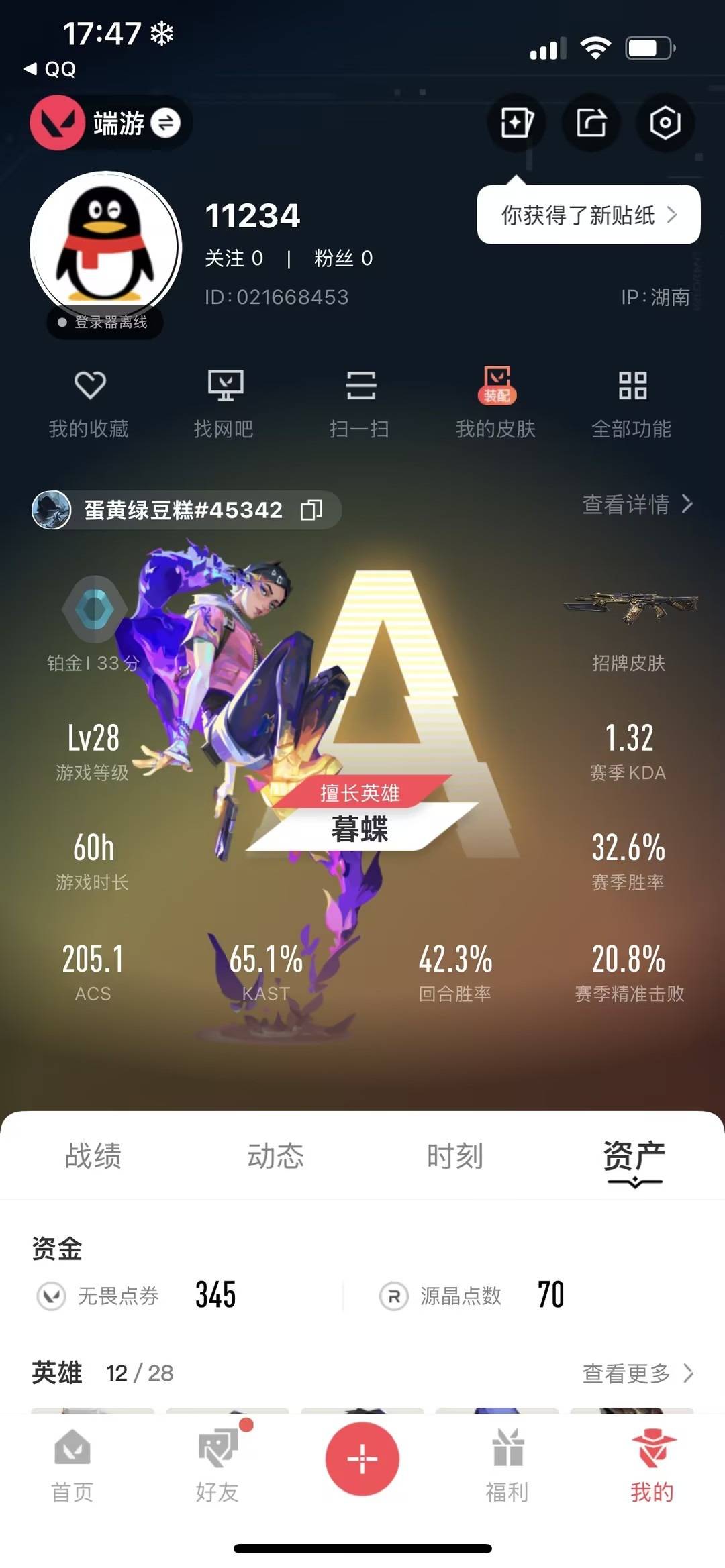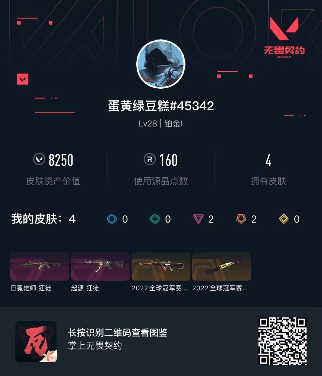 2橙皮 2紫皮 4皮肤 12英雄 22卡面 160已用源晶 铂金段位 【亮点皮肤】幻影-2022全球冠军赛蝴蝶刀-2022全球冠军赛 【套装】2022全球冠军赛 【步呛皮肤】狂徒-起源狂徒-日冕雄师 【挂饰】2022全球冠军赛弯檐帽挂饰双城之战魄罗挂饰