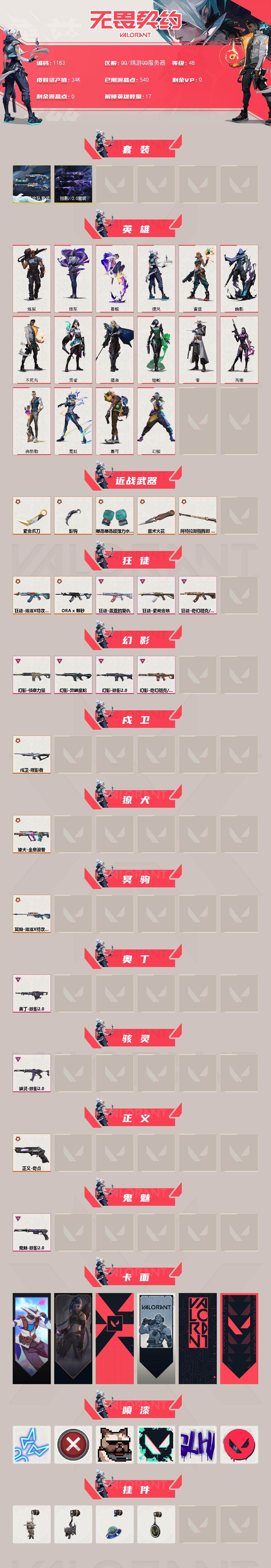 【套装】:滋滋x特攻队套装,掠影//2.0套装 【英雄】:幻棱,炼狱,维斯,暮蝶,捷风,雷兹,幽影,不死鸟,贤者,猎枭,蝰蛇,零,芮娜,尚勃勒,霓虹,盖可 【近战武器】:近战武器-魔术火花,近战武器-嘟昂嘟昂超弹力水球拳套,近战武器-影钩,近战武器-紫金爪刀,近战武器-阿特拉斯指挥部 甩棍,近战武器-魔术火花 【狂徒】:狂徒-滋滋x特攻队,狂徒-a x 颗秒,狂徒-盖亚的复仇,狂徒-紫阙金琅,狂徒-奇幻朋克//3.0 【幻影】:幻影-侦察力量,幻影-异鳞魔蛇,幻影-掠影//2.0,幻影-奇幻朋克//3.0 【戍卫】:戍卫-噬影者 【獠犬】:獠犬-全息波普 【冥驹】:冥驹-滋滋x特攻队 【奥丁】:奥丁-掠影//2.0 【骇灵】:骇灵-掠影//2.0 【正义】:正义-奇点 【鬼魅】:鬼魅-掠影//2.0 【卡面】:无畏契约go!第一卷:零 卡面,《双城之战》金克丝 卡面,代号红色 卡面,新兵报到 卡面,v契约 卡面,无畏契约 卡面 【喷漆】:霓光四射 喷漆,买装还是存钱 喷漆,关门放狗 喷漆,胜利属于无畏契约 喷漆,glhf 喷漆,无畏契约 喷漆 【挂饰】:无畏契约go!第一卷 零 挂饰,鱼骨头 挂饰,天外飞客 挂饰,无畏契约 纪念币 挂饰