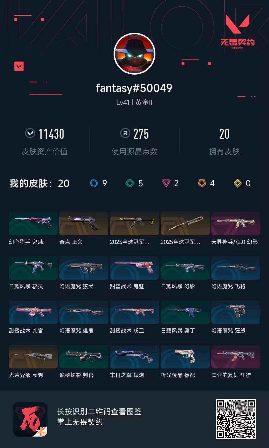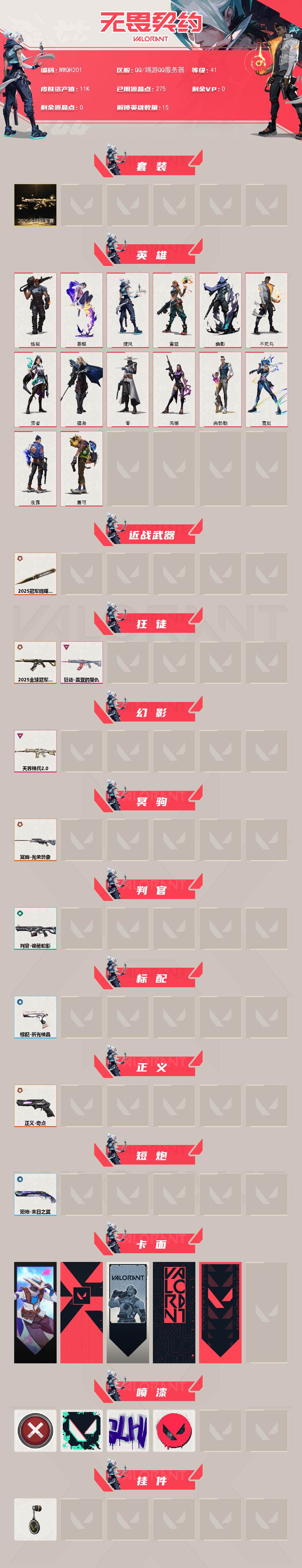 【wwqh201】终极4/卓越2/皮肤20/等级41/段位:黄金/2025全球冠军赛套装/炼狱/暮蝶/捷风/雷兹/幽影/不死鸟/贤者/猎枭/零/芮娜/尚勃勒/霓虹/夜露/盖可/近战武器-2025全球冠军赛 蝴蝶刀/狂徒-2025全球冠军赛/狂徒-盖亚的复仇/幻影-天界神兵//2.0/冥驹-光荣异象/判官-诡秘蛇影/标配-折光棱晶/正义-奇点/短炮-末日之翼/无畏契约go!第一卷:零 卡面/代号红色 卡面/新兵报到 卡面/v契约 卡面/无畏契约 卡面/买装还是存钱 喷漆/胜利属于无畏契约 喷漆/glhf 喷漆/无畏契约 喷漆/无畏契约 纪念币 挂饰