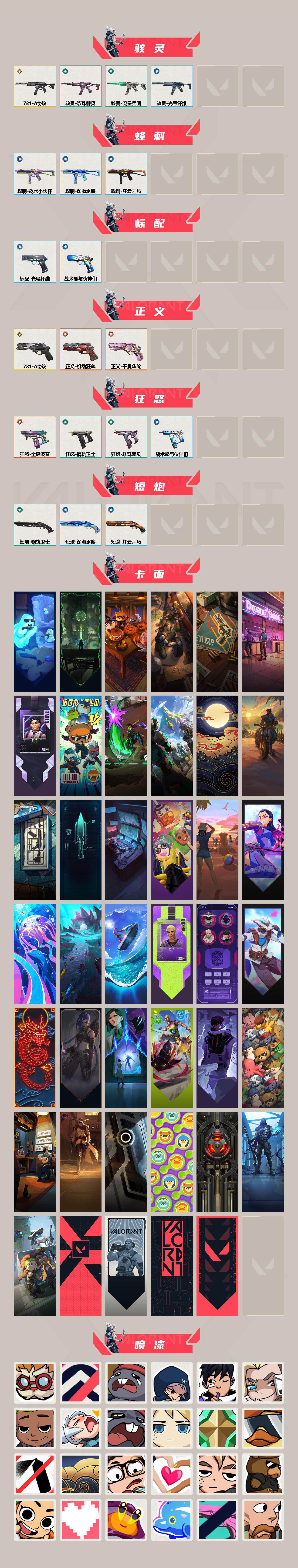 【套装】:781-a协议套装,千灵华绽套装 【英雄】:炼狱,维斯,暮蝶,壹决,铁臂,捷风,幽影,不死鸟,贤者,猎枭,蝰蛇,零,芮娜,奇乐,尚勃勒,霓虹,星礈,k/o,盖可,黑梦 【近战武器】:近战武器-侦察力量 蝴蝶刀,近战武器-落英飞旋,近战武器-个人近战单位,近战武器-魄月玄刃 【狂徒】:狂徒-冰点凝冻,狂徒-紫阙金琅 【幻影】:幻影-781-a协议,幻影-光明哨兵//2.0,幻影-千灵华绽,幻影-战术小伙伴 【戍卫】:戍卫-钢轨卫士,戍卫-珍珠棘贝,戍卫-战术熊与伙伴们 【獠犬】:獠犬-781-a协议,獠犬-战术小伙伴 【冥驹】:冥驹-千灵华绽,冥驹-起源,冥驹-复古浪潮 【飞将】:飞将-光导纤维,飞将-战术熊与伙伴们 【莽侠】:莽侠-纤云弄巧 【战神】:战神-深海水族 【奥丁】:奥丁-紫阙金琅//2.0,奥丁-战术小伙伴 【判官】:判官-千灵华绽 【雄鹿】:雄鹿-复古浪潮 【骇灵】:骇灵-781-a协议,骇灵-流星兵团,骇灵-珍珠棘贝,骇灵-光导纤维 【蜂刺】:蜂刺-深海水族,蜂刺-纤云弄巧,蜂刺-战术小伙伴 【标配】:标配-光导纤维,标配-战术熊与伙伴们 【正义】:正义-781-a协议,正义-机动狂飙,正义-千灵华绽 【狂怒】:狂怒-全息波普,狂怒-钢轨卫士,狂怒-珍珠棘贝,狂怒-战术熊与伙伴们 【短炮】:短炮-钢轨卫士,短炮-深海水族,短炮-纤云弄巧 【卡面】:精灵大战 卡面,欢迎来到底城 卡面,南瓜盛典 卡面,修车达人 卡面,正义的化身 卡面,梦幻奶茶 卡面,暮蝶工牌 卡面,战术熊与伙伴们 卡面,源能反应 卡面,流星兵团 卡面,纤云弄巧 卡面,暂别喧嚣 卡面,打造专属狂徒 卡面,零点嗅探设计图 卡面,夜班 卡面,瓦娃脸雪糕 卡面 ,沙雕爆能器 卡面,无畏契约go!第一卷:芮娜 卡面,深海水族 卡面,珍珠棘贝 卡面,复古浪潮 卡面,盖可工牌 卡面,清除名单 卡面,无畏契约go!第一卷:零 卡面,龍记 卡面,《双城之战》金克丝 卡面,蝰蛇vs幽影 卡面,势不可挡//盖可 卡面,逆向独行 卡面 ,同步耍酷 卡面,完美调谐 卡面 ,没有什么能逃过我的眼睛 卡面,光导纤维 卡面,战术小伙伴 卡面,钢轨卫士 卡面,暗呛 卡面,别冒尖 卡面,代号红色 卡面,新兵报到 卡面,v契约 卡面,无畏契约 卡面,781-a协议 卡面 【喷漆】:都算到了 喷漆,控场勿近 喷漆,熊抱 喷漆,捷风差距 喷漆,吸一口快乐 喷漆,永远的答案 喷漆,再来一次? 喷漆,别挡我的路! 喷漆,我的刀呢? 喷漆,当然可以 喷漆,流星兵团 喷漆,战术熊与伙伴们 喷漆,禁止喷漆 喷漆,纤云弄巧 喷漆,新潮流 喷漆,双人比心 喷漆,不予置评 喷漆,三熊合一 喷漆,要喝完噢! 喷漆,双击点赞 喷漆,珍珠棘贝 喷漆,深海水族 喷漆,禁止标配 喷漆 ,铁臂尴尬 喷漆,买装还是存钱 喷漆,醒狮贺春 喷漆,酷熊冲浪 喷漆,无畏契约go!第一卷:芮娜 喷漆,红鳞 喷漆,无畏契约go!第一卷:零 喷漆,无畏契约go!第一卷:捷风 喷漆,无畏契约go!第一卷:贤者 喷漆,暴走萝莉 喷漆,松叶 喷漆,无畏契约go!第一卷:奇乐 喷漆,旅行小熊 喷漆,战术小伙伴 喷漆,又一个梦幻组合 喷漆,是大风刮来的 喷漆 ,静电火花 喷漆 ,今天的潮声甚是喧嚣 喷漆 ,请你冷静点 喷漆 ,蕊形灯 喷漆,这是你掉的吗? 喷漆,省钱大师 喷漆 ,皇冠拉花 喷漆,该转点了 喷漆,胜利属于无畏契约 喷漆,glhf 喷漆,无畏契约 喷漆 【挂饰】:伞绳 挂饰,第九季//第三幕 纪念币 挂饰,鱼骨头 挂饰,第九季//第二幕 纪念币 挂饰,袖珍捷风 挂饰,z世代特饮 挂饰,迷你机甲 挂饰,荧光棒 挂饰,章鱼烧先生 挂饰,流星兵团 挂饰,云开见日 挂饰,第八季//第三幕 纪念币 挂饰,传世莲华 挂饰,扭结饼干 挂饰 ,珍珠棘贝 挂饰,深海水族 挂饰 ,第八季//第二幕 纪念币 挂饰 ,天外飞客 挂饰,好运福爪 挂饰,《双城之战》魄罗 挂饰,呼啦熊 挂饰,晒出笑脸 挂饰,瞄这里 挂饰,盆栽小友 挂饰,斑点小姐 挂饰,插电音乐 挂饰,第八季//第一幕 纪念币 挂饰,无畏契约 纪念币 挂饰