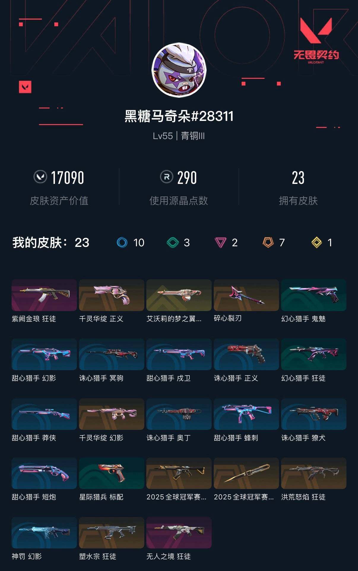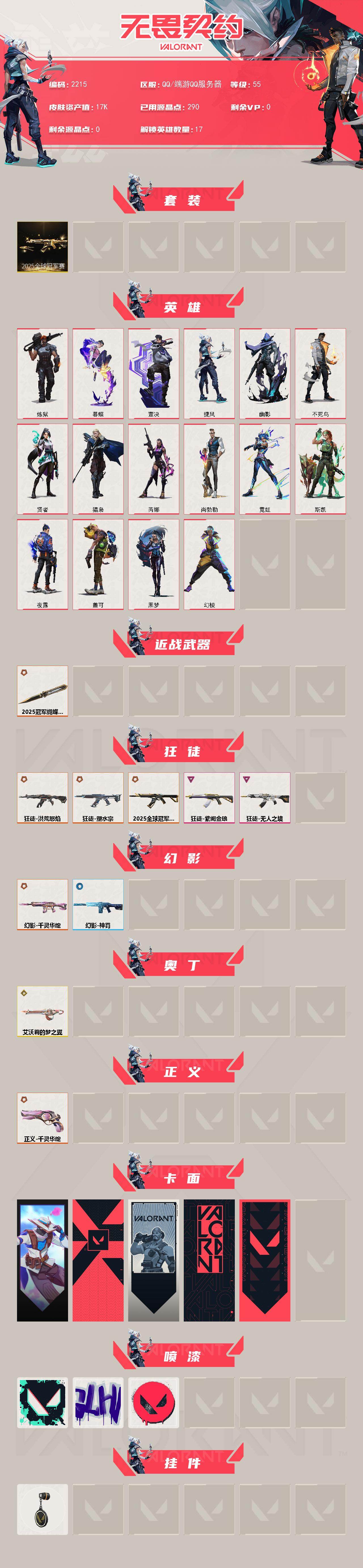 [16129747]【套装】:2025全球冠军赛套装 【英雄】:幻棱,炼狱,暮蝶,壹决,捷风,幽影,不死鸟,贤者,猎枭,芮娜,尚勃勒,霓虹,斯凯,夜露,盖可,黑梦 【近战武器】:近战武器-2025全球冠军赛 蝴蝶刀 【狂徒】:狂徒-2025全球冠军赛,狂徒-洪荒怒焰,狂徒-塑水宗,狂徒-无人之境,狂徒-紫阙金琅 【幻影】:幻影-千灵华绽,幻影-神罚 【奥丁】:奥丁-艾沃莉的梦之翼 【正义】:正义-千灵华绽 【卡面】:无畏契约go!第一卷:零 卡面,代号红色 卡面,新兵报到 卡面,v契约 卡面,无畏契约 卡面 【喷漆】:胜利属于无畏契约 喷漆,glhf 喷漆,无畏契约 喷漆 【挂饰】:无畏契约 纪念币 挂饰