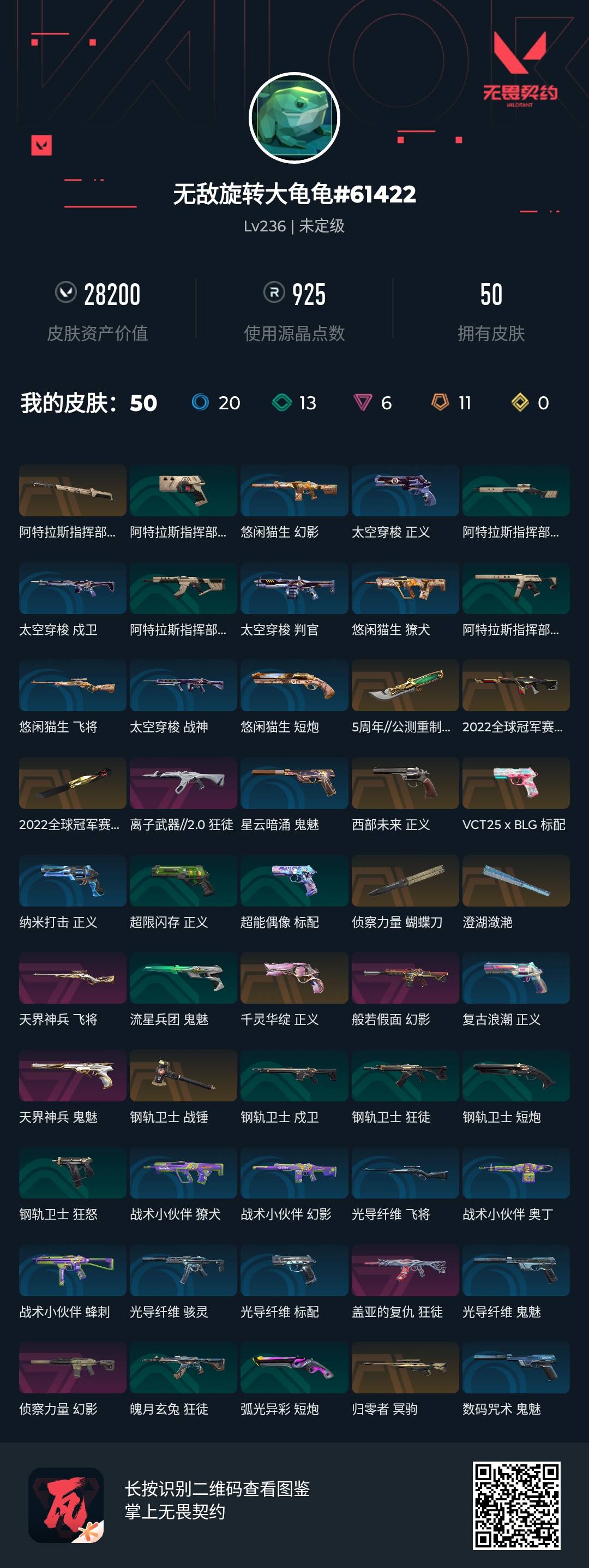 [16137461]s190630 (2022全球冠军赛套装)无畏契约/236等级/未定级/27英雄/50皮肤/资产28200/已使用r点925/剩余r点295/2022全球冠军赛-幻影,2022全球冠军赛-蝴蝶刀,离子武器//2.0-狂徒,盖亚的复仇-狂徒,侦察力量-幻影,般若假面-幻影,阿特拉斯指挥部-甩棍,5周年//公测重制版-苍龙之刃,澄湖潋滟,钢轨卫士-战锤,侦察力量-蝴蝶刀,归零者-冥驹,天界神兵-飞将,vct25-x-blg-标配,西部未来-正义,千灵华绽-正义,天界神兵-鬼魅
