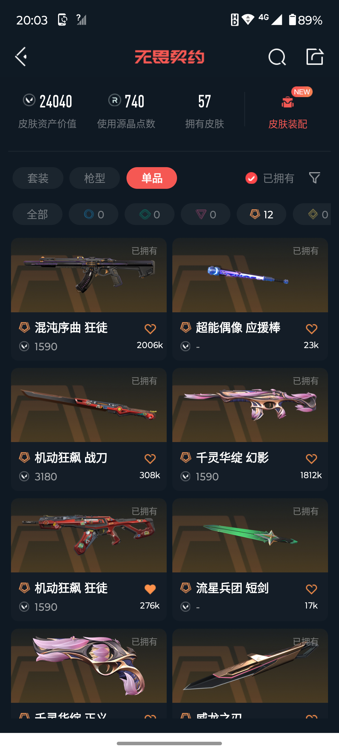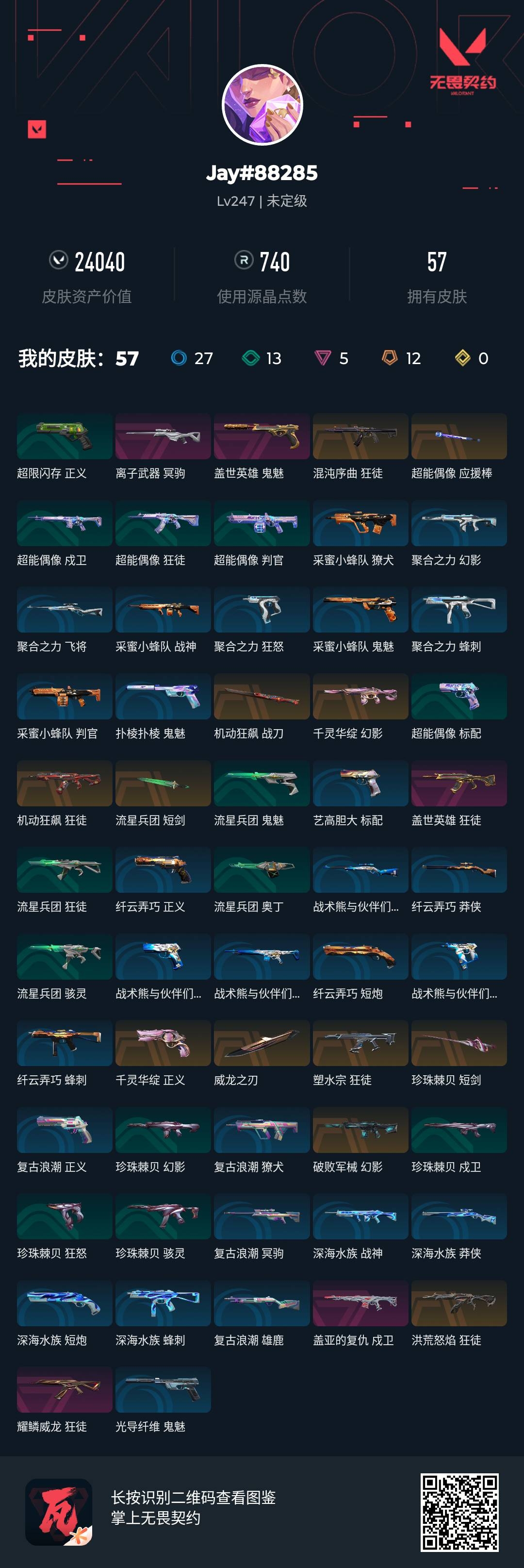 [16138470]q192855 无畏契约/等级247/段位未定级/英雄25/皮肤57/资产24040/已使用r点740/剩余r点10/超能偶像-应援棒,流星兵团-短剑,珍珠棘贝-短剑,机动狂飙-战刀,威龙之刃,混沌序曲-狂徒,千灵华绽-幻影,洪荒怒焰-狂徒,破败军械-幻影,塑水宗-狂徒,机动狂飙-狂徒,盖世英雄-狂徒,盖亚的复仇-戍卫,耀鳞威龙-狂徒-,离子武器-冥驹,千灵华绽-正义,盖世英雄-鬼魅