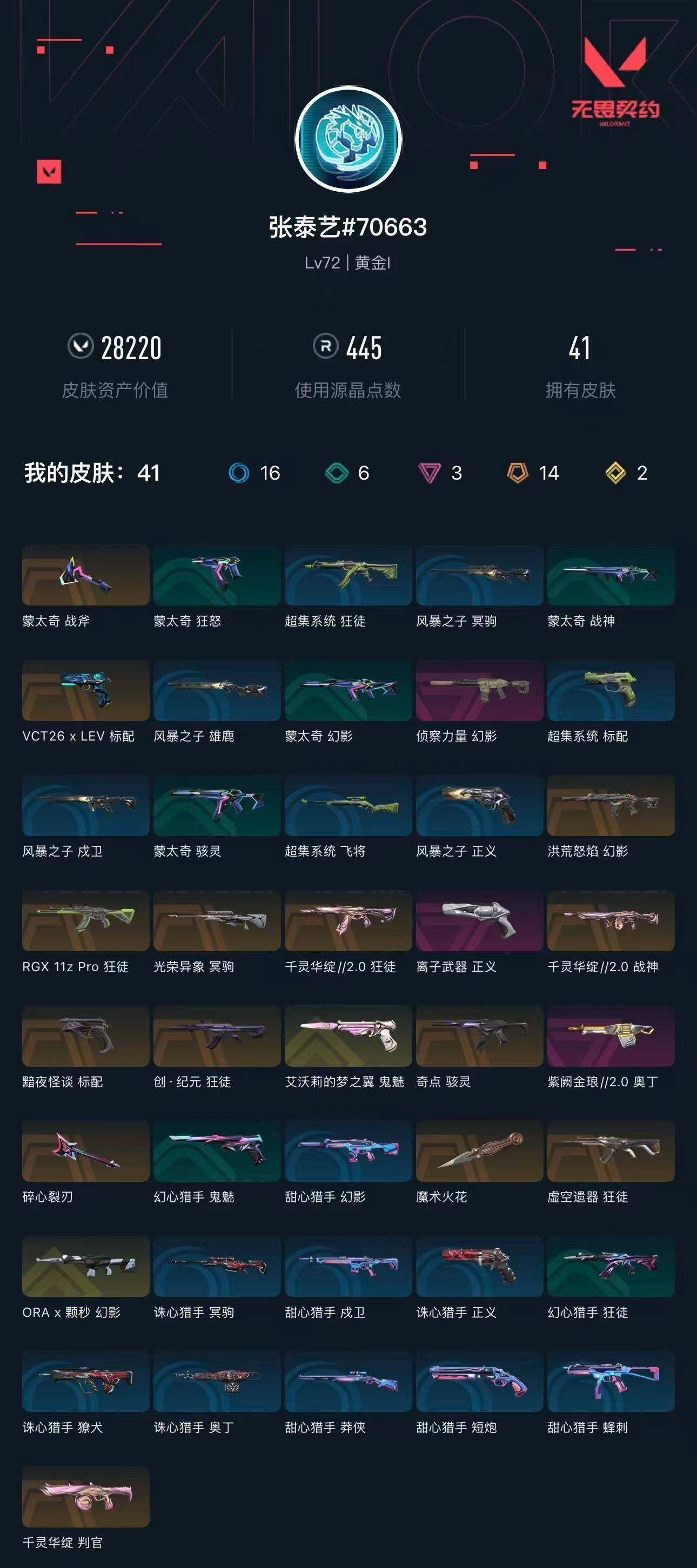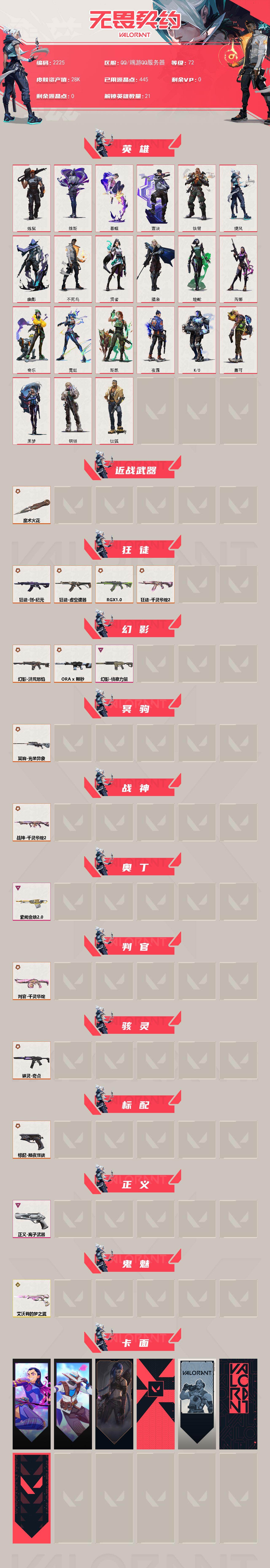 [16144373]【英雄】:炼狱,维斯,暮蝶,钛狐,壹决,铁臂,捷风,幽影,不死鸟,贤者,猎枭,蝰蛇,芮娜,奇乐,霓虹,斯凯,夜露,k/o,盖可,黑梦,钢锁 【近战武器】:近战武器-魔术火花,近战武器-魔术火花 【狂徒】:狂徒-创·纪元,狂徒-虚空遗器,狂徒-rgx 11z pro,狂徒-千灵华绽//2.0 【幻影】:幻影-洪荒怒焰,幻影-a x 颗秒,幻影-侦察力量 【冥驹】:冥驹-光荣异象 【战神】:战神-千灵华绽//2.0 【奥丁】:奥丁-紫阙金琅//2.0 【判官】:判官-千灵华绽 【骇灵】:骇灵-奇点 【标配】:标配-黯夜怪谈 【正义】:正义-离子武器 【鬼魅】:鬼魅-艾沃莉的梦之翼 【卡面】:无畏契约go!第一卷:芮娜 卡面,无畏契约go!第一卷:零 卡面,《双城之战》金克丝 卡面,代号红色 卡面,新兵报到 卡面,v契约 卡面,无畏契约 卡面 【喷漆】:霓光四射 喷漆,买装还是存钱 喷漆,关门放狗 喷漆,无畏契约go!第一卷:芮娜 喷漆,红鳞 喷漆,无畏契约go!第一卷:零 喷漆,无畏契约go!第一卷:贤者 喷漆,松叶 喷漆,放下武器 喷漆,胜利属于无畏契约 喷漆,glhf 喷漆,无畏契约 喷漆 【挂饰】:无畏契约go!第一卷 零 挂饰,天外飞客 挂饰,无畏契约 纪念币 挂饰
