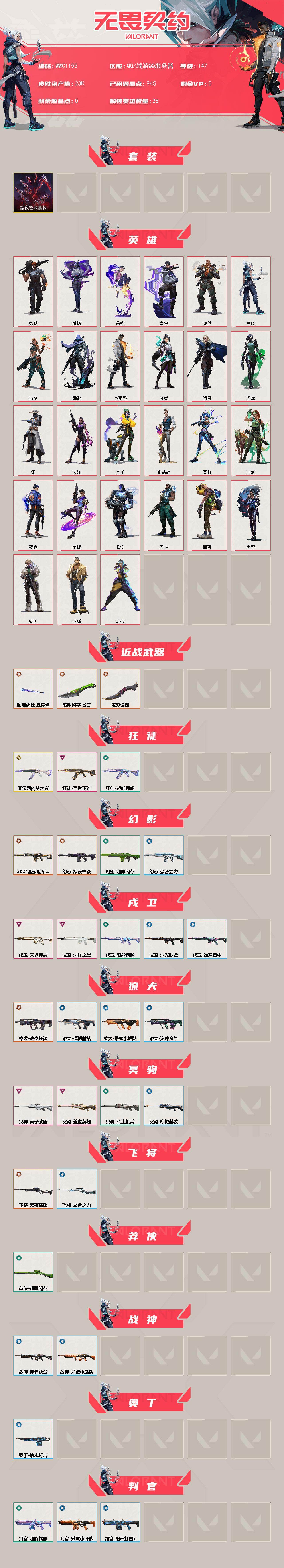 【wwc1155】终极9/传奇1/卓越6/皮肤52/等级147/段位:未定级/黯夜怪谈套装/幻棱/炼狱/维斯/暮蝶/钛狐/壹决/铁臂/捷风/雷兹/幽影/不死鸟/贤者/猎枭/蝰蛇/零/芮娜/奇乐/尚勃勒/霓虹/斯凯/夜露/星礈/k/o/海神/盖可/黑梦/钢锁/近战武器-超能偶像 应援棒/近战武器-超限闪存 匕首/近战武器-夜刃诡镰/狂徒-艾沃莉的梦之翼/狂徒-盖世英雄/狂徒-超能偶像/幻影-2024全球冠军赛/幻影-黯夜怪谈/幻影-超限闪存/幻影-聚合之力/戍卫-海洋之星/戍卫-天界神兵/戍卫-超能偶像/戍卫-浮光跃金/戍卫-逆冲蛮牛/獠犬-黯夜怪谈/獠犬-采蜜小蜂队/獠犬-模拟赫兹/獠犬-逆冲蛮牛/冥驹-盖世英雄/冥驹-离子武器/冥驹-荒土机兵/冥驹-模拟赫兹/飞将-黯夜怪谈/飞将-聚合之力/莽侠-超限闪存/战神-采蜜小蜂队/战神-浮光跃金/奥丁-纳米打击/判官-超能偶像/判官-采蜜小蜂队/判官-纳米打击x/雄鹿-模拟赫兹/雄鹿-逆冲蛮牛/骇灵-荒土机兵/骇灵-浮光跃金/蜂刺-超限闪存/蜂刺-聚合之力/标配-黯夜怪谈/标配-超能偶像/标配-荒土机兵/标配-浮光跃金/正义-奇点/正义-超限闪存/正义-沙尘幻旅/鬼魅-盖世英雄/鬼魅-流星兵团/鬼魅-采蜜小蜂队/鬼魅-模拟赫兹/鬼魅-宿怨/狂怒-聚合之力/狂怒-逆冲蛮牛/纳米打击 卡面/抑制技术 卡面/激斗汉堡 卡面/瓦娃脸雪糕 p2 卡面/荒土机兵 卡面/银弹猎手 卡面/逆冲蛮牛 卡面/《双城之战》拥抱 卡面/精灵大战 卡面/欢迎来到底城 卡面/南瓜盛典 卡面/vct cn首冠 卡面/唱片的故事 卡面/钢弓与箭弦 卡面/排除故障 卡面/战术桌游 卡面/悠享食光 卡面/修车达人 卡面/热舞环节 卡面/模拟赫兹 卡面/浮光跃金 卡面/超限闪存 卡面/维斯工牌 卡面/正义的化身 卡面/终章:生意人麦宝 卡面/铁之华 卡面/失而复得 卡面/时间到 卡面/最高舞台 卡面/复活专家 卡面/归乡 // 蝰蛇 卡面/超能偶像 卡面/生意人麦宝 卡面/声感陷阱设计图 卡面/红鳞松叶 卡面/钢锁工牌 卡面/战术小伙伴的夏日 卡面/采蜜小蜂队 卡面/聚合之力 卡面/梦幻奶茶 卡面/终章:打造专属狂徒 卡面/趁热吃 卡面/源能反应 卡面/零点嗅探设计图 卡面/无畏契约go!第一卷:芮娜 卡面/无畏契约go!第一卷:零 卡面/暗呛 卡面/终章:黑影先生的咖啡! 卡面/铁臂vs雷兹 卡面/夯实根基 卡面/"luie" 卡面/热烈欢迎 卡面/铁臂设计图 卡面/代号红色 卡面/冰淇淋店 卡面/新兵报到 卡面/友军火力 卡面/v契约 卡面/无畏契约 卡面/请求重启 喷漆/逆冲蛮牛 喷漆/纳米打击 喷漆/鼻尖上的蝴蝶 喷漆/简笔画黯兽 喷漆/独守蝰腹 喷漆/他们将落荒而逃 喷漆/通缉:战术企鹅 喷漆/荒土机兵 喷漆/别挡我吃球! 喷漆/嘭! 喷漆/都算到了 喷漆/控场勿近 喷漆/皮蛋呼呼 喷漆/像素星礈 喷漆/图谋不轨的零 喷漆/小丑猫 喷漆/模拟赫兹 喷漆/高丽风情小熊 喷漆/蹲到一个 喷漆/全力集中 喷漆/超限闪存 喷漆/rua一下 喷漆/熊抱 喷漆/蛋糕还是爆能器? 喷漆/高丽风情小虎 喷漆/记在小本本 喷漆/防弹企鹅 喷漆/高丽风情小蛙 喷漆/又被闪了 喷漆/终极羞辱 喷漆/超级粉丝 喷漆/黯兽卖萌 喷漆/捷风差距 喷漆/惊声尖叫 喷漆/五人成星 喷漆/超能偶像 喷漆/放我出去 喷漆/掩护我 喷漆/大佬发呛 喷漆/边缘试探 喷漆/拼一呛 喷漆/聚合之力 喷漆/采蜜小蜂队 喷漆/梦幻小队 喷漆/五个全都齐了 喷漆/我觉得不行 喷漆/我的刀呢? 喷漆/买装还是存钱 喷漆/蕊形灯 喷漆/凌空惊吓 喷漆/老铁困了 喷漆/口袋贤者 喷漆/胜利属于无畏契约 喷漆/glhf 喷漆/无畏契约 喷漆/猫猫木乃伊 挂饰/水壶 挂饰/纳米打击 挂饰/逆冲蛮牛 挂饰/可爱糖糖 挂饰/伞绳 挂饰/《双城之战》小蛋糕 挂饰/第九季//第三幕 纪念币 挂饰/拳击战术熊 挂饰/工具腰带 挂饰/暗藏猫腻 挂饰/高丽风情 挂饰/鱼骨头 挂饰/熔岩灯 挂饰/超限闪存 挂饰/瞬云履 挂饰/迷你k/o 挂饰/模拟赫兹 挂饰/第九季//第二幕 纪念币 挂饰/终章:这瓜保熟 挂饰/炼狱雪糕 挂饰/糖葫芦 挂饰/袖珍捷风 挂饰/冲上云霄 挂饰/超能偶像 挂饰/迷你浓缩 挂饰/这瓜保熟 挂饰/z世代特饮 挂饰/采蜜小蜂队 挂饰/第九季//第一幕 纪念币 挂饰/聚合之力 挂饰/终章:迷你机甲 挂饰/战术河童 挂饰/荧光棒 挂饰/第八季//第三幕 纪念币 挂饰/天外飞客 挂饰/第八季//第一幕 纪念币 挂饰/终章:高音谱号 挂饰/彩糖面包 挂饰/冬日絮语 挂饰/第七季//第三幕 纪念币 挂饰/幸运中国结 挂饰/第七季//第二幕 纪念币 挂饰/无畏契约 纪念币 挂饰
