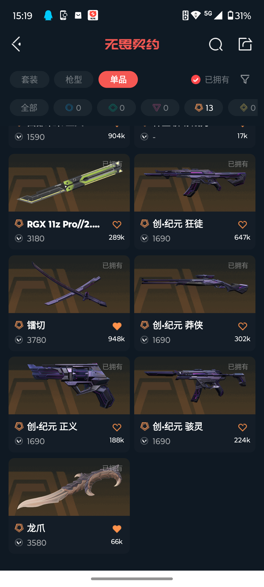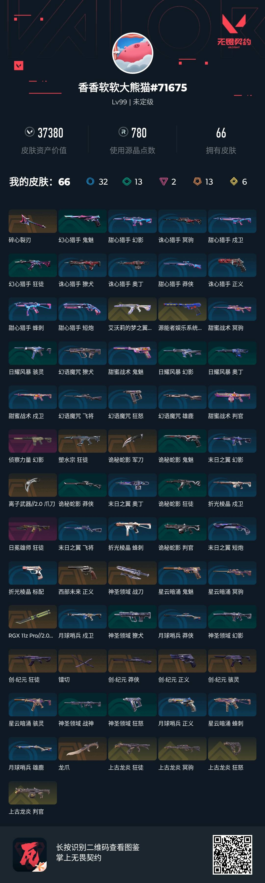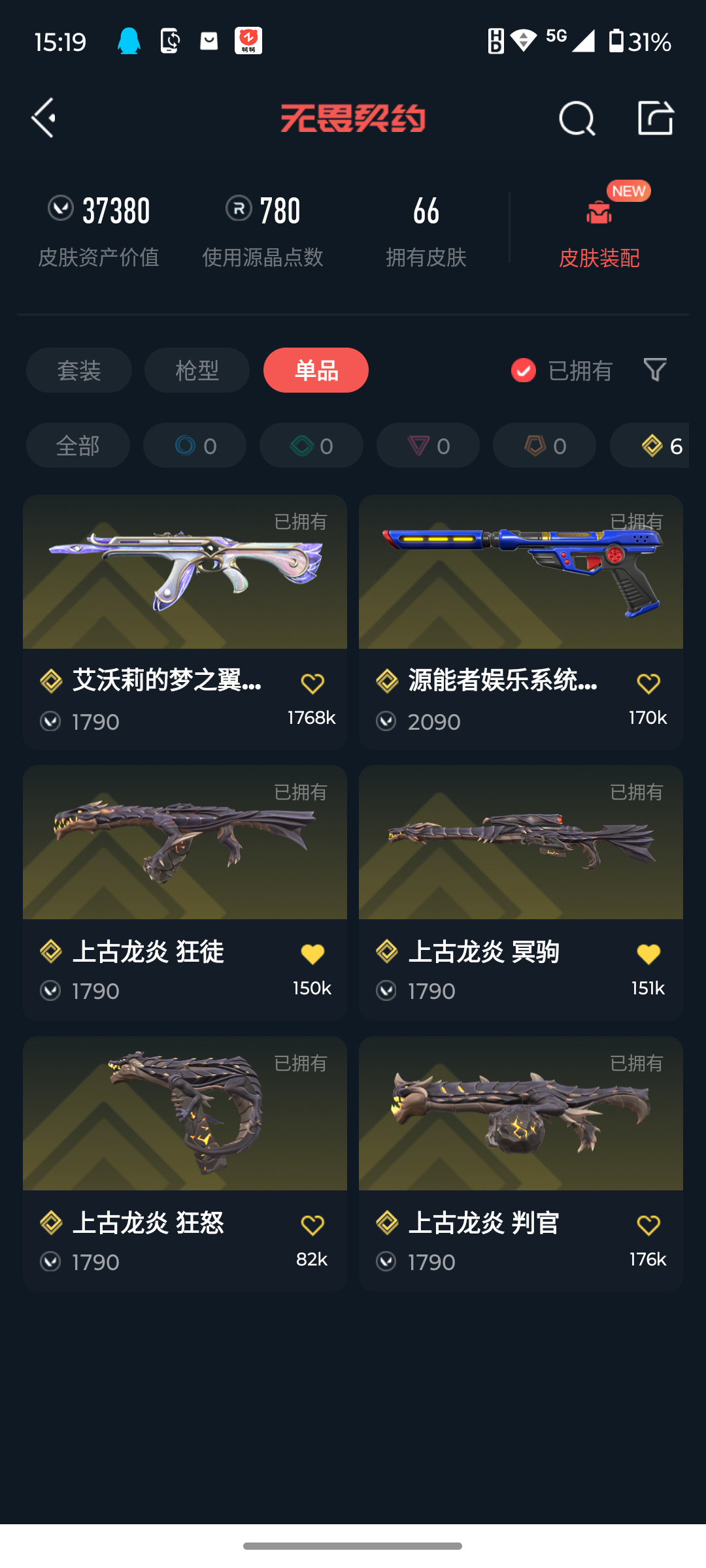 [16164485]q192378 (创纪元套装/上古龙炎套装)无畏契约/等级99/未定级/英雄16/皮肤66/资产37380/已使用r点780/剩余r点70/创·纪元-狂徒,创·纪元-莽侠,创·纪元-骇灵,创·纪元-正义,镭切,上古龙炎-狂徒,上古龙炎-冥驹,上古龙炎-判官,上古龙炎-狂怒,龙爪,碎心裂刃,诡秘蛇影-军刀,神圣领域-战刀,离子武器//2.0-爪刀,rgx-11z-pro//2.0-蝴蝶刀,塑水宗-狂徒,艾沃莉的梦之翼-狂徒,侦察力量-幻影,日冕雄师-狂徒,西部未来-正义,源能者娱乐系统-鬼魅