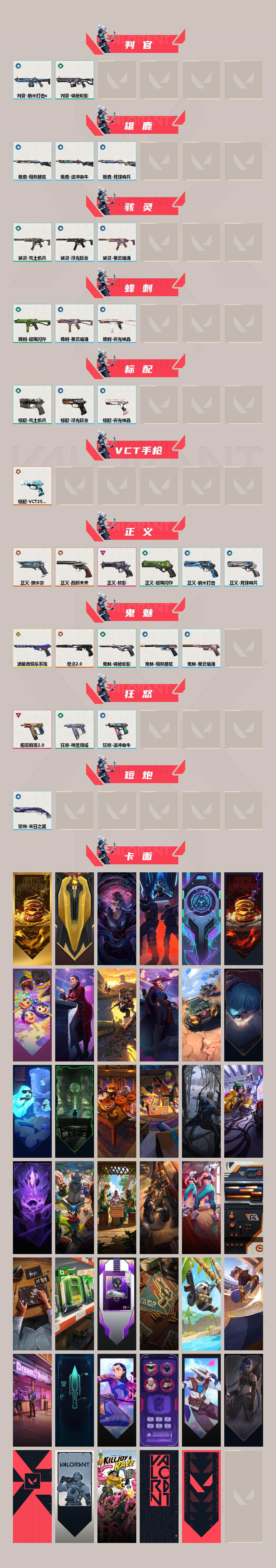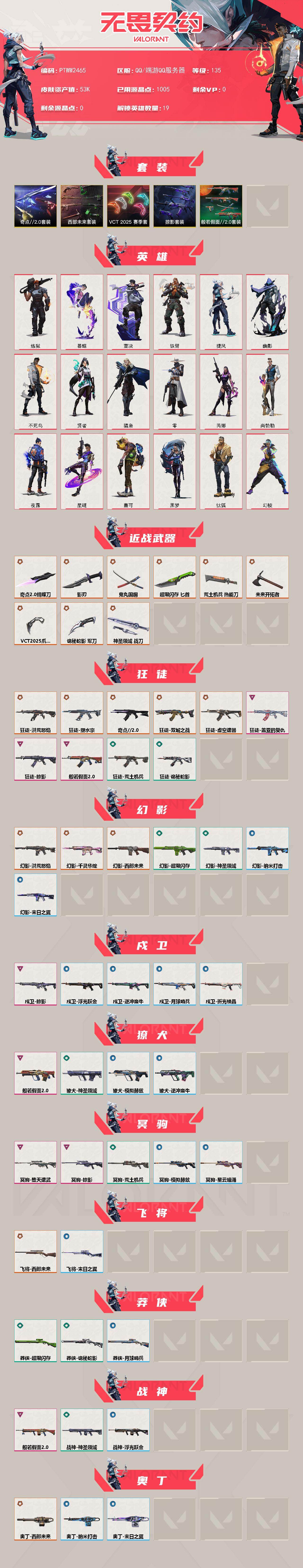 【套装】:vct 2025 赛季套装,西部未来套装,奇点//2.0套装,般若假面//2.0套装,掠影套装 【英雄】:幻棱,炼狱,暮蝶,钛狐,壹决,铁臂,捷风,幽影,不死鸟,贤者,猎枭,零,芮娜,尚勃勒,夜露,星礈,盖可,黑梦 【近战武器】:近战武器-奇点//2.0 蝴蝶刀,近战武器-vct 2025 爪刀,近战武器-鬼丸国纲,近战武器-未来开拓者,近战武器-超限闪存 匕首,近战武器-荒土机兵