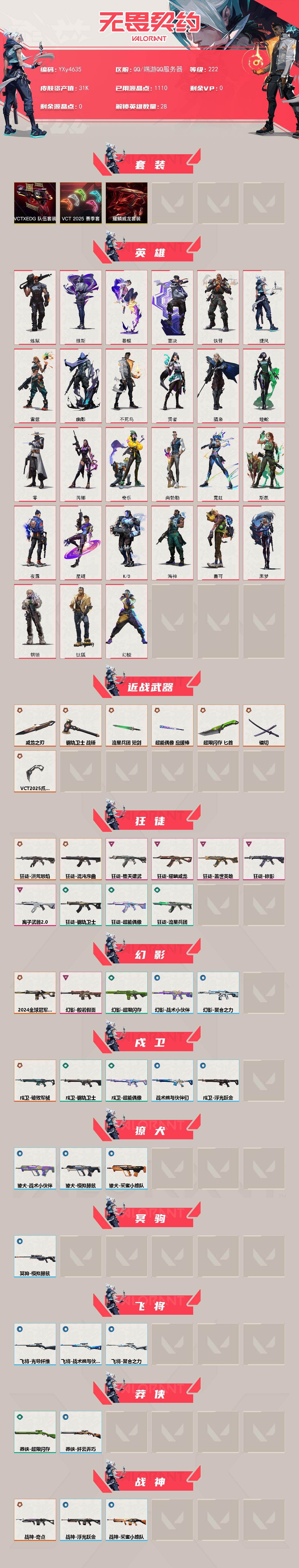 【3.1w库存vct爪刀.龙年套.镭切.七狂徒流脓.混沌.弃王.猴子.掠夺.24冠军幻影.恶鬼】y4635【无二次】【因赛季更新游戏段付以上号为准!】 【套装】:vct 2025 赛季套装,vctxedg 队伍套装,耀鳞威龙套装 【英雄】:幻棱,炼狱,维斯,暮蝶,钛狐,壹决,铁臂,捷风,雷兹,幽影,不死鸟,贤者,猎枭,蝰蛇,零,芮娜,奇乐,尚勃勒,霓虹,斯凯,夜露,星礈,k/o,海神,盖可