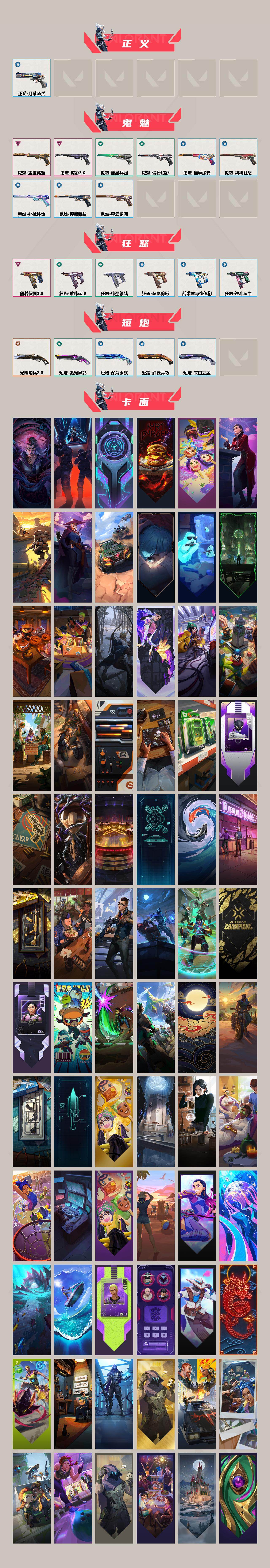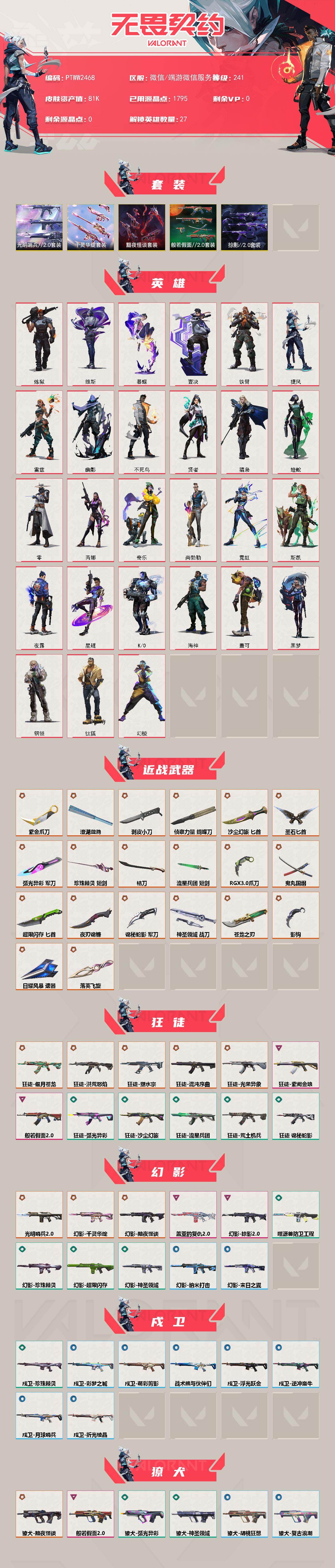 【套装】:千灵华绽套装,光明哨兵//2.0套装,黯夜怪谈套装,般若假面//2.0套装,掠影//2.0套装 【英雄】:幻棱,炼狱,维斯,暮蝶,钛狐,壹决,铁臂,捷风,雷兹,幽影,不死鸟,贤者,猎枭,蝰蛇,零,芮娜,奇乐,尚勃勒,霓虹,斯凯,夜露,星礈,k/o,海神,盖可,黑梦,钢锁 【近战武器】:近战武器-影钩,近战武器-5周年//公测重制版 苍龙之刃,近战武器-侦察力量 蝴蝶刀,近战武器-剥皮