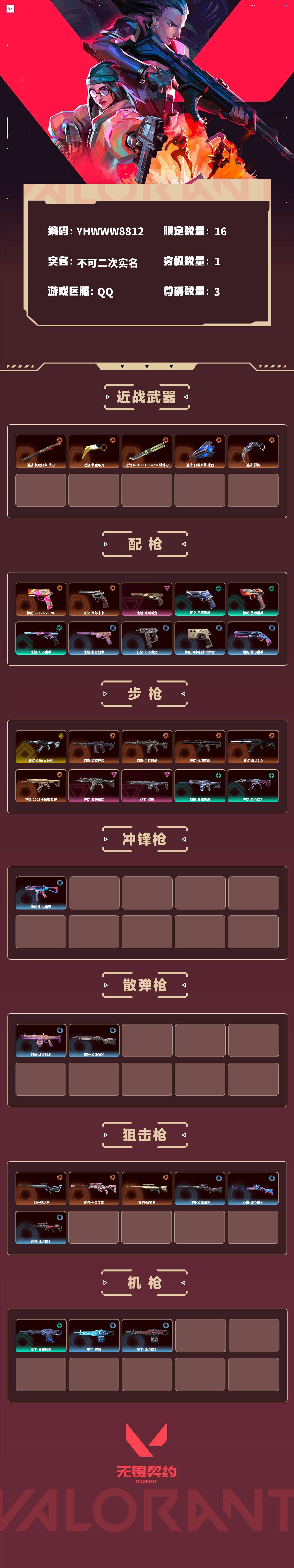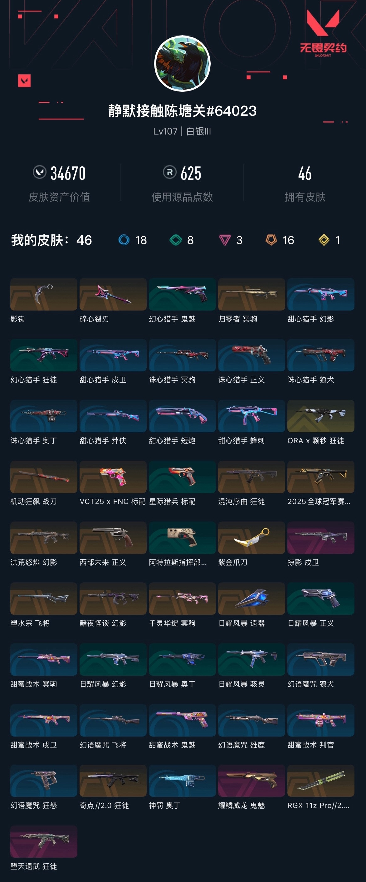 【无畏契约】【yhwww8812】等级:107,已用无畏点34670,已用源晶点625,橙皮:飞将-塑水宗|幻影-黯夜怪谈|幻影-洪荒怒焰|近战-机动狂飙 战刀|近战-紫金爪刀|狂徒-混沌序曲|冥驹-千灵华绽|冥驹-归零者|狂徒-奇点2.0|标配-vct25 x fnc|近战-rgx 11z pro2.0 蝴蝶刀|正义-西部未来|近战-日耀风暴 遗器|狂徒-2025全球冠军赛|近战-影钩__紫皮:鬼魅-耀鳞威龙|狂徒-堕天遗武|戍卫-掠影__段位:白银__蓝皮:奥丁-神罚|鬼魅-甜蜜战术|判官-甜蜜战术|戍卫-甜蜜战术|雄鹿-幻语魔咒|獠犬-幻语魔咒|飞将-幻语魔咒|狂怒-幻语魔咒|标配-阿特拉斯指挥部|蜂刺-甜心猎手|短炮-甜心猎手|莽侠-甜心猎手|幻影-甜心猎手|戍卫-甜心猎手|正义-诛心猎手|冥驹-诛心猎手|獠犬-诛心猎手|奥丁-诛心猎手__绿皮:正义-日耀风暴|幻影-日耀风暴|奥丁-日耀风暴|标配-星际猎兵|狂徒-幻心猎手|鬼魅-幻心猎手__英雄:尚勃勒|维斯|黑梦|斯凯|暮蝶|盖可|霓虹|壹决|星礈|k/o|幽影|夜露|钢锁|海神|奇乐|炼狱|铁臂|贤者|猎枭|钛狐|芮娜|零|捷风|蝰蛇|不死鸟|幻棱|雷兹|禁灭__金皮:狂徒-a x 颗秒