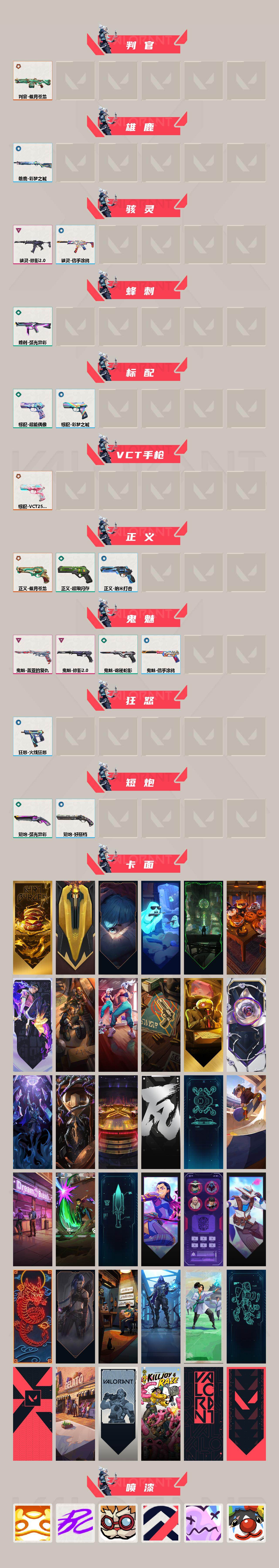 【套装】:2023全球冠军赛套装,偃月苍龙套装,盖亚的复仇套装,掠影//2.0套装 【英雄】:幻棱,炼狱,维斯,暮蝶,钛狐,壹决,铁臂,捷风,雷兹,幽影,不死鸟,贤者,猎枭,蝰蛇,零,芮娜,奇乐,尚勃勒,霓虹,斯凯,夜露,星礈,k/o,海神,盖可,黑梦,钢锁 【近战武器】:近战武器-2023全球冠军赛 苦无,近战武器-影钩,近战武器-rgx 11z pro//2.0 蝴蝶刀,近战武器-盖亚之怒,近战武器-弧光异彩 军刀,近战武器-偃月,近战武器-阿特拉斯指挥部 甩棍,近战武器-星际猎兵 短剑 【狂徒】:狂徒-2023全球冠军赛,狂徒-偃月苍龙,狂徒-光荣异象,狂徒-千灵华绽//2.0,狂徒-堕天遗武,狂徒-盖亚的复仇,狂徒-弧光异彩 【幻影】:幻影-毁灭骑士,幻影-般若假面,幻影-掠影//2.0,幻影-噬源兽防卫工程 【戍卫】:戍卫-盖亚的复仇,戍卫-彩梦之城 【獠犬】:獠犬-混沌序曲//2.0,獠犬-弧光异彩 【冥驹】:冥驹-偃月苍龙 【飞将】:飞将-盖亚的复仇,飞将-信手涂鸦 【莽侠】:莽侠-神中神罚 【奥丁】:奥丁-掠影//2.0,奥丁-信手涂鸦 【判官】:判官-偃月苍龙 【雄鹿】:雄鹿-彩梦之城 【骇灵】:骇灵-掠影//2.0,骇灵-信手涂鸦 【蜂刺】:蜂刺-弧光异彩 【标配】:标配-超能偶像,标配-彩梦之城 【vct手呛】:标配-vct25 x blg 【正义】:正义-偃月苍龙,正义-超限闪存,正义-纳米打击 【鬼魅】:鬼魅-盖亚的复仇,鬼魅-掠影//2.0,鬼魅-诡秘蛇影,鬼魅-信手涂鸦 【狂怒】:狂怒-火线狂怒 【短炮】:短炮-弧光异彩,短炮-好搭档 【卡面】:终章:激斗汉堡 卡面,进入射程 卡面,《双城之战》拥抱 卡面,精灵大战 卡面,欢迎来到底城 卡面,南瓜盛典 卡面,无畏契约:暮蝶 卡面,修车达人 卡面,热舞环节 卡面,正义的化身 卡面,终章:生意人麦宝 卡面,铁之华 卡面,失而复得 卡面,时间到 卡面,最高舞台 卡面,先瓦为敬 银色 卡面,声感陷阱设计图 卡面,clutch 卡面,梦幻奶茶 卡面,源能反应 卡面,零点嗅探设计图 卡面,无畏契约go!第一卷:芮娜 卡面,清除名单 卡面,无畏契约go!第一卷:零 卡面,龍记 卡面,《双城之战》金克丝 卡面,完美调谐 卡面 ,暗呛 卡面,夯实根基 卡面,铁臂设计图 卡面,代号红色 卡面,冰淇淋店 卡面,新兵报到 卡面,友军火力 卡面,v契约 卡面,无畏契约 卡面,2023洛杉矶全球冠军赛 卡面 【喷漆】:嗨宝南瓜灯 喷漆,嘭! 喷漆,都算到了 喷漆,控场勿近 喷漆,伤心心 喷漆,小丑猫 喷漆,熊抱 喷漆,超级粉丝 喷漆,捷风差距 喷漆,惊声尖叫 喷漆,拼一呛 喷漆,我的刀呢? 喷漆,新潮流 喷漆,买装还是存钱 喷漆,醒狮贺春 喷漆,酷熊冲浪 喷漆,无畏契约go!第一卷:芮娜 喷漆,红鳞 喷漆,无畏契约go!第一卷:零 喷漆,无畏契约go!第一卷:捷风 喷漆,无畏契约go!第一卷:贤者 喷漆,暴走萝莉 喷漆,松叶 喷漆,无畏契约go!第一卷:奇乐 喷漆,旅行小熊 喷漆,蕊形灯 喷漆,凌空惊吓 喷漆,老铁困了 喷漆,胜利属于无畏契约 喷漆,glhf 喷漆,无畏契约 喷漆 【挂饰】:v25第六幕:超凡 挂饰,终章:猫猫木乃伊 挂饰,悠闲鸡块 挂饰,伞绳 挂饰,《双城之战》小蛋糕 挂饰,第九季//第三幕 纪念币 挂饰,工具腰带 挂饰,无畏契约go!第一卷 芮娜 挂饰,无畏契约go!第一卷 零 挂饰,鱼骨头 挂饰,熔岩灯 挂饰,第九季//第二幕 纪念币 挂饰,终章:这瓜保熟 挂饰,糖葫芦 挂饰,袖珍捷风 挂饰,迷你浓缩 挂饰,第九季//第一幕 纪念币 挂饰,荧光棒 挂饰,第八季//第三幕 纪念币 挂饰,第八季//第二幕 纪念币 挂饰 ,天外飞客 挂饰,好运福爪 挂饰,红鳞松叶 挂饰,《双城之战》魄罗 挂饰,瞄这里 挂饰,第八季//第一幕 纪念币 挂饰,彩糖面包 挂饰,冬日絮语 挂饰,第七季//第三幕 纪念币 挂饰,第七季//第二幕 纪念币 挂饰,无畏契约 纪念币 挂饰