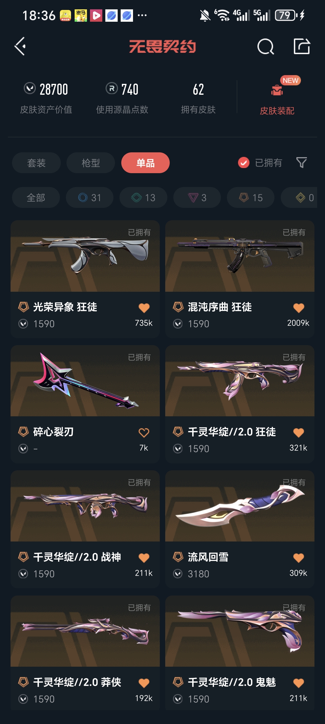 【千灵华绽//2.0套装 黯夜怪谈獠犬 末日泡泡冥驹 塑水宗狂徒 混沌序曲狂徒】【游戏等级】lv63 【段位】 白银i 【r点】740 【皮肤总价值】28700 【英雄数量】19 【皮肤数量】62 【挂饰数量】45 【卡面数量】77 【喷漆数量】71 【狂徒】狂徒-光荣异象 狂徒-混沌序曲 狂徒-幻心猎手 狂徒-千灵华绽//2.0 狂徒-多弥尔的复仇 狂徒-瑰梦艺语 狂徒-