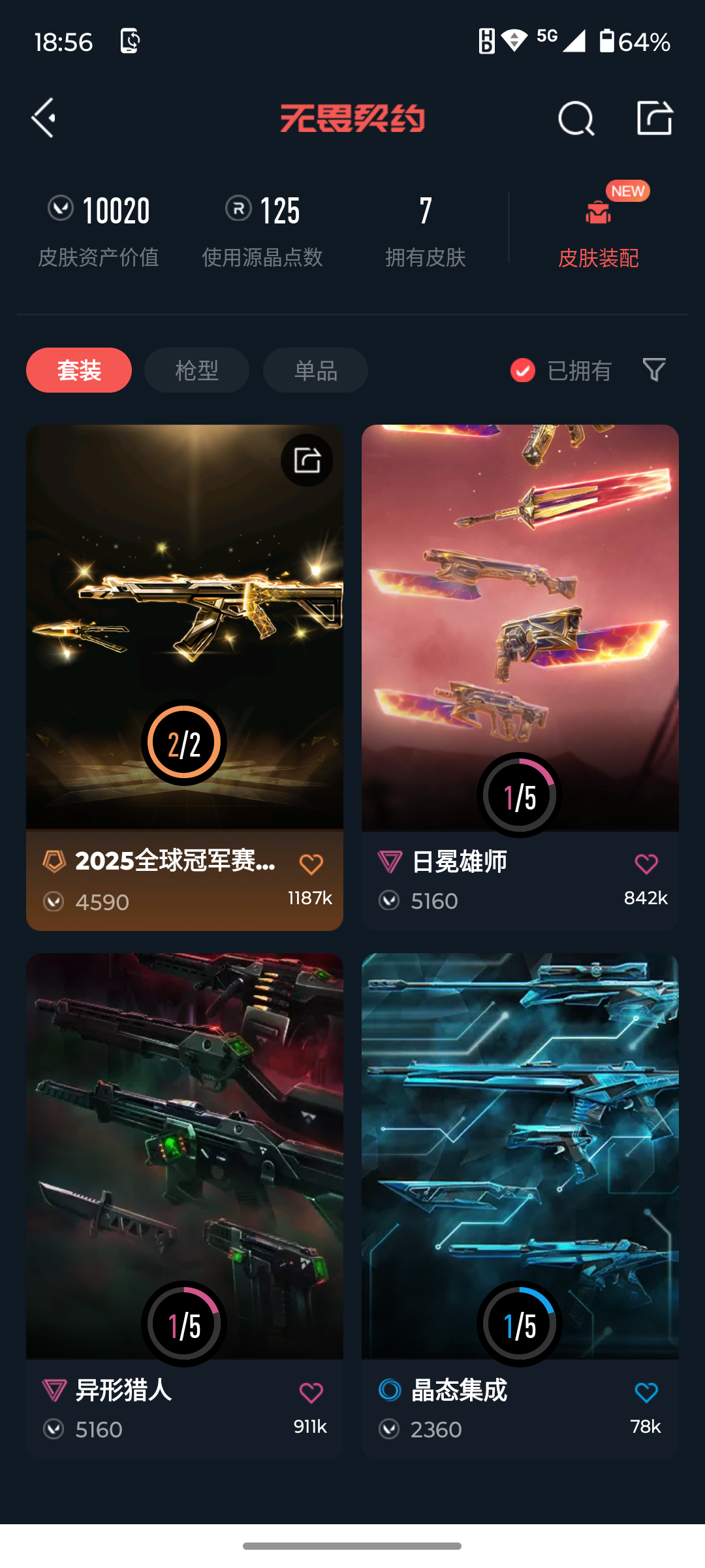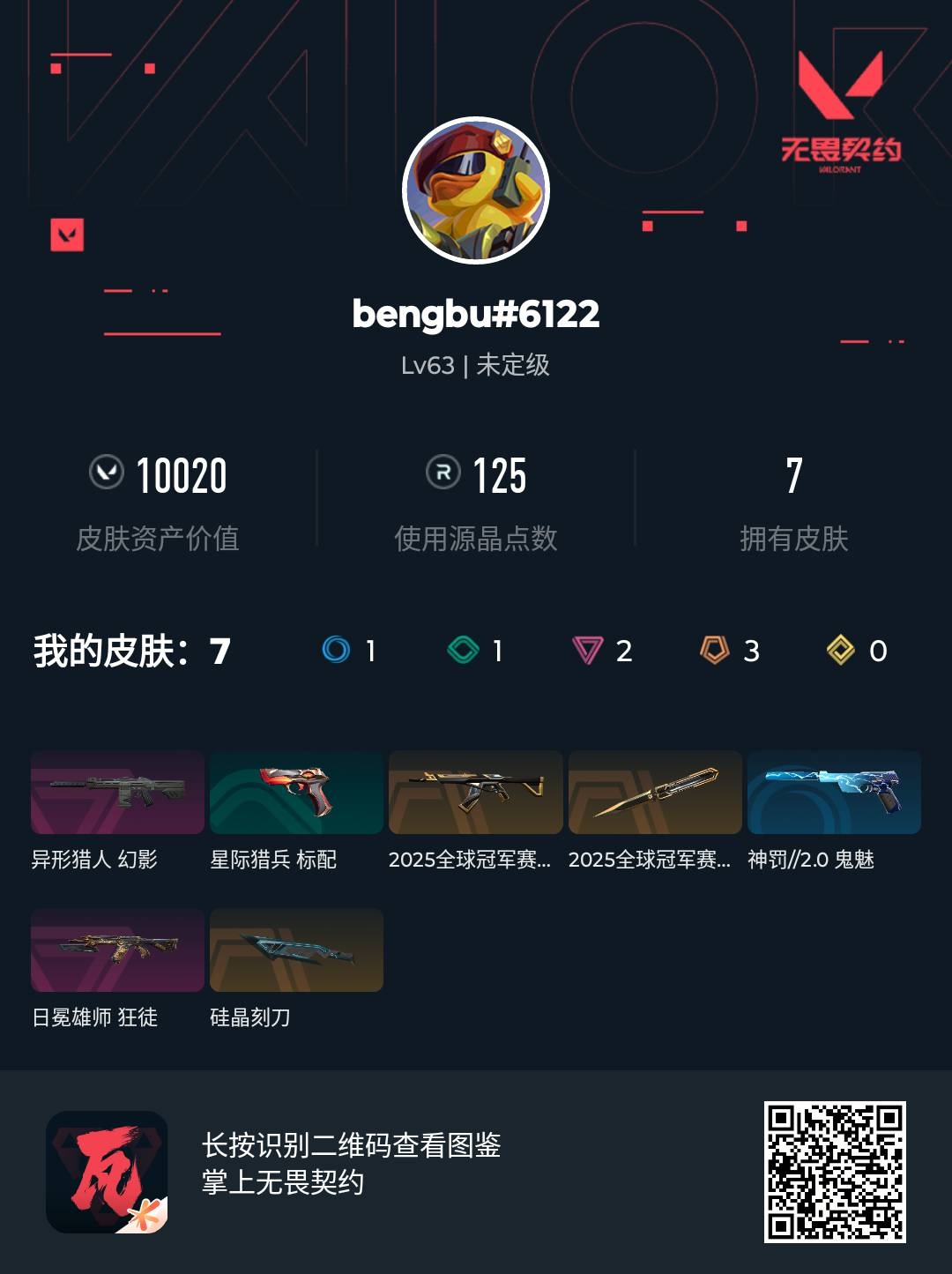 [16212537]s191732 (2025全球冠军赛套装)无畏契约/63等级/未定级/21英雄/7皮肤/资产10020/已使用r点125/剩余r点285/2025全球冠军赛-狂徒,2025全球冠军赛-蝴蝶刀,异形猎人-幻影,日冕雄师-狂徒,硅晶刻刀