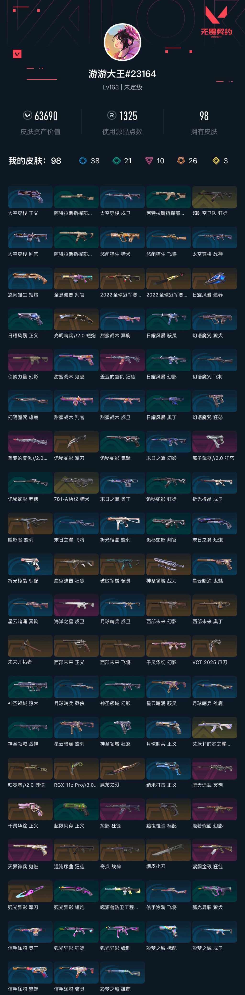 [16213842]【套装】:2022全球冠军赛套装,vct 2025 赛季套装,西部未来套装 【英雄】:幻棱,炼狱,维斯,暮蝶,钛狐,壹决,铁臂,捷风,雷兹,幽影,不死鸟,贤者,猎枭,蝰蛇,零,芮娜,奇乐,尚勃勒,霓虹,斯凯,夜露,星礈,k/o,海神,盖可,黑梦,钢锁 【近战武器】:近战武器-2022全球冠军赛 蝴蝶刀,近战武器-剥皮小刀,近战武器-vct 2025 爪刀,近战武器-rgx 11z pro//3.0 爪刀,近战武器-威龙之刃,近战武器-未来开拓者,近战武器-弧光异彩 军刀,近战武器-诡秘蛇影 军刀,近战武器-神圣领域 战刀,近战武器-日耀风暴 遗器 【狂徒】:狂徒-艾沃莉的梦之翼,狂徒-超时空卫队,狂徒-混沌序曲,狂徒-虚空遗器,狂徒-掠影,狂徒-盖亚的复仇,狂徒-紫阙金琅,狂徒-弧光异彩,狂徒-诡秘蛇影 【幻影】:幻影-2022全球冠军赛,幻影-千灵华绽,幻影-西部未来,幻影-般若假面,幻影-侦察力量,幻影-噬源兽防卫工程,幻影-神圣领域,幻影-末日之翼,幻影-西部未来 【戍卫】:戍卫-海洋之星,戍卫-彩梦之城,戍卫-月球哨兵,戍卫-折光棱晶 【獠犬】:獠犬-781-a协议,獠犬-弧光异彩,獠犬-神圣领域 【冥驹】:冥驹-堕天遗武,冥驹-星云暗涌 【飞将】:飞将-西部未来,飞将-信手涂鸦,飞将-末日之翼 【莽侠】:莽侠-归零者//2.0,莽侠-诡秘蛇影,莽侠-月球哨兵 【战神】:战神-奇点,战神-神圣领域 【奥丁】:奥丁-西部未来,奥丁-信手涂鸦,奥丁-末日之翼 【判官】:判官-全息波普,判官-诡秘蛇影 【雄鹿】:雄鹿-盖亚的复仇//2.0,雄鹿-彩梦之城,雄鹿-月球哨兵 【骇灵】:骇灵-破败军械,骇灵-信手涂鸦,骇灵-星云暗涌 【蜂刺】:蜂刺-噬影者,蜂刺-弧光异彩,蜂刺-星云暗涌,蜂刺-折光棱晶 【标配】:标配-黯夜怪谈,标配-彩梦之城,标配-折光棱晶 【正义】:正义-千灵华绽,正义-西部未来,正义-超限闪存,正义-纳米打击,正义-月球哨兵 【鬼魅】:鬼魅-天界神兵,鬼魅-诡秘蛇影,鬼魅-信手涂鸦,鬼魅-星云暗涌 【狂怒】:狂怒-离子武器//2.0,狂怒-神圣领域 【短炮】:短炮-光明哨兵//2.0,短炮-弧光异彩,短炮-末日之翼 【卡面】:终章:激斗汉堡 卡面,进入射程 卡面,《双城之战》拥抱 卡面,精灵大战 卡面,欢迎来到底城 卡面,南瓜盛典 卡面,修车达