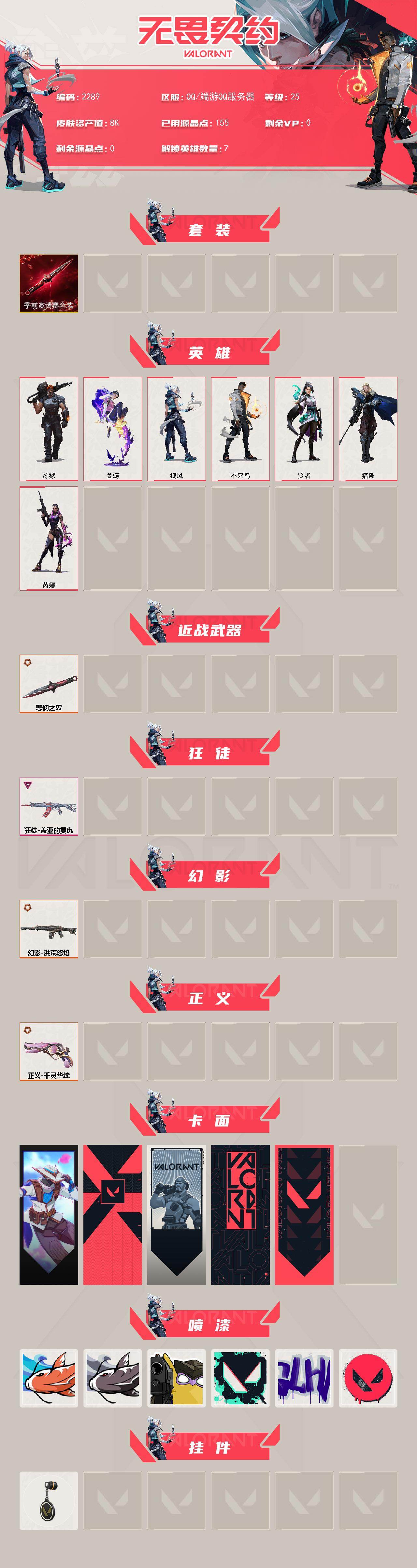 [16213924]【套装】:无畏契约季前邀请赛套装 【英雄】:炼狱,暮蝶,捷风,不死鸟,贤者,猎枭,芮娜 【近战武器】:近战武器-无畏契约季前邀请赛 悲悯之刃 【狂徒】:狂徒-盖亚的复仇 【幻影】:幻影-洪荒怒焰 【正义】:正义-千灵华绽 【卡面】:无畏契约go!第一卷:零 卡面,代号红色 卡面,新兵报到 卡面,v契约 卡面,无畏契约 卡面 【喷漆】:红鳞 喷漆,松叶 喷漆,放下武器 喷漆,胜利属于无畏契约 喷漆,glhf 喷漆,无畏契约 喷漆 【挂饰】:无畏契约 纪念币 挂饰