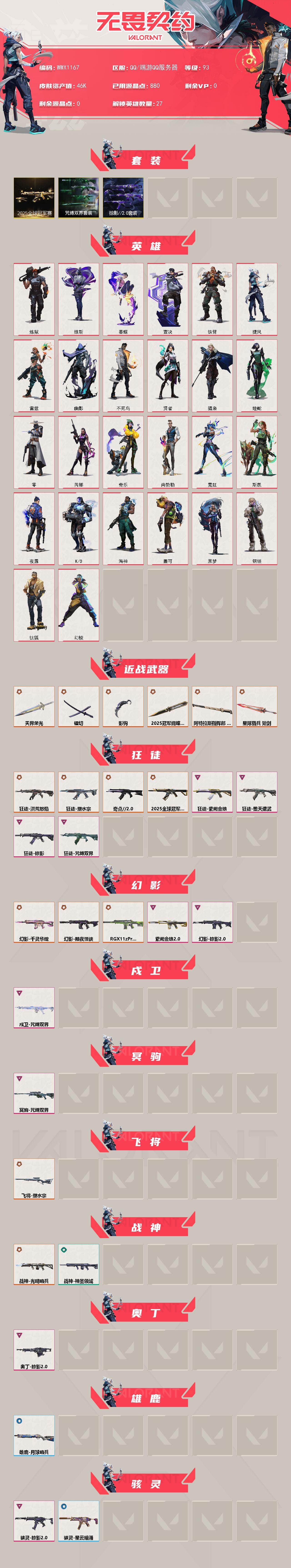 【wwx1167】终极18/卓越12/皮肤71/等级93/段位:未定级/2025全球冠军赛套装/咒缚双界套装/掠影//2.0套装/幻棱/炼狱/维斯/暮蝶/钛狐/壹决/铁臂/捷风/雷兹/幽影/不死鸟/贤者/猎枭/蝰蛇/零/芮娜/奇乐/尚勃勒/霓虹/斯凯/夜露/k/o/海神/盖可/黑梦/钢锁/近战武器-2025全球冠军赛 蝴蝶刀/近战武器-影钩/镭切/天界荣光/近战武器-阿特拉斯指挥部 甩
