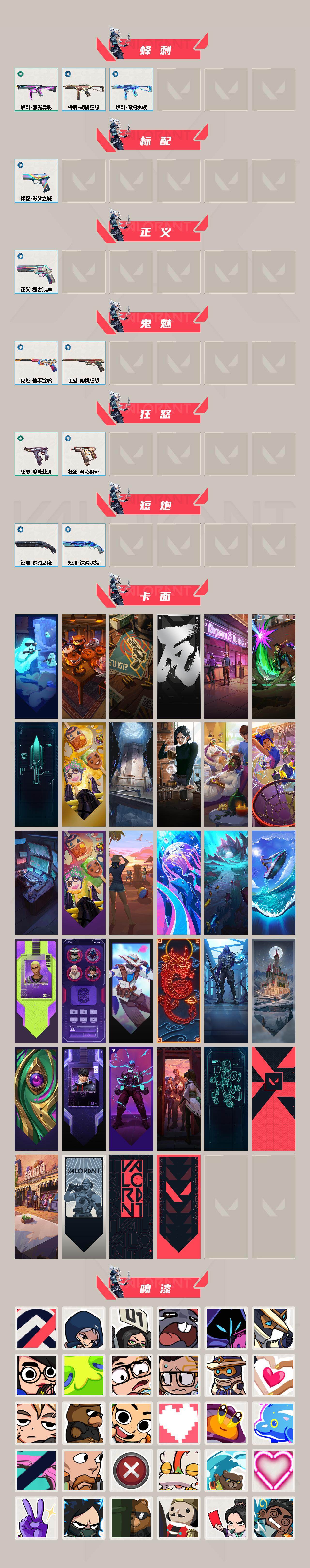 [16219384]【英雄】:幻棱,炼狱,暮蝶,钛狐,壹决,铁臂,捷风,雷兹,幽影,不死鸟,贤者,猎枭,蝰蛇,零,芮娜,奇乐,尚勃勒,霓虹,斯凯,k/o,盖可,黑梦,钢锁 【近战武器】:近战武器-侦察力量 蝴蝶刀,近战武器-珍珠棘贝 短剑,近战武器-机动狂飙 战刀,近战武器-圣石匕首 【狂徒】:狂徒-偃月苍龙,狂徒-弧光异彩 【幻影】:幻影-紫阙金琅//2.0,幻影-珍珠棘贝 【戍卫】:戍卫-珍珠棘贝,戍卫-彩梦之城 【獠犬】:獠犬-复古浪潮 【冥驹】:冥驹-复古浪潮 【飞将】:飞将-沙尘幻旅 【莽侠】:莽侠-深海水族 【战神】:战神-深海水族 【奥丁】:奥丁-信手涂鸦 【判官】:判官-萌彩剪影 【雄鹿】:雄鹿-彩梦之城,雄鹿-复古浪潮 【骇灵】:骇灵-沙尘幻旅,骇灵-珍珠棘贝,骇灵-信手涂鸦 【蜂刺】:蜂刺-弧光异彩,蜂刺-胡桃狂想,蜂刺-深海水族 【标配】:标配-彩梦之城 【正义】:正义-复古浪潮 【鬼魅】:鬼魅-胡桃狂想,鬼魅-信手涂鸦 【狂怒】:狂怒-珍珠棘贝,狂怒-萌彩剪影 【短炮】:短炮-梦魇恶魔,短炮-深海水族 【卡面】:精灵大战 卡面,南瓜盛典 卡面,正义的化身 卡面,先瓦为敬 银色 卡面,梦幻奶茶 卡面,源能反应 卡面,零点嗅探设计图 卡面,终章:瓦娃脸雪糕 卡面,表象之下 卡面,虹吸式咖啡壶 卡面,源能者美容 卡面,脚踝终结者 卡面 ,夜班 卡面,瓦娃脸雪糕 卡面 ,沙雕爆能器 卡面,深海水族 卡面,珍珠棘贝 卡面,复古浪潮 卡面,盖可工牌 卡面,清除名单 卡面,无畏契约go!第一卷:零 卡面,龍记 卡面,暗呛 卡面,胡桃狂想 卡面,沙尘幻旅 卡面,壹决工牌 卡面,势不可挡//k/o 卡面,热烈欢迎 卡面,铁臂设计图 卡面,代号红色 卡面,冰淇淋店 卡面,新兵报到 卡面,v契约 卡面,无畏契约 卡面,暗潮 卡面 【喷漆】:控场勿近 喷漆,捷风差距 喷漆,我觉得不行 喷漆,我的刀呢? 喷漆,情绪控制 喷漆,哨卫滑步 喷漆,倒吸一口凉气 喷漆,uwu 喷漆,新潮流 喷漆,逮到一个 喷漆,一个人的孤岛 喷漆,双人比心 喷漆,不予置评 喷漆,三熊合一 喷漆,要喝完噢! 喷漆,双击点赞 喷漆,珍珠棘贝 喷漆,深海水族 喷漆,禁止标配 喷漆 ,铁臂尴尬 喷漆,买装还是存钱 喷漆,醒狮贺春 喷漆,酷熊冲浪 喷漆,蕊形灯 喷漆,沙尘幻旅 喷漆,电烫 喷漆,暗中偷瞄 喷漆,胡桃