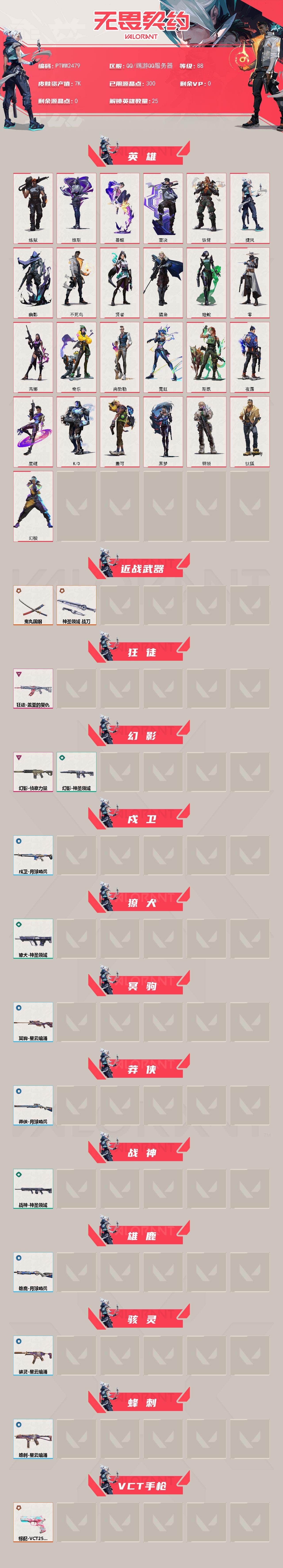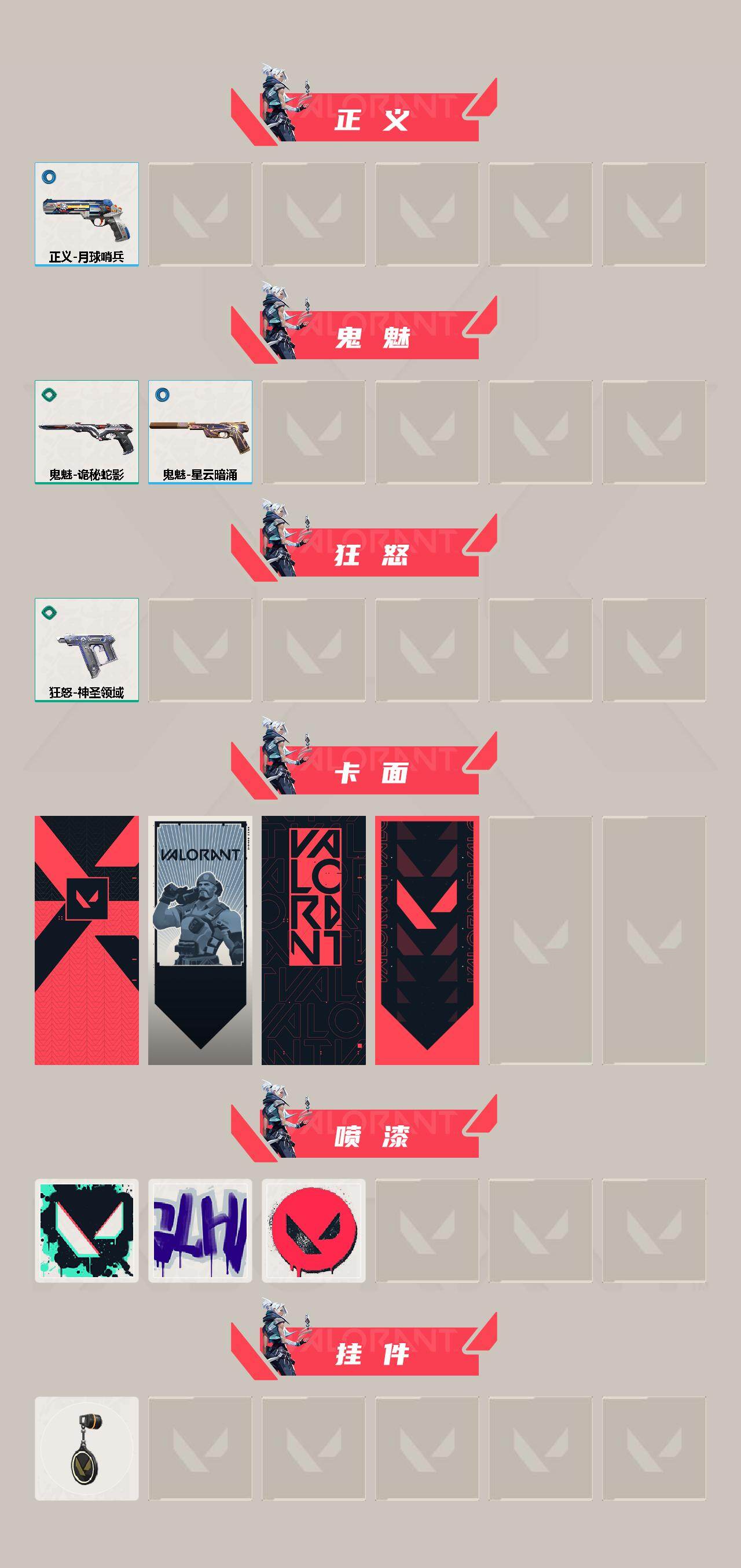 【英雄】:幻棱,炼狱,维斯,暮蝶,钛狐,壹决,铁臂,捷风,幽影,不死鸟,贤者,猎枭,蝰蛇,零,芮娜,奇乐,尚勃勒,霓虹,斯凯,夜露,星礈,k/o,盖可,黑梦,钢锁 【近战武器】:近战武器-鬼丸国纲,近战武器-神圣领域 战刀 【狂徒】:狂徒-盖亚的复仇 【幻影】:幻影-侦察力量,幻影-神圣领域 【戍卫】:戍卫-月球哨兵 【獠犬】:獠犬-神圣领域 【冥驹】:冥驹-星云暗涌 【莽侠】:莽侠-月球哨兵